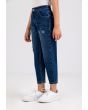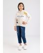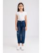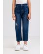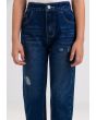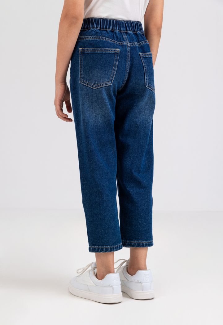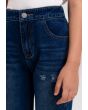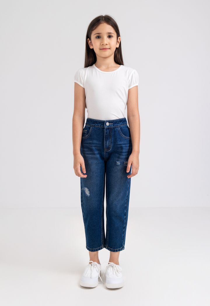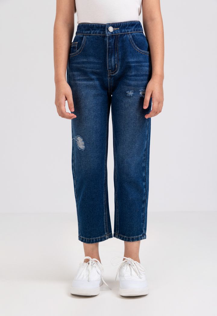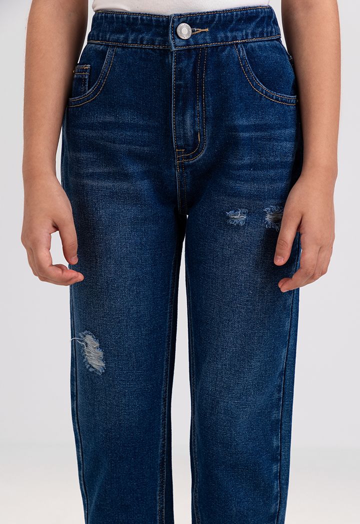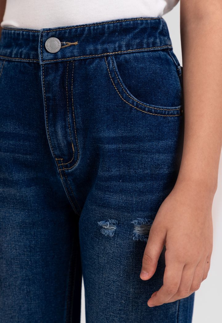 A pair of ripped denim jeans that feature a comfortable skinny leg design.