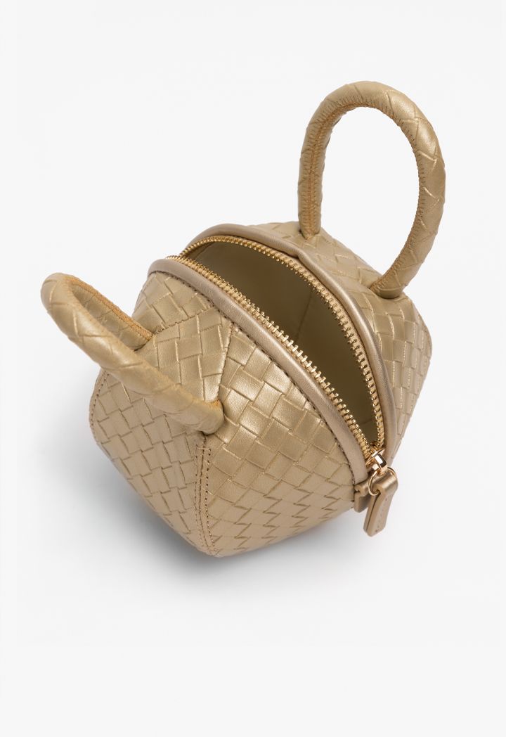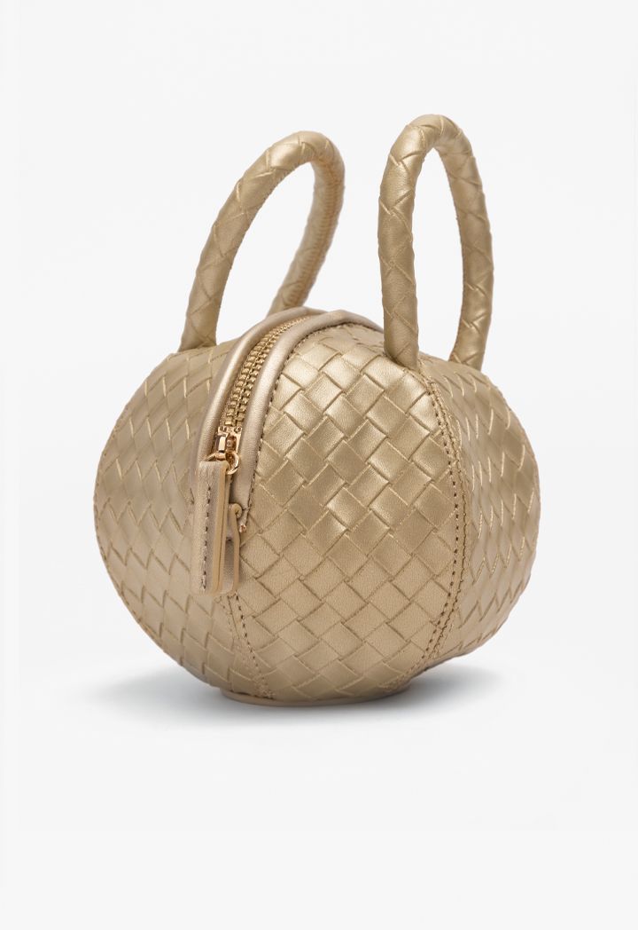 A metallic crossbody bag that features a unique round ball intricate woven design.