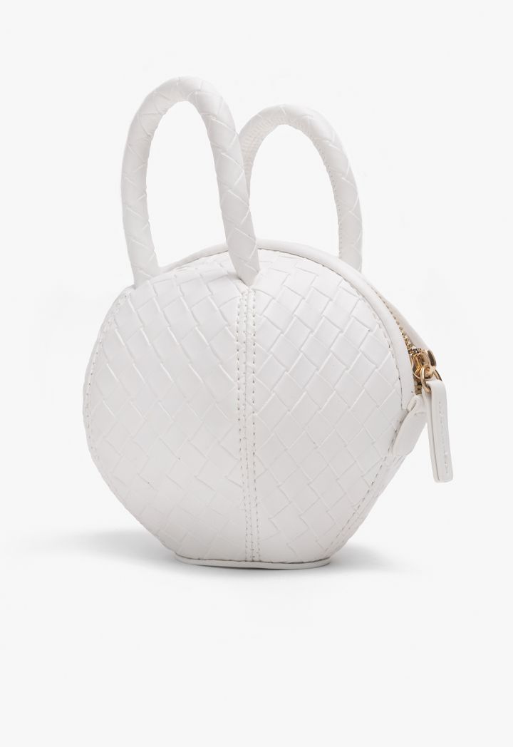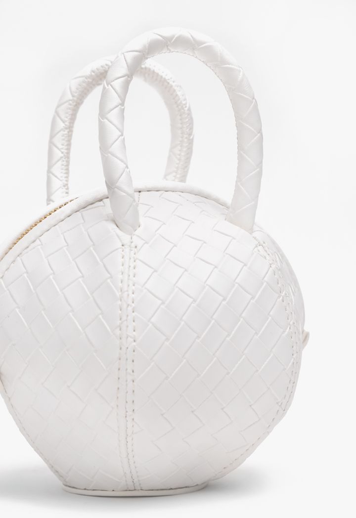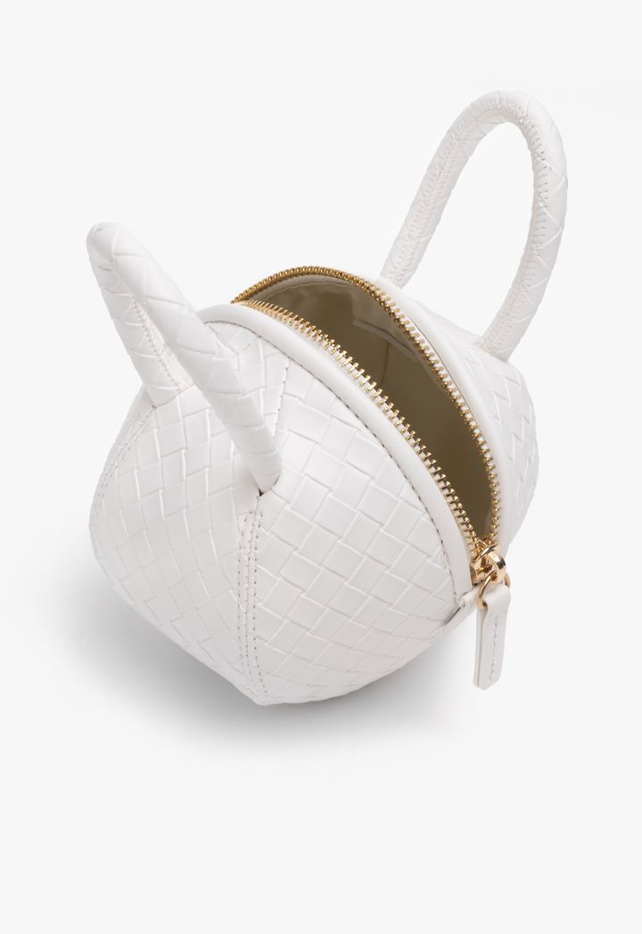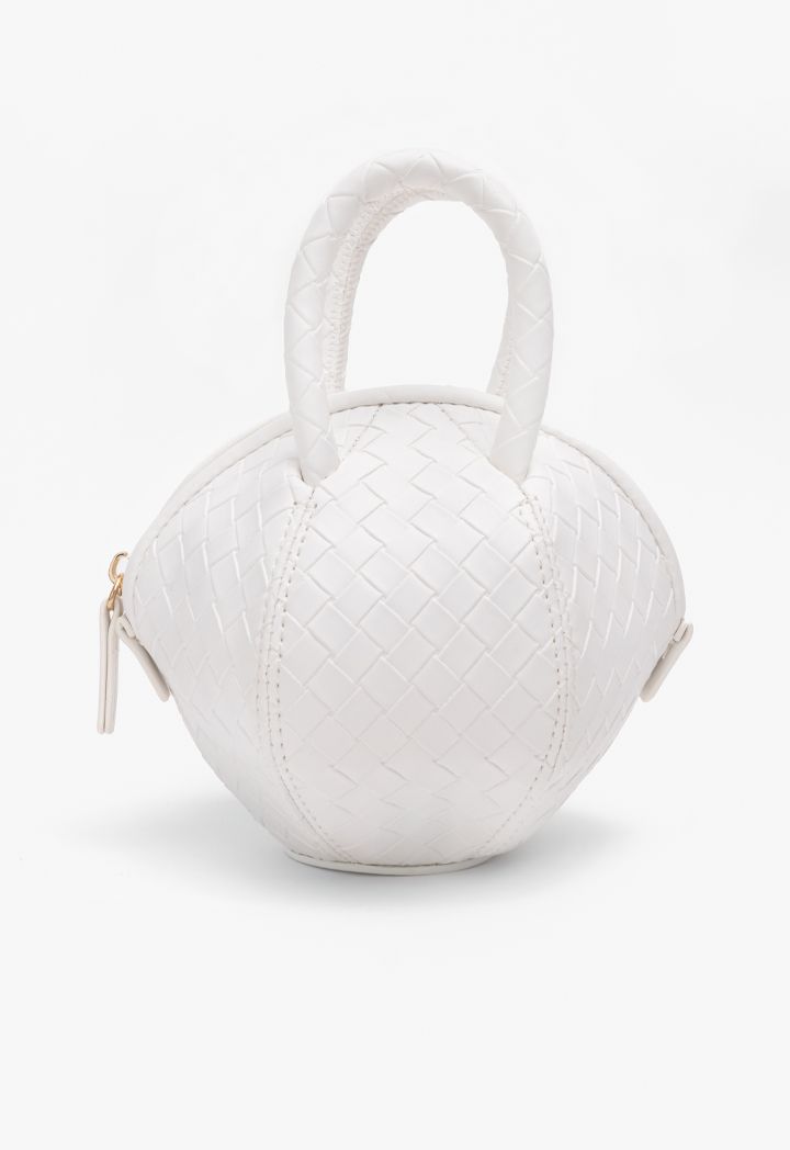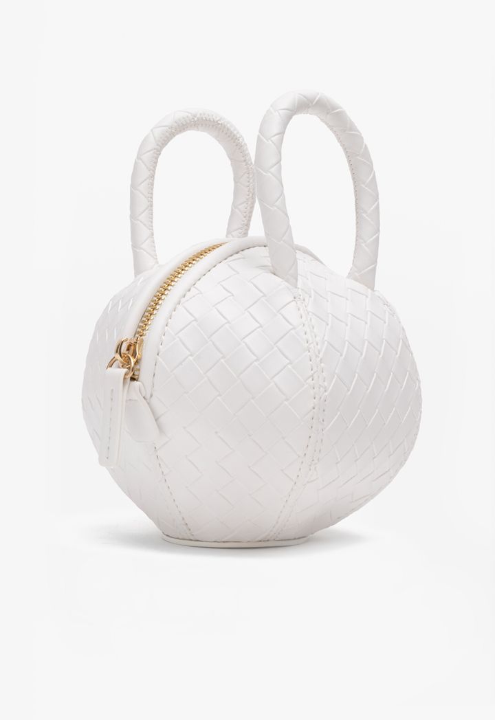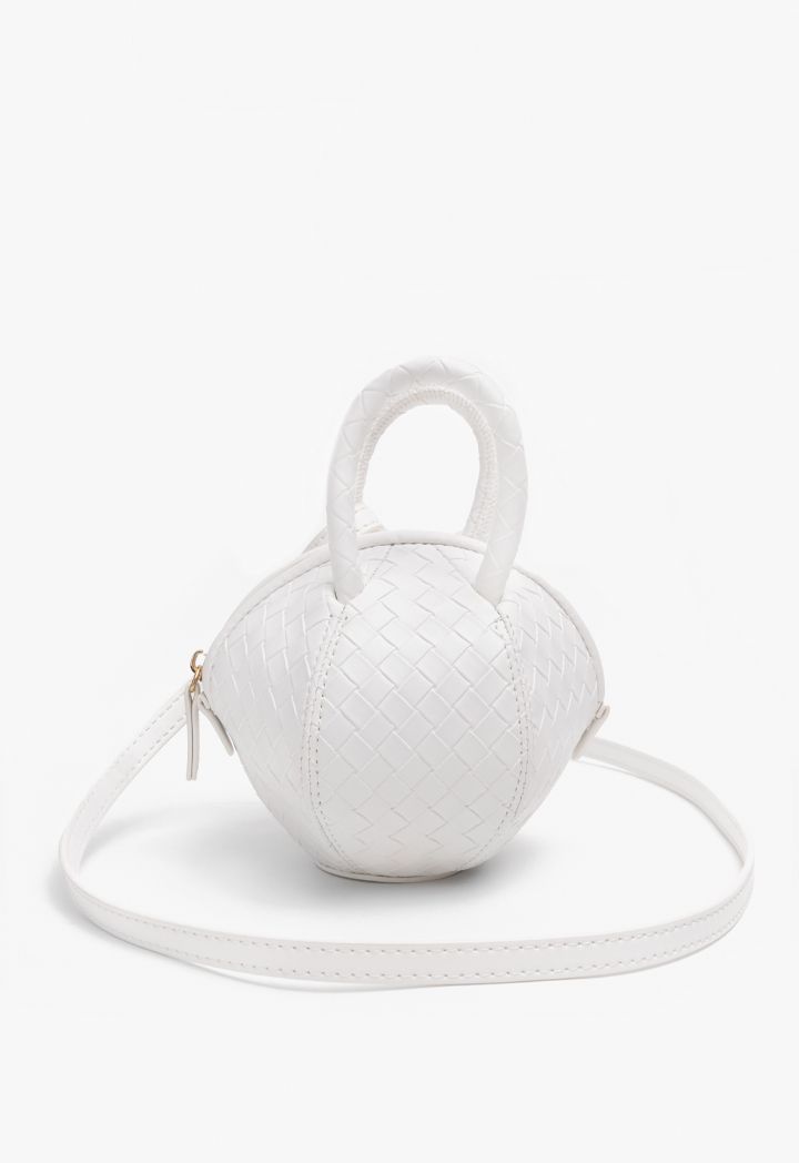 A metallic crossbody bag that features a unique round ball intricate woven design.