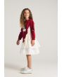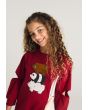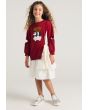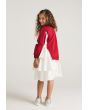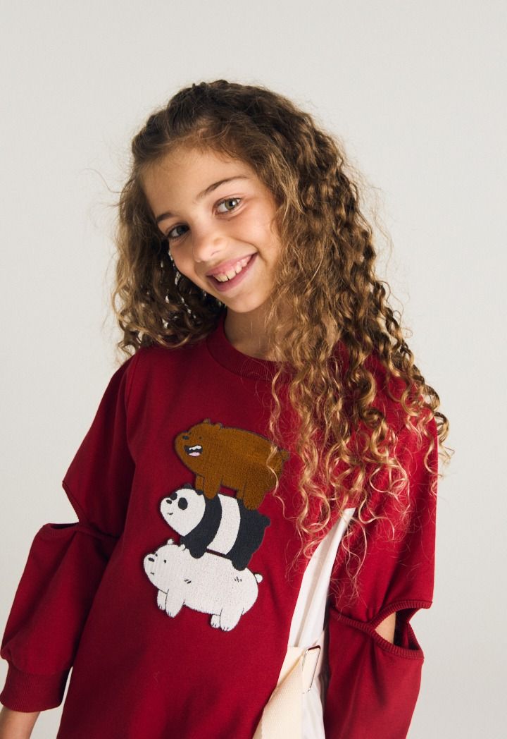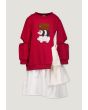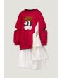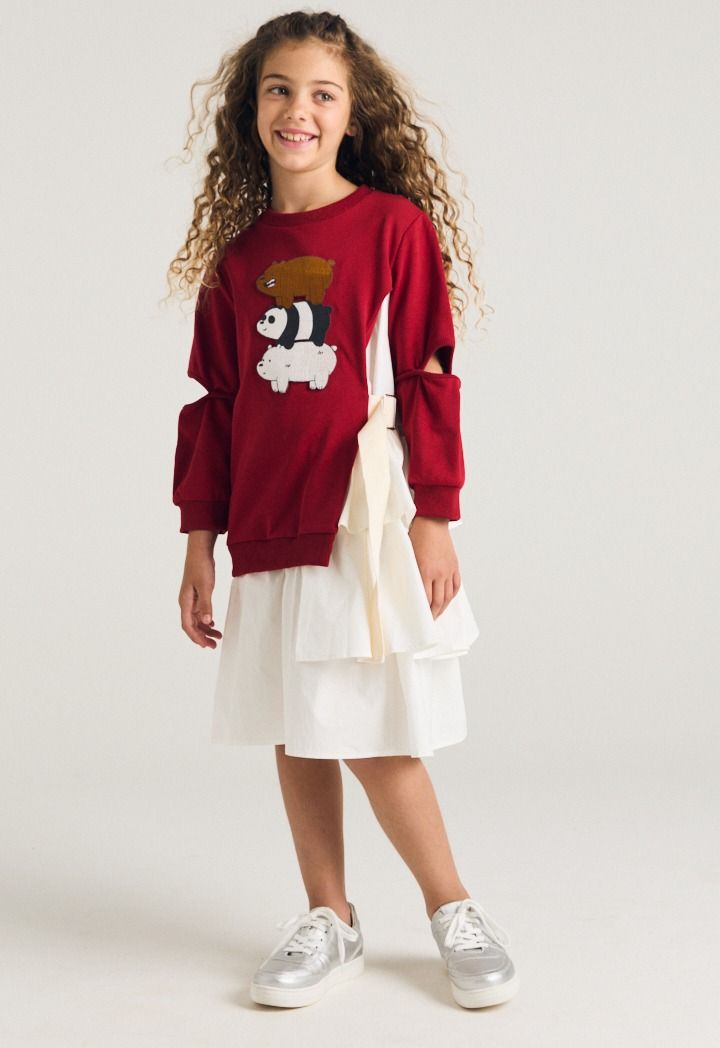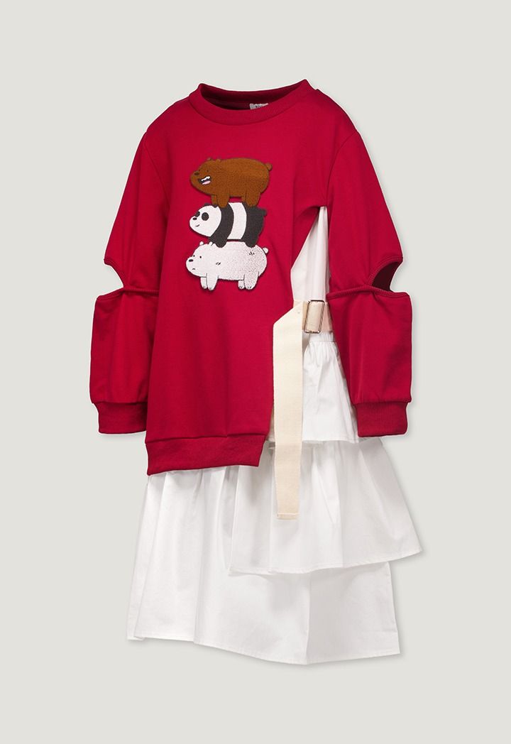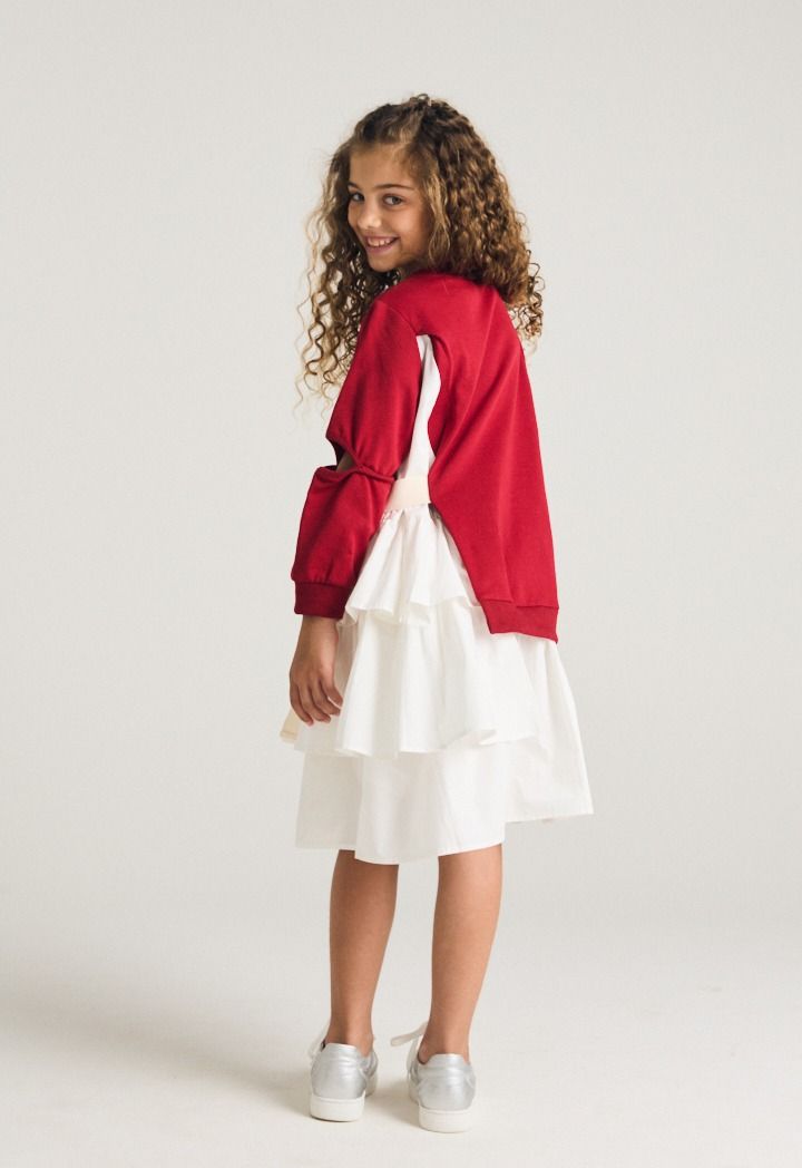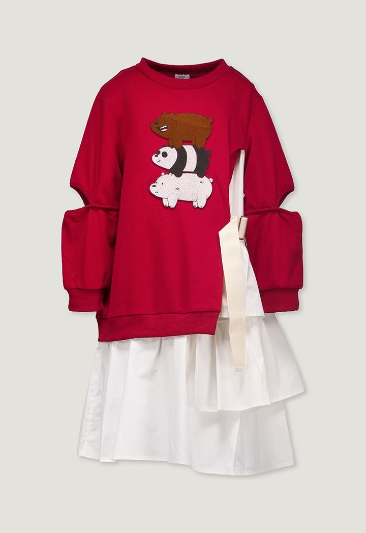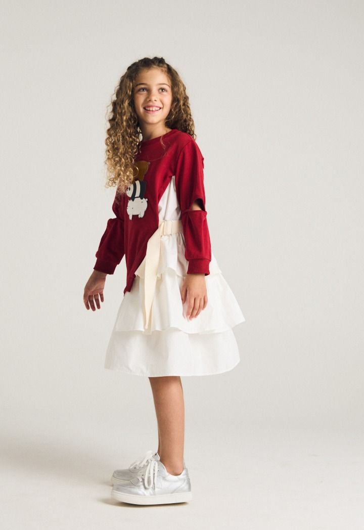 A modern sweatshirt dress that features a knitted rubber print bodice and a ruffled skirt.