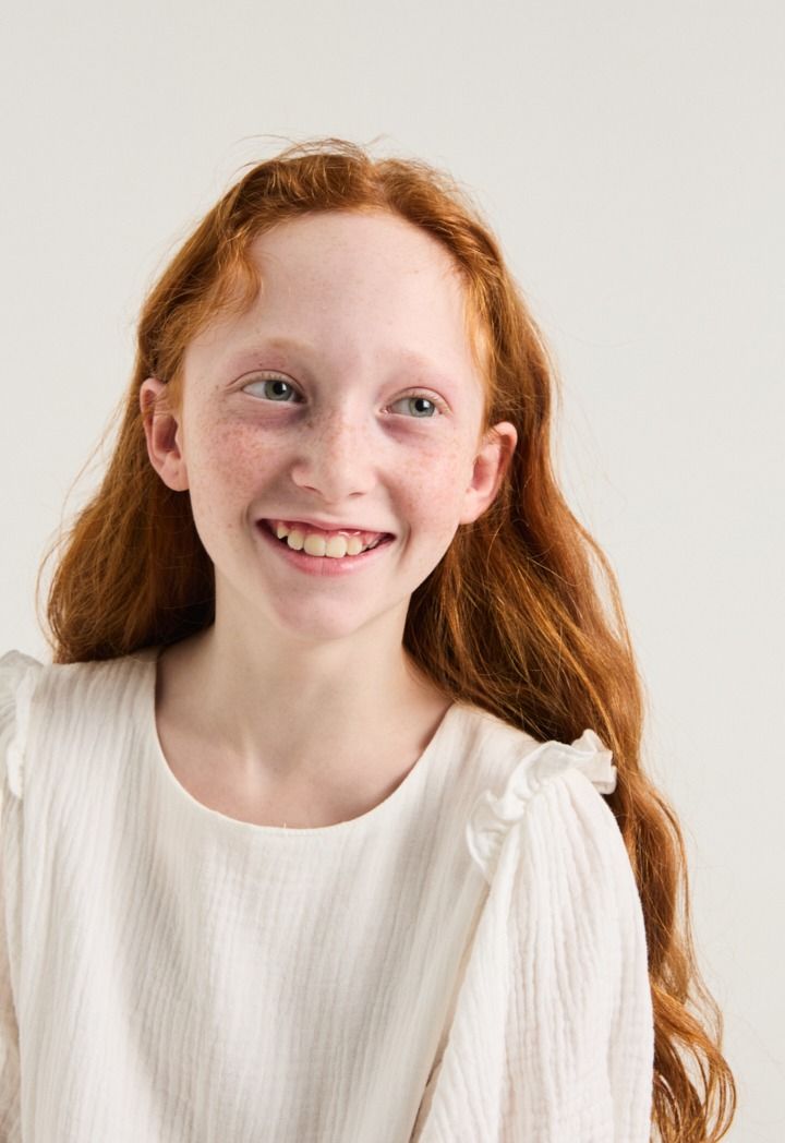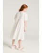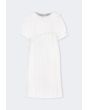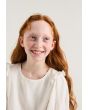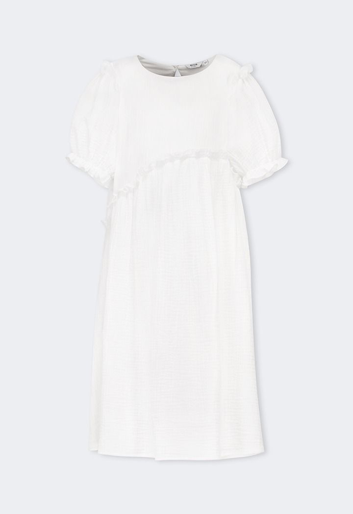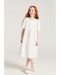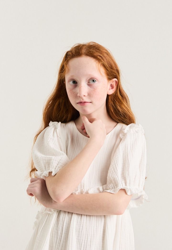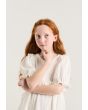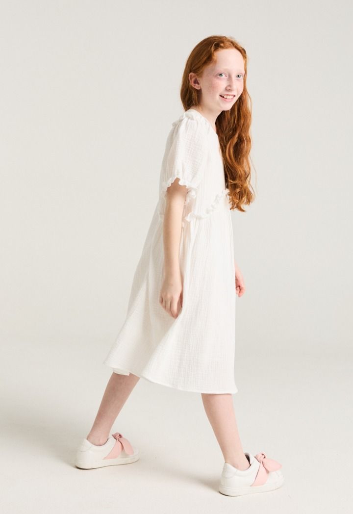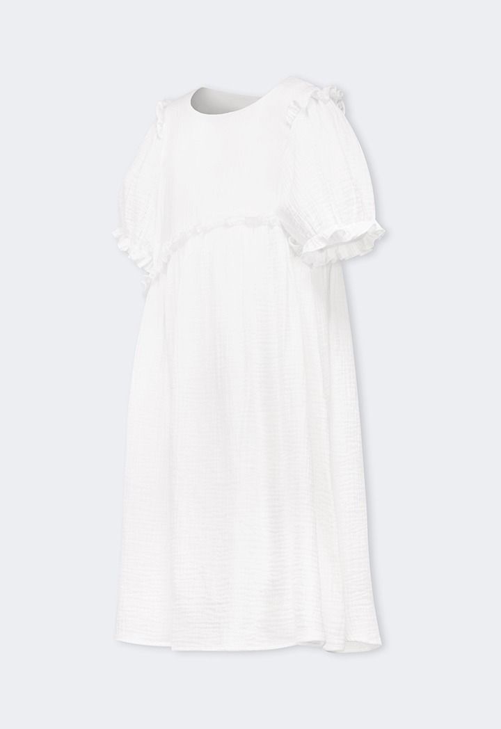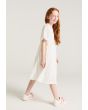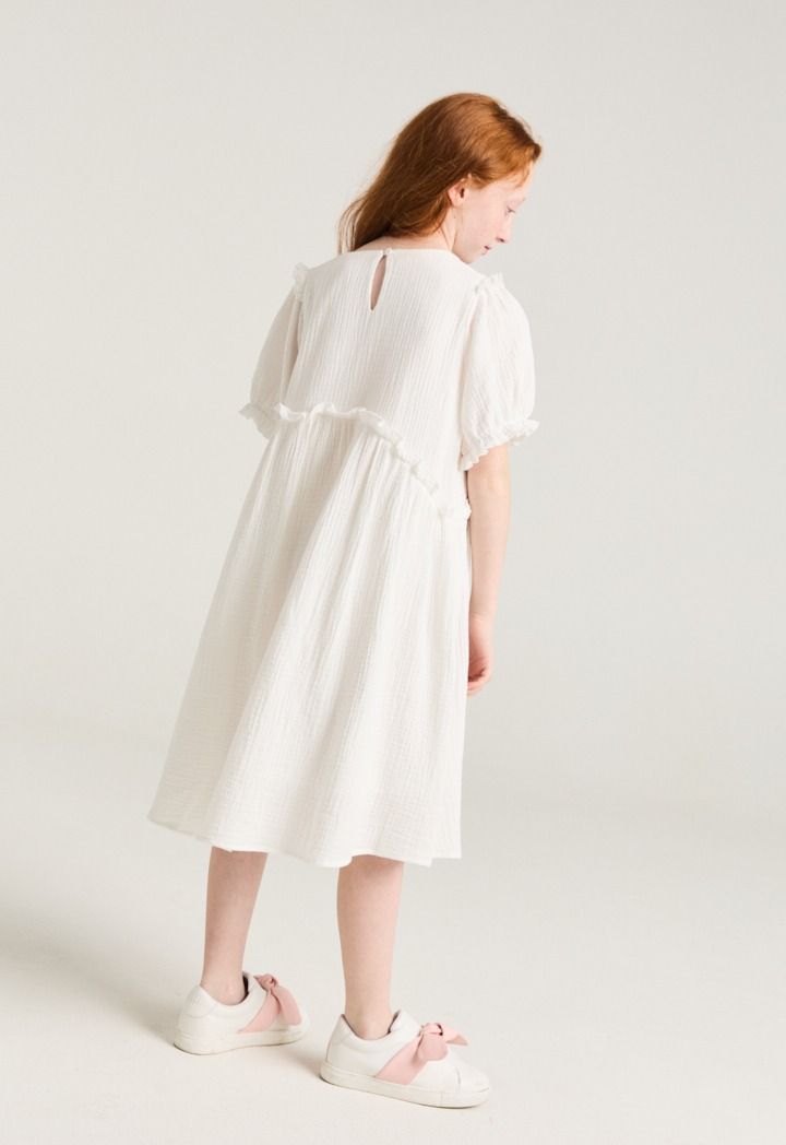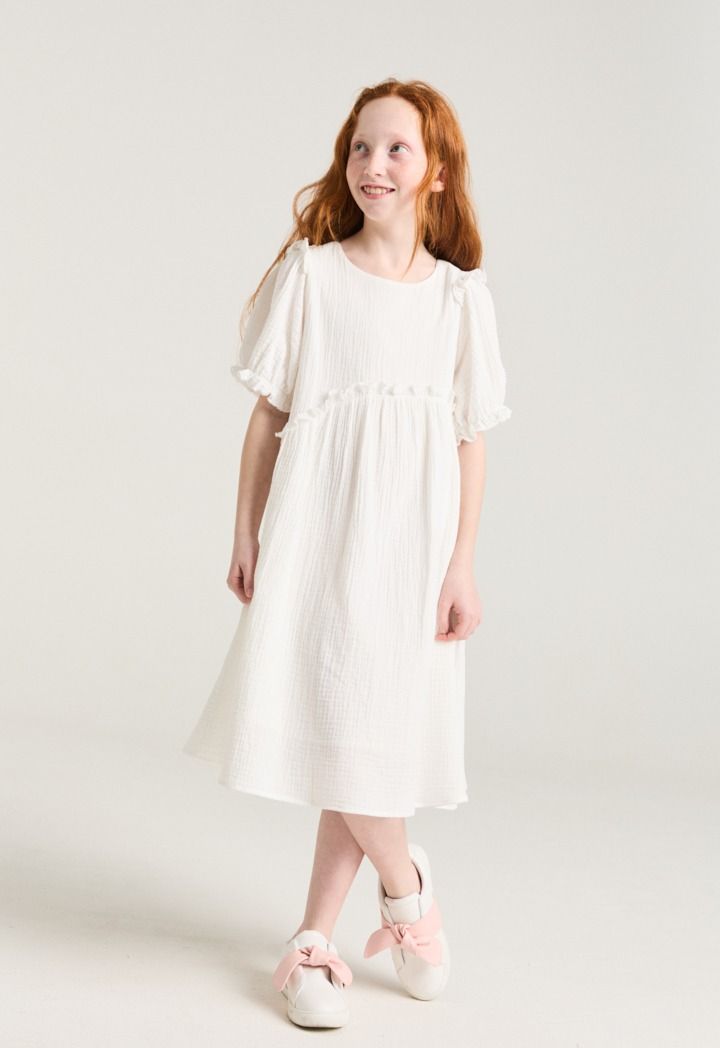 A kids' dress with textured fabric and an asymmetrical waist, a unique design that adds elegance and comfort.