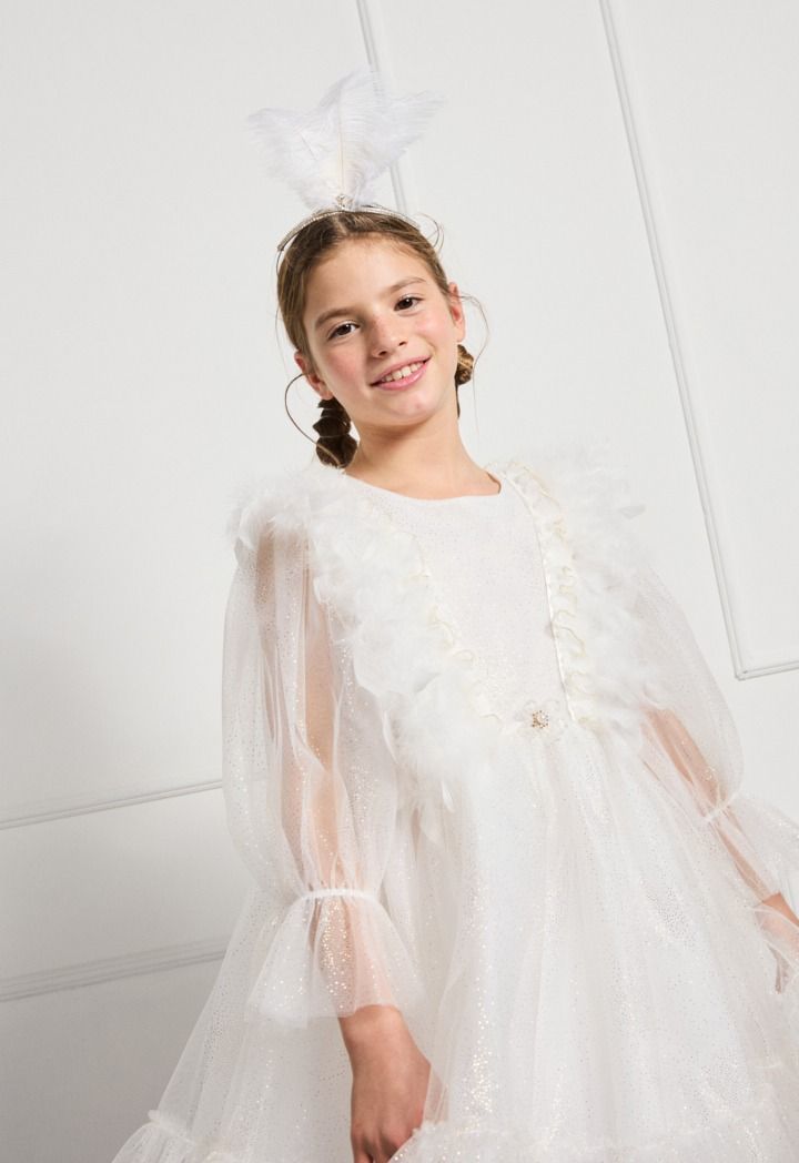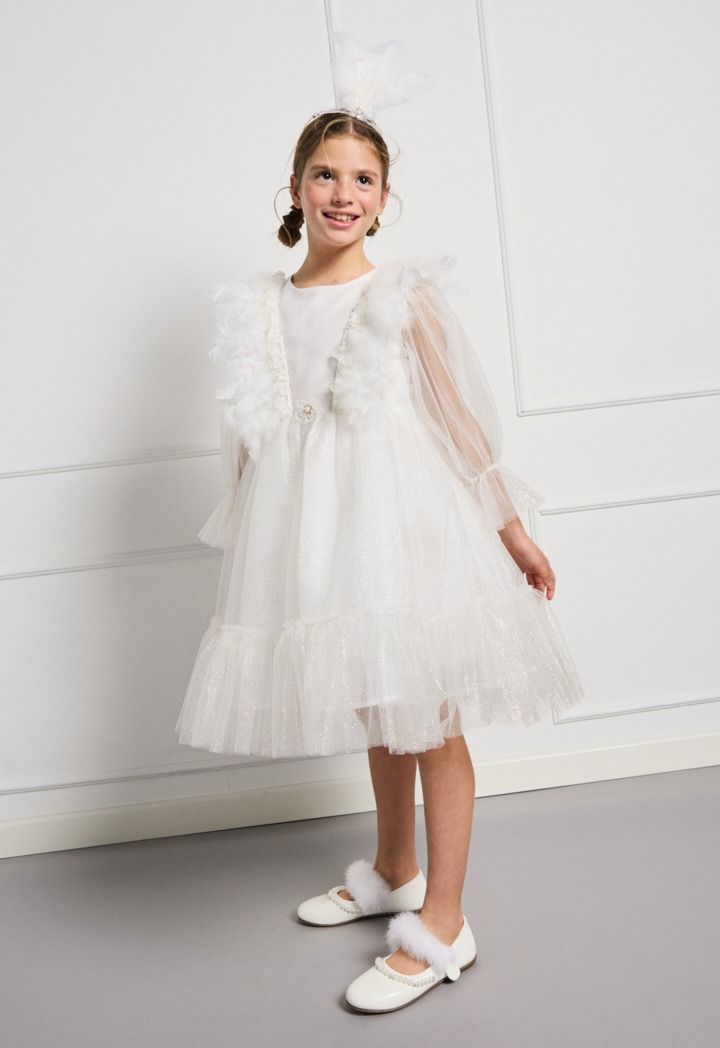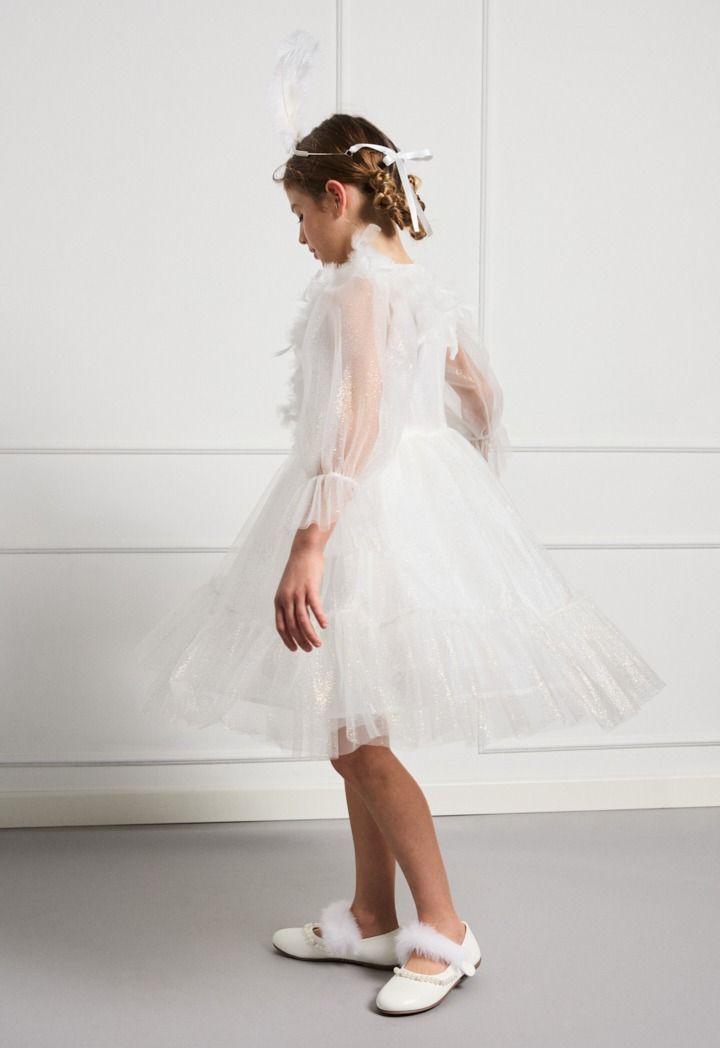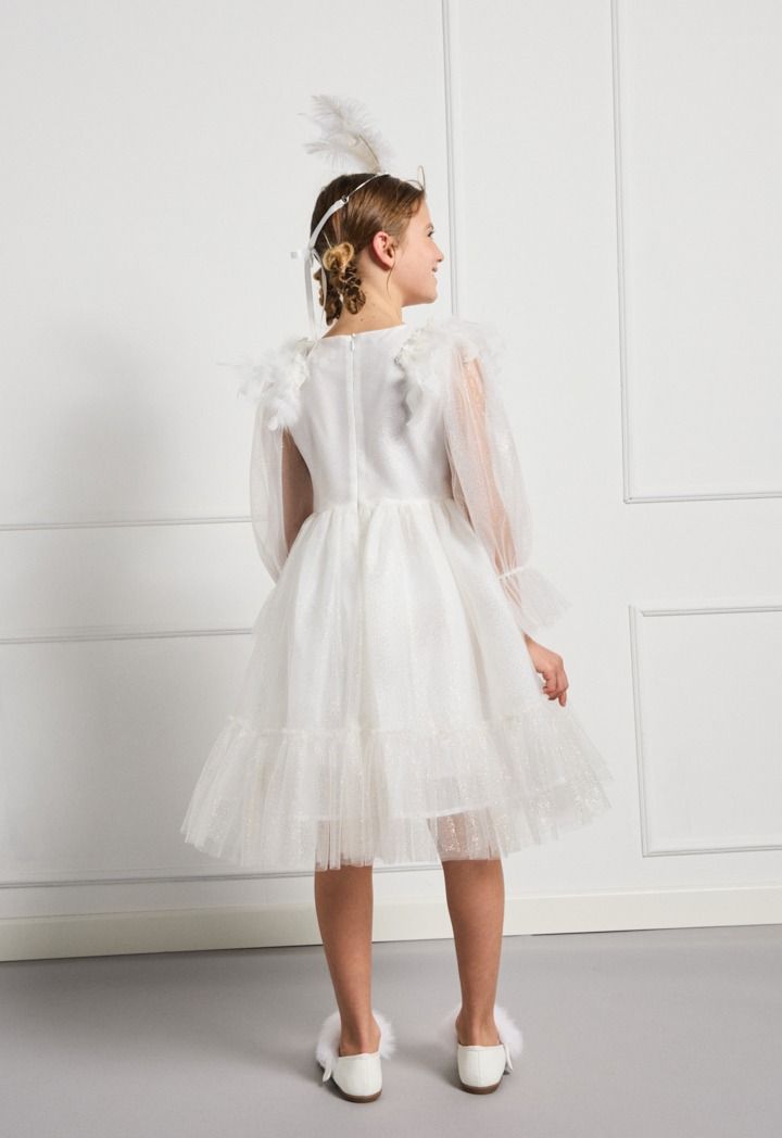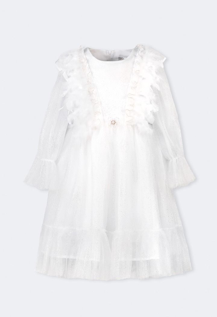 Introduce your girl to the world of fashion by wearing this exquisitely designed dress with its neckline details of faux feather.