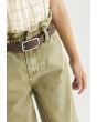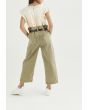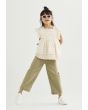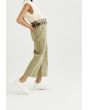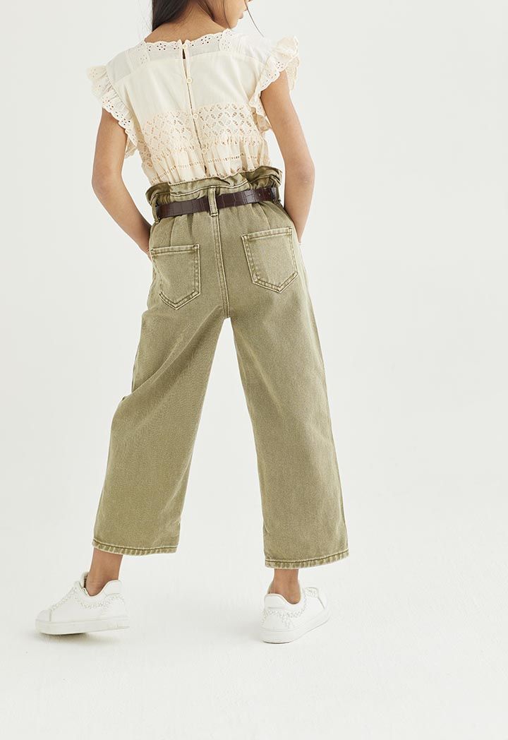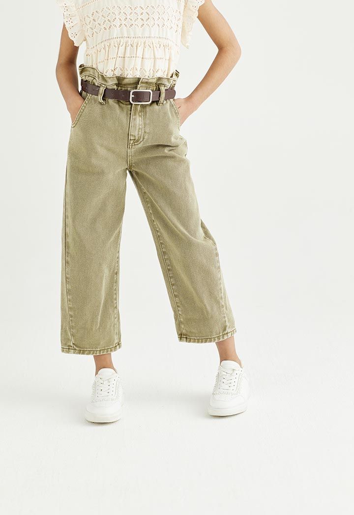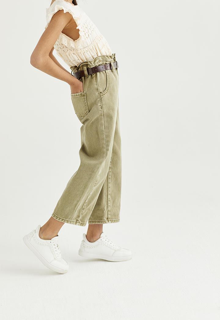 A solid pair of jeans made with durable denim featuring a stylish ruffled waist design.