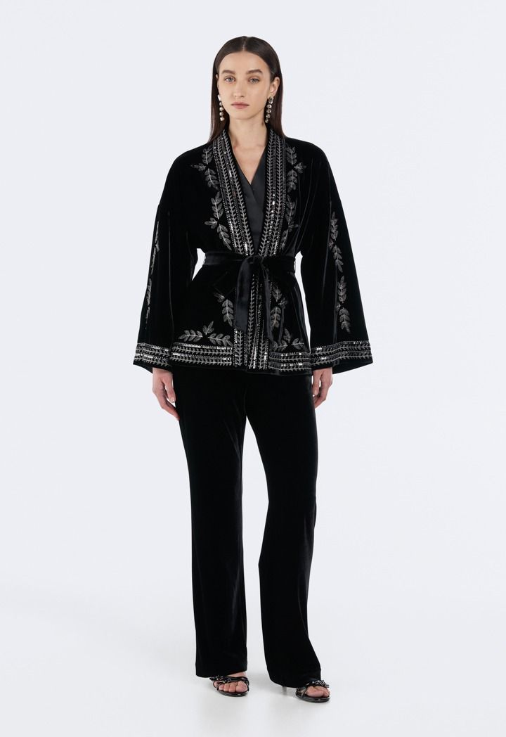 Shimmer with every move, Sequin and Beaded Velvet Kimono adds glamour to your evenings.