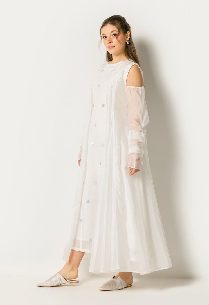 This dress is made of soft organza with scattered shiny dots for a light, dreamy sparkle that feels special yet effortless to wear.