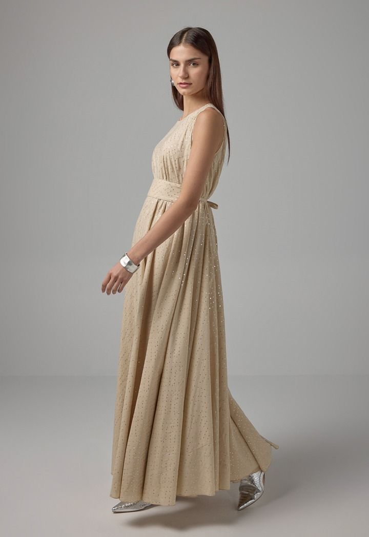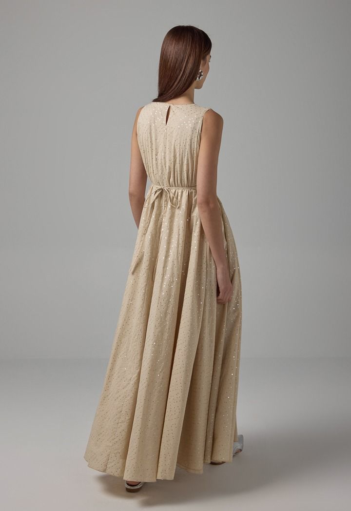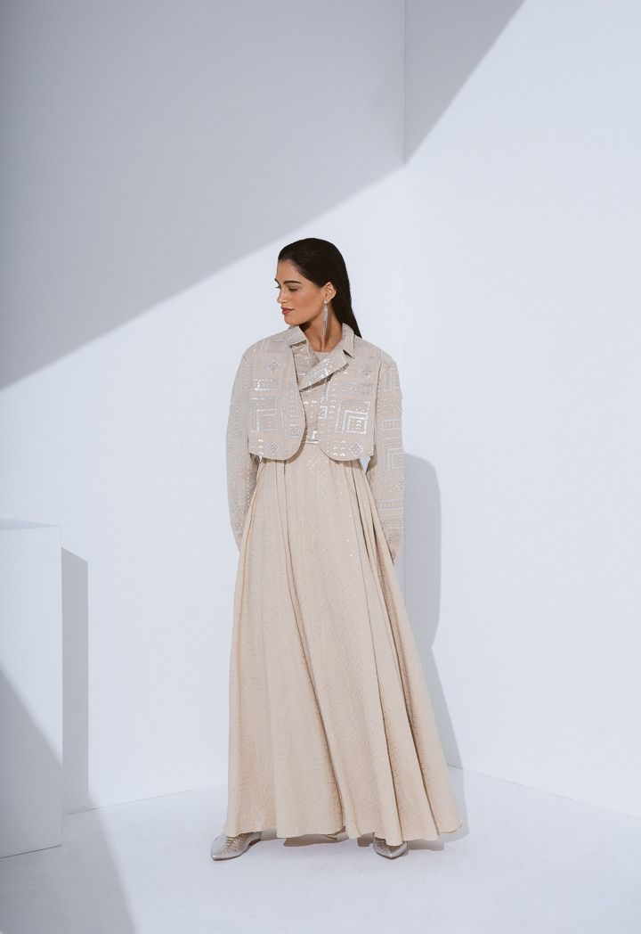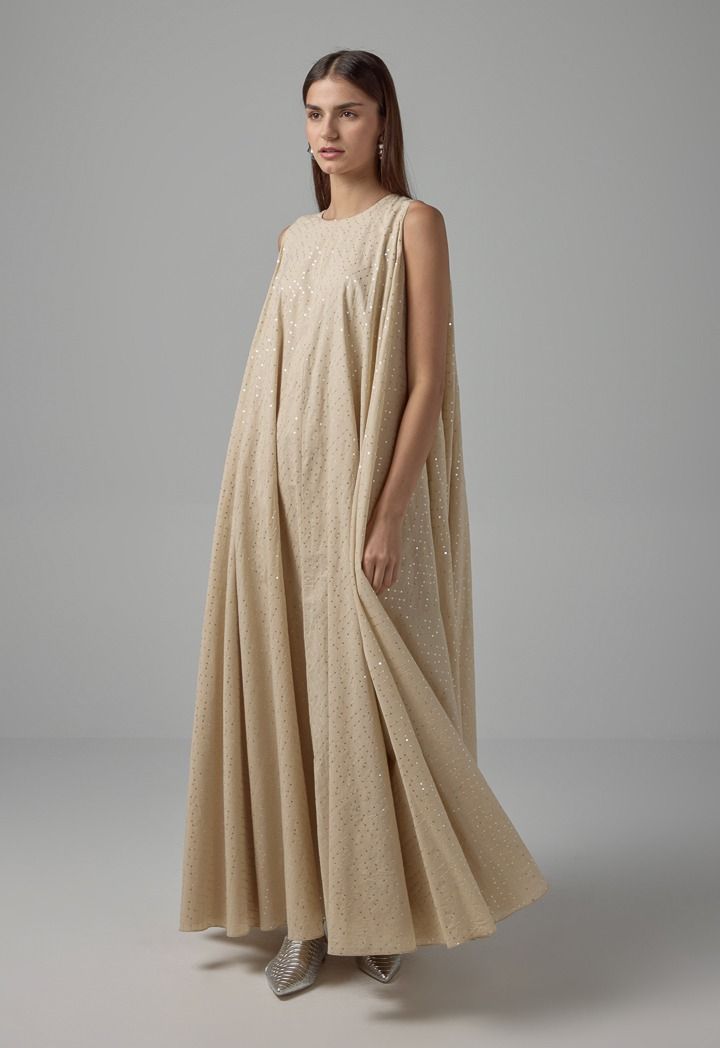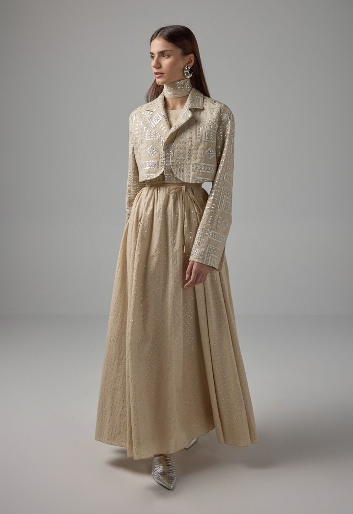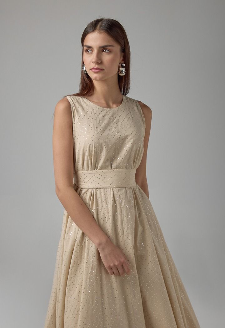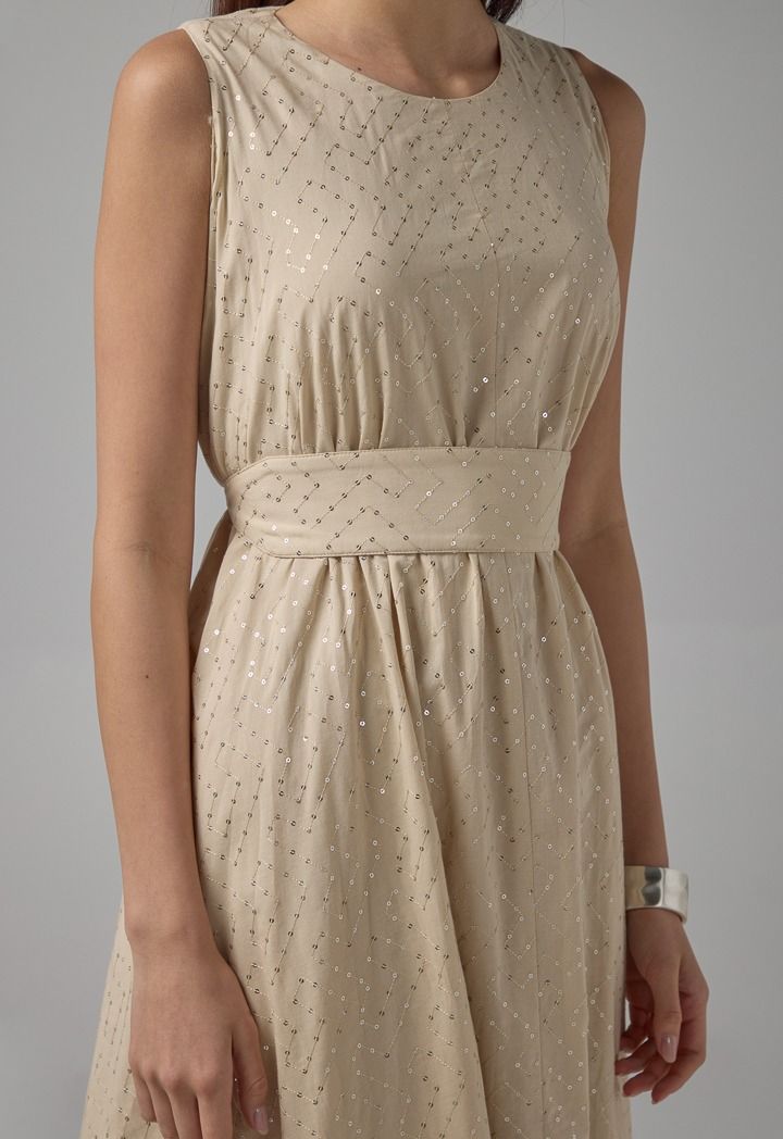 Design: Solid, Sequin, Attached Lining, Flared, Oversize, Self Fabric Belt, Stitched Details