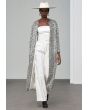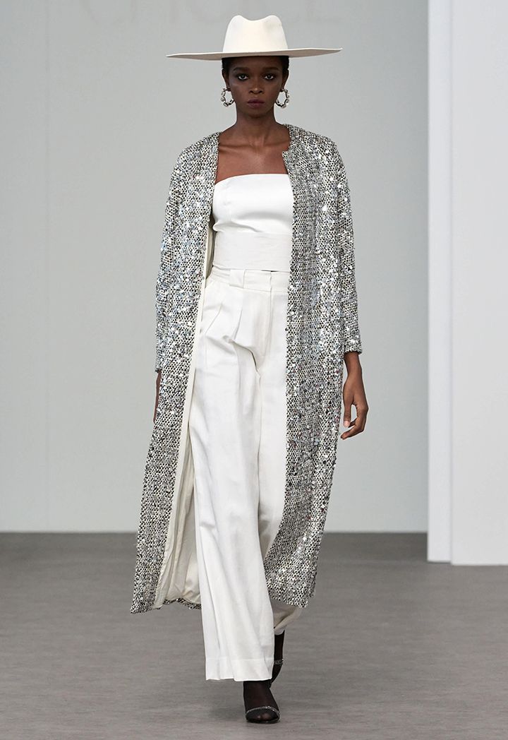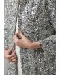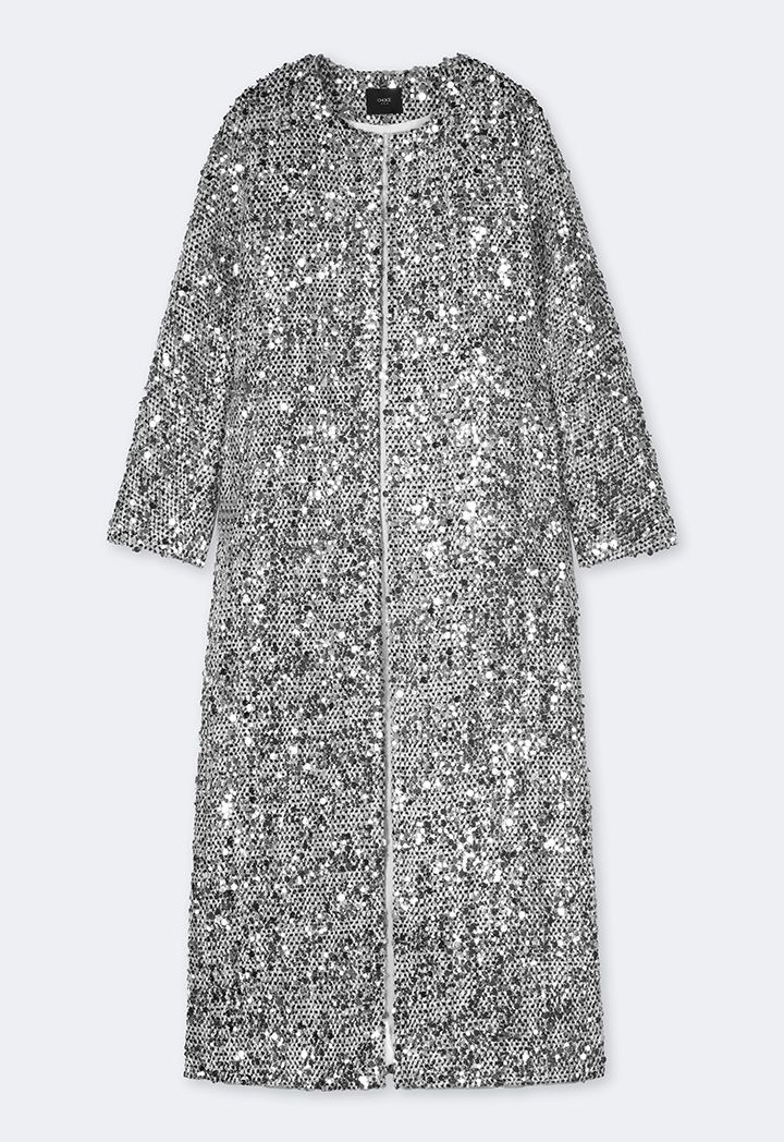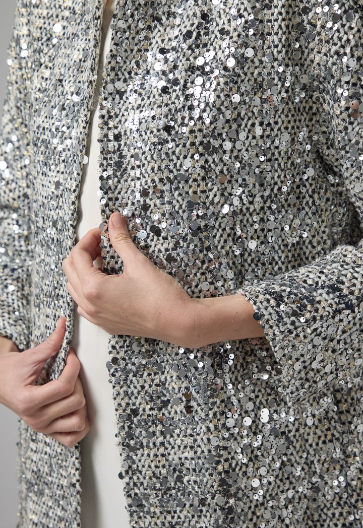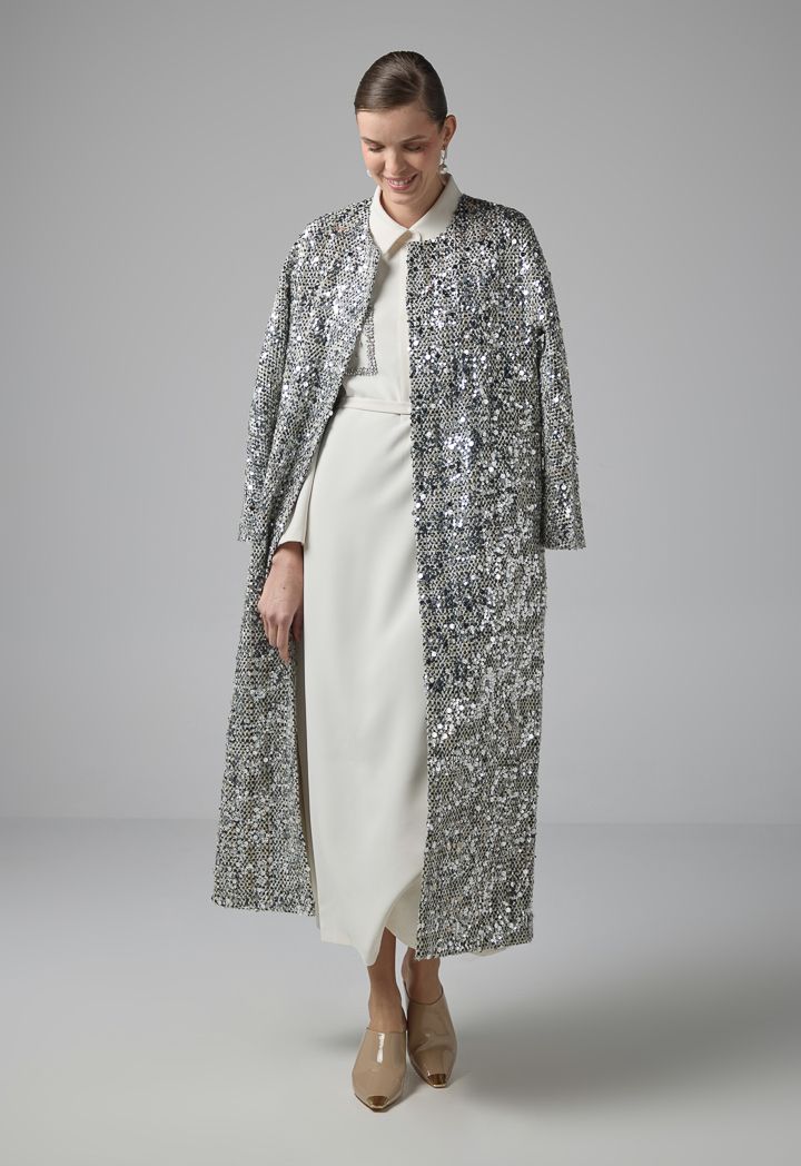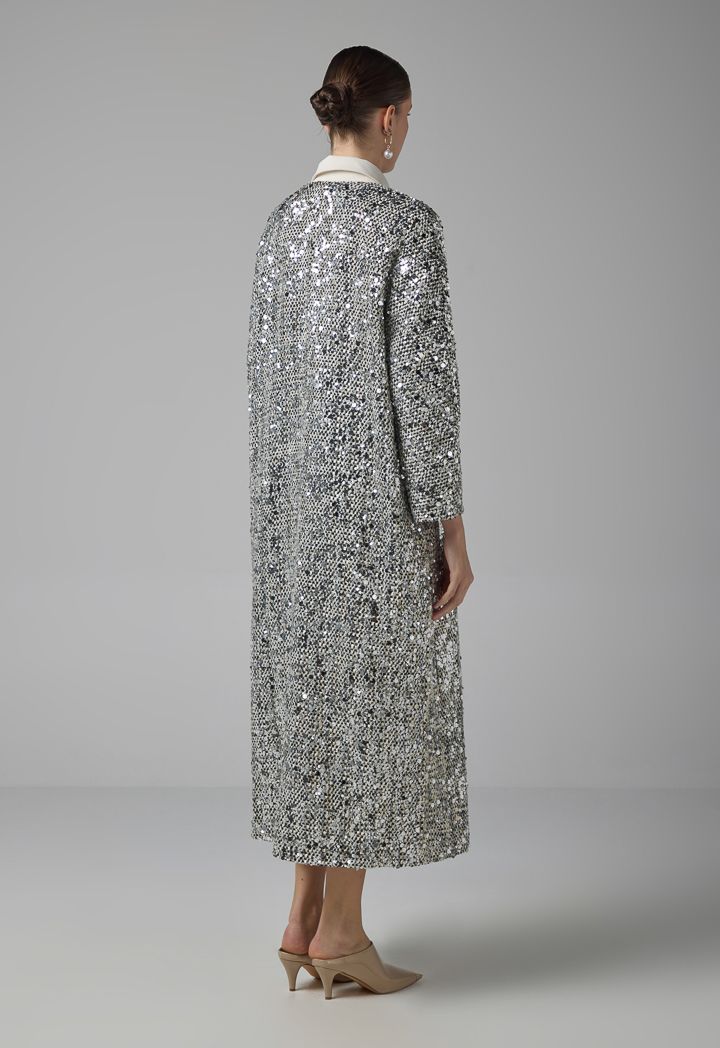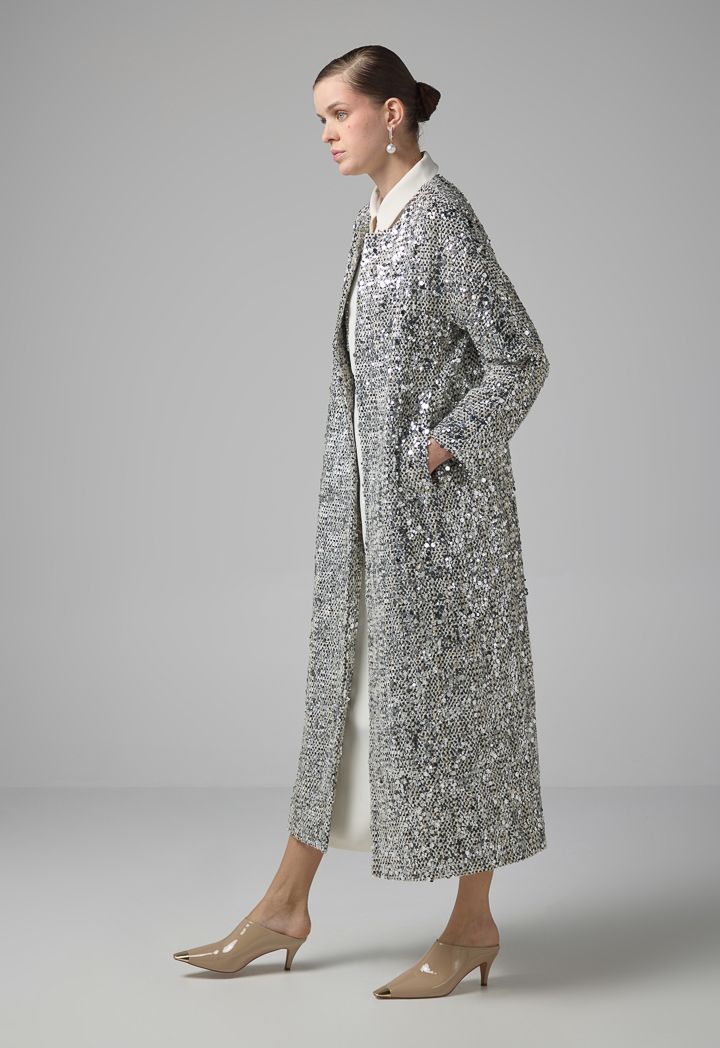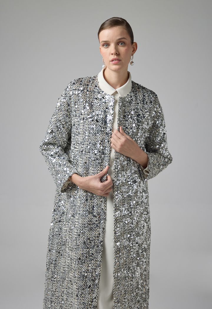 This chic coat with shimmering sequin embellishments, offering a modern twist on timeless elegance.