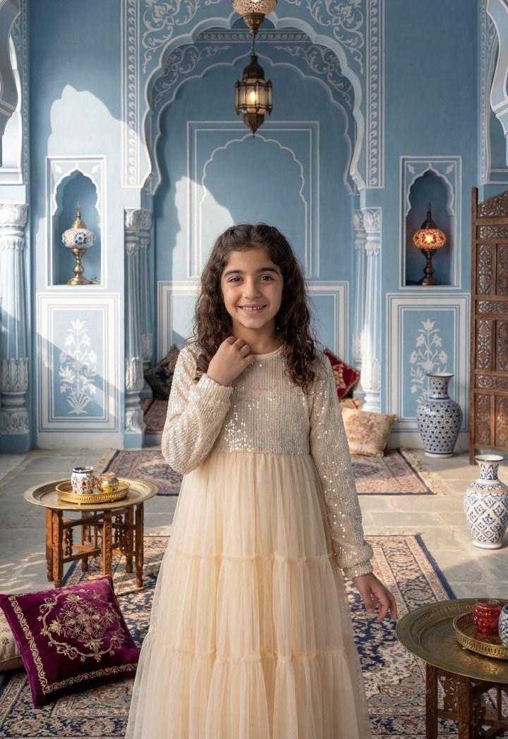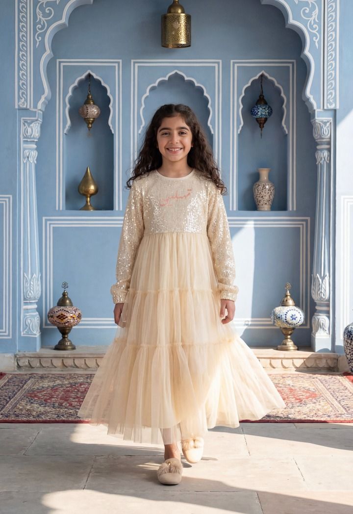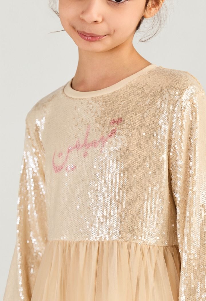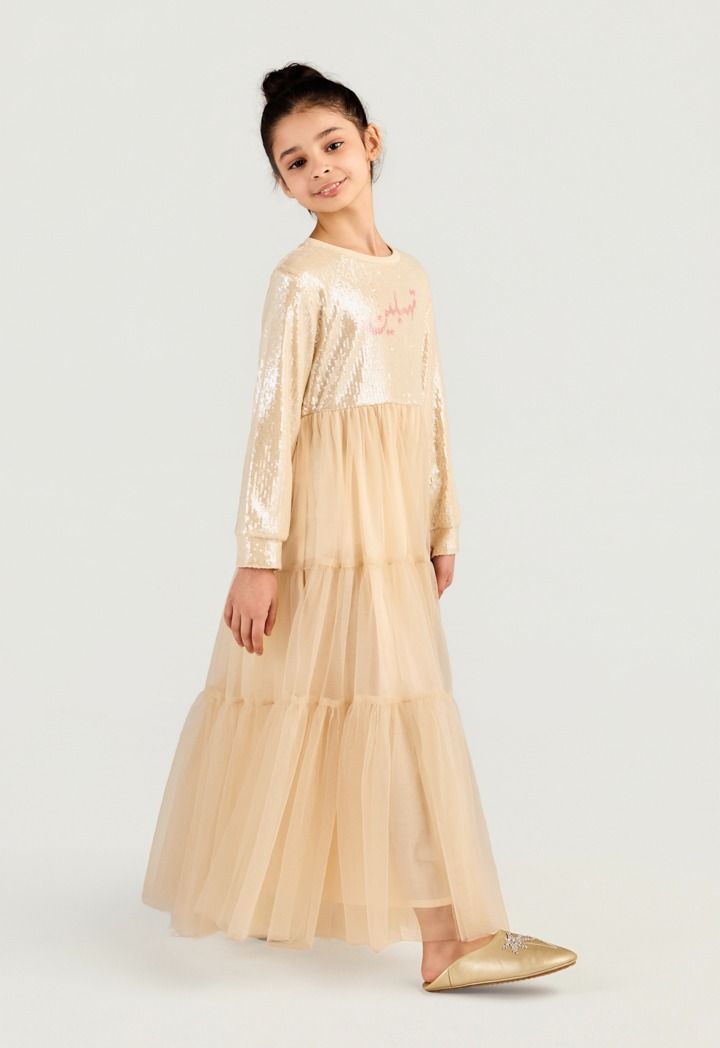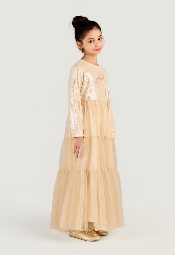 Let her shine in this sparkly sequin dress with a tiered tulle skirt and cute" Tehblin" slogan for a fun Ramadan look.