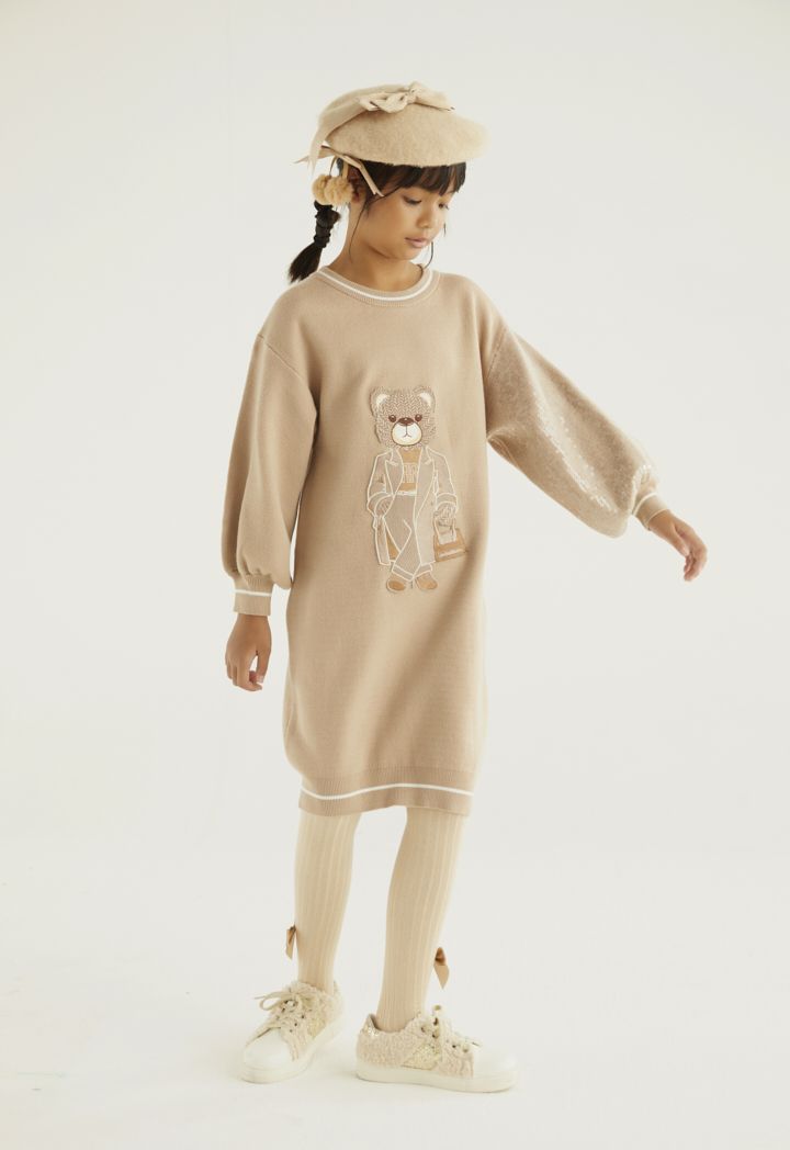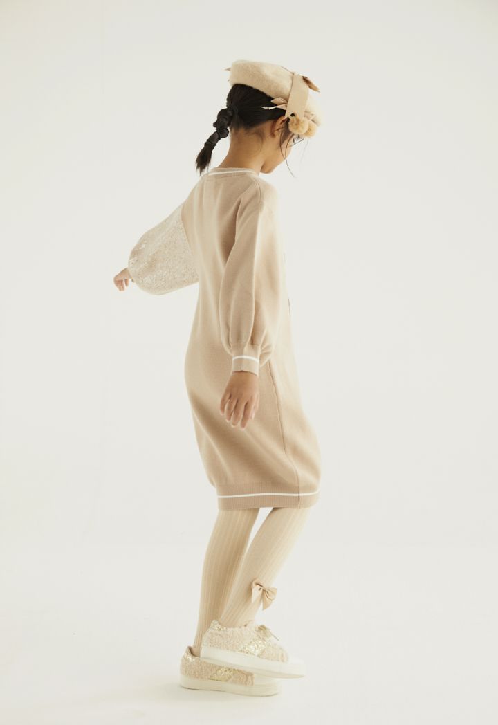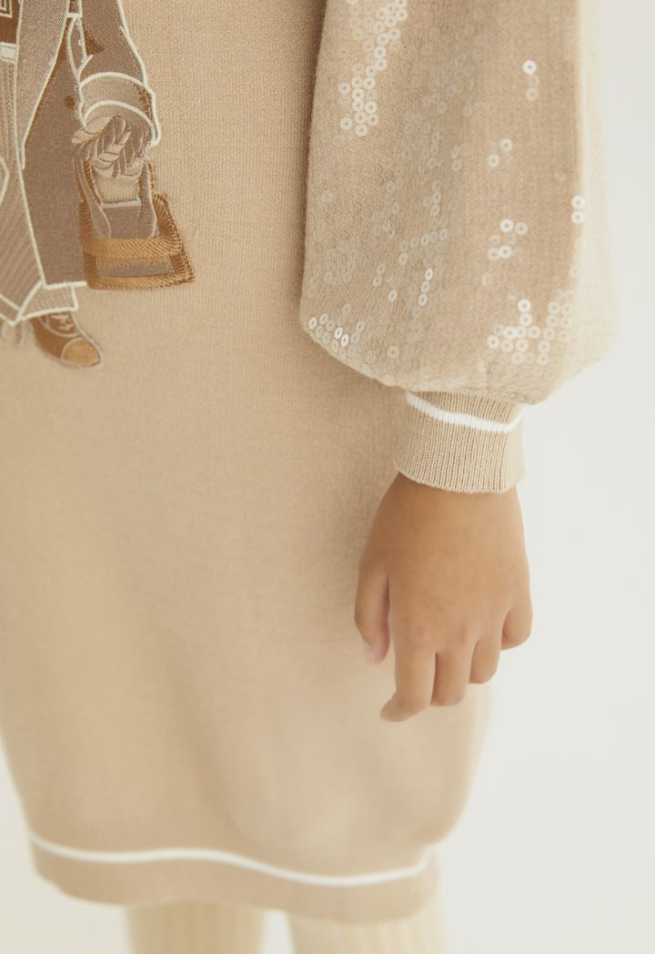 A knitted sweater dress that features an embroidered bodice and a sequined sleeve.