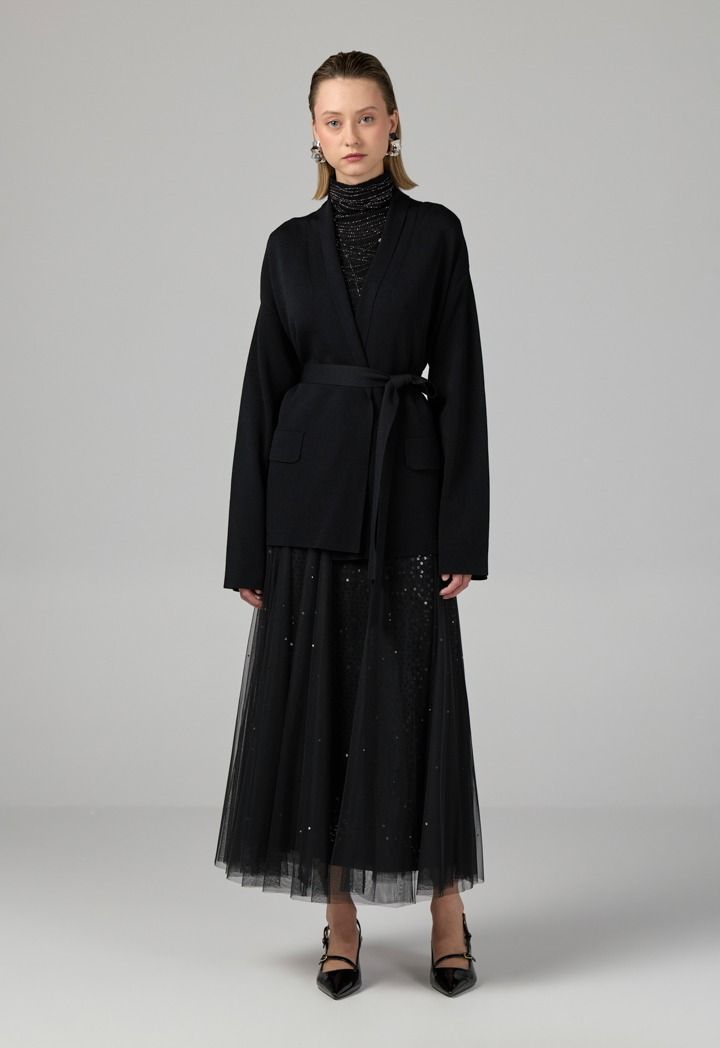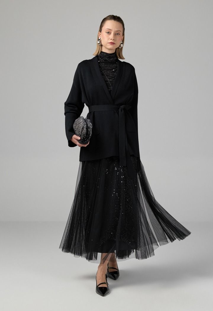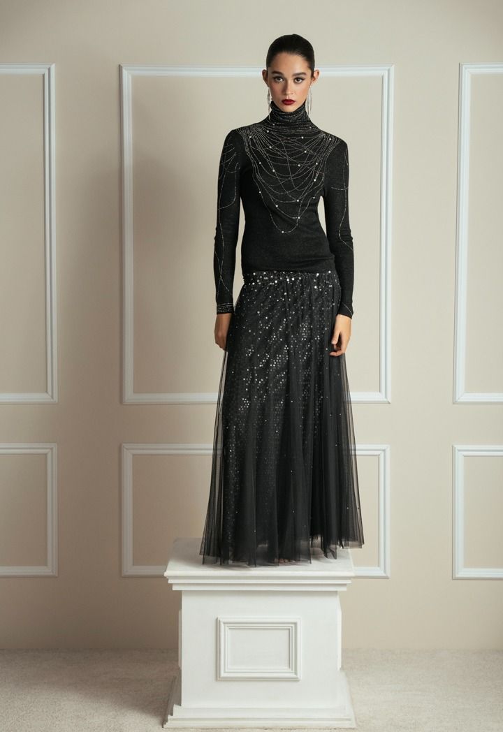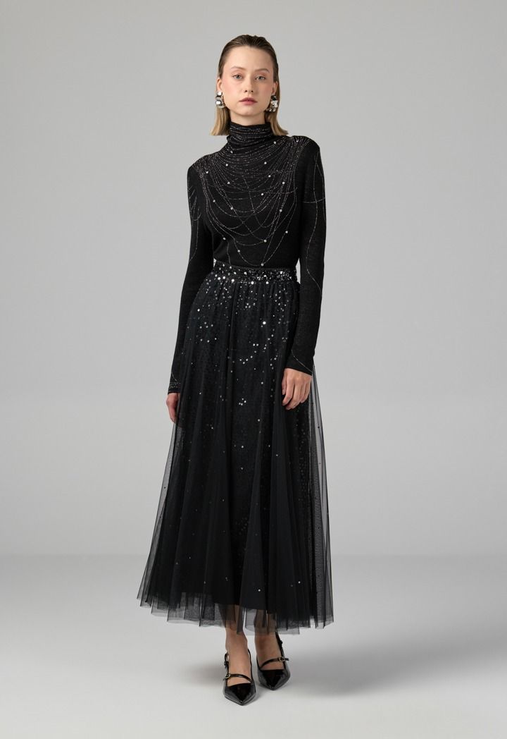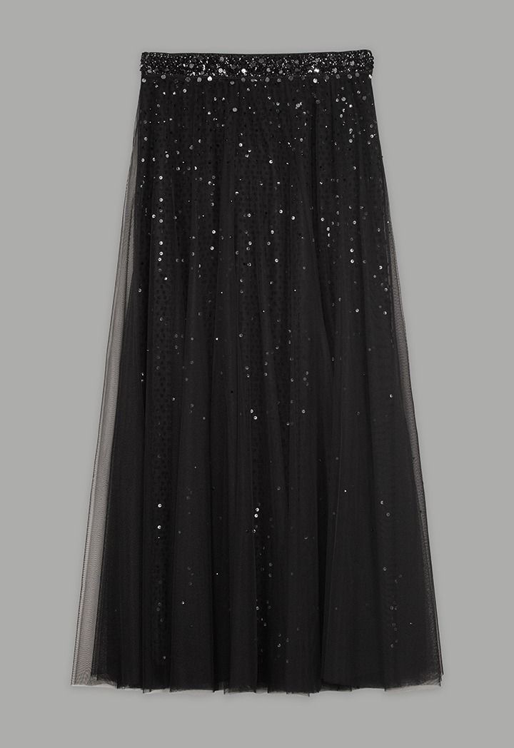 This feminine maxi skirt is essential to every wardrobe, It comes with Sequins details.