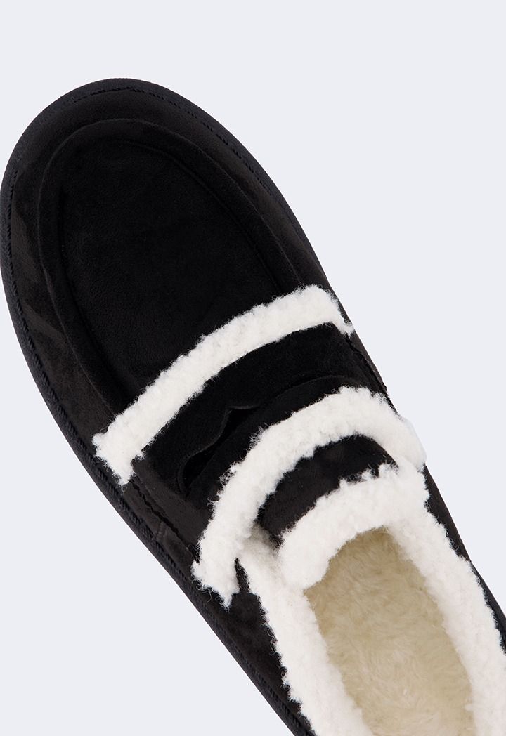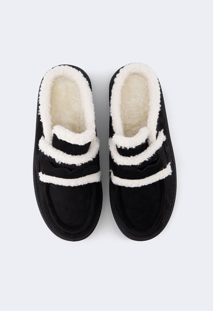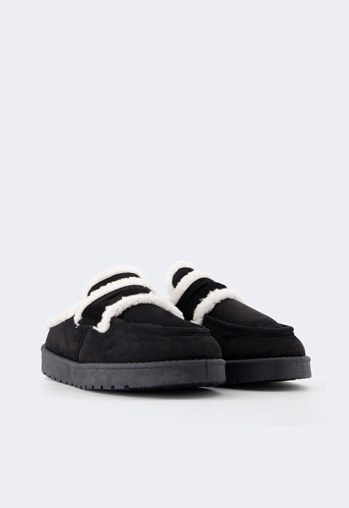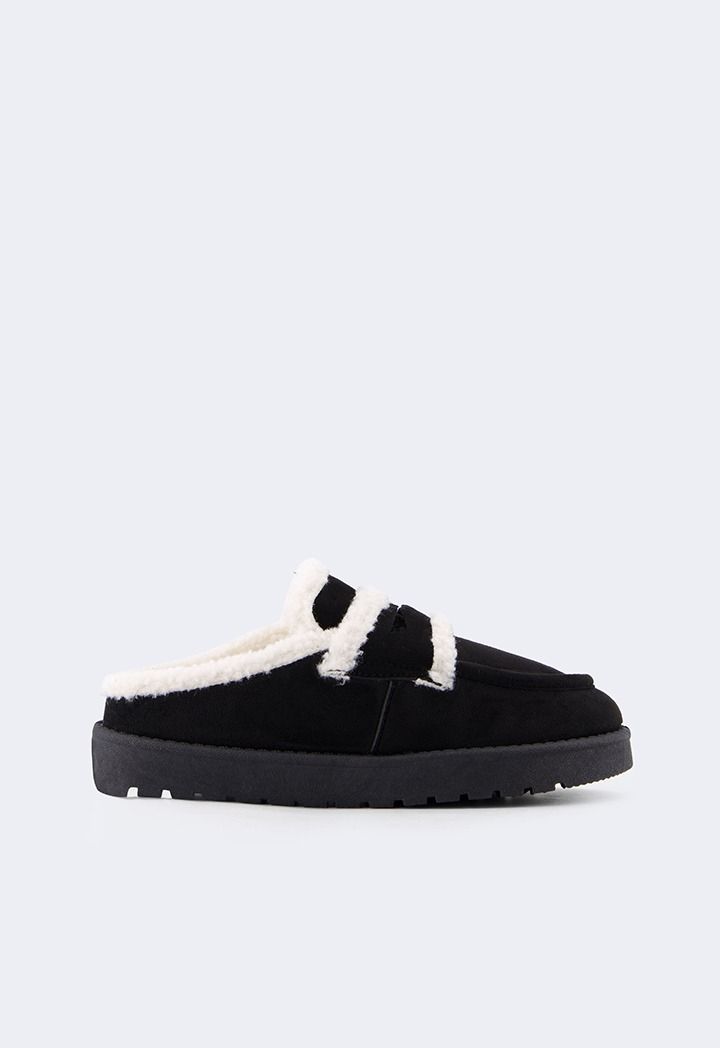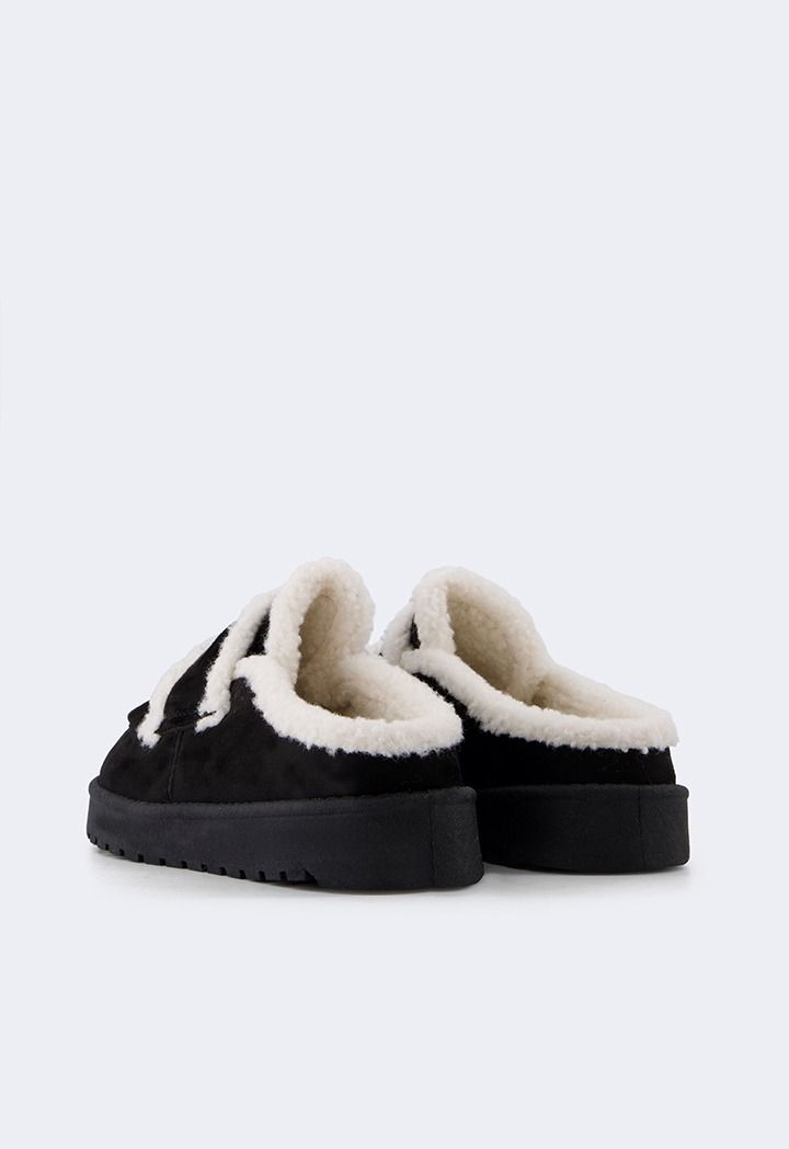 A pair of suede mules that feature a shearling embellished design.