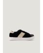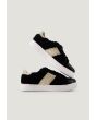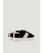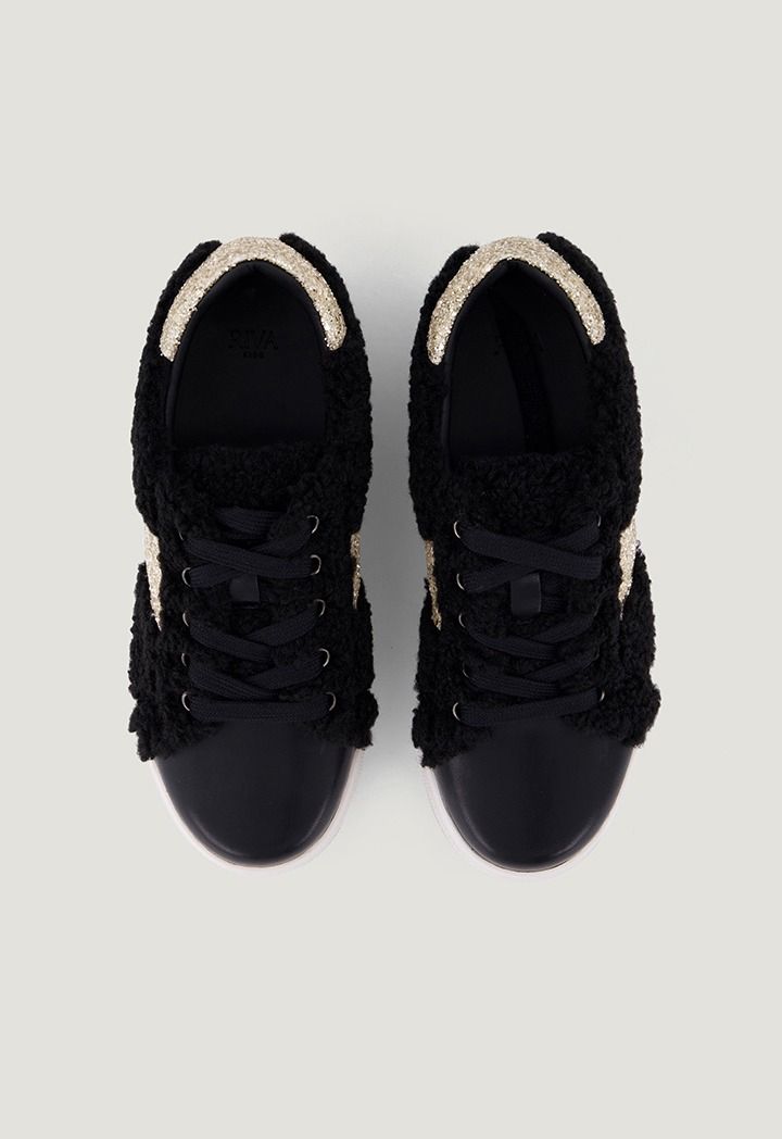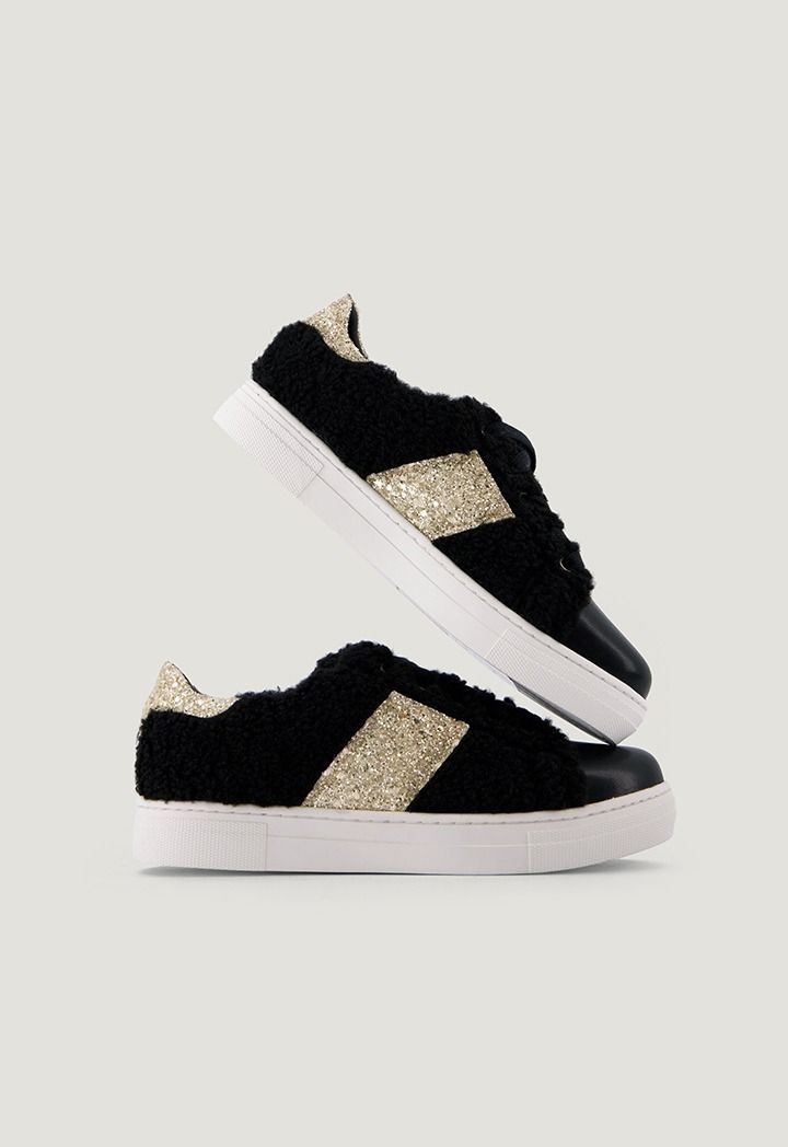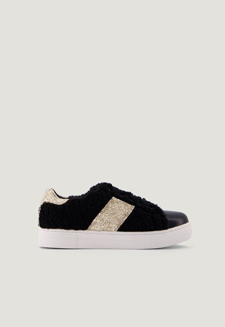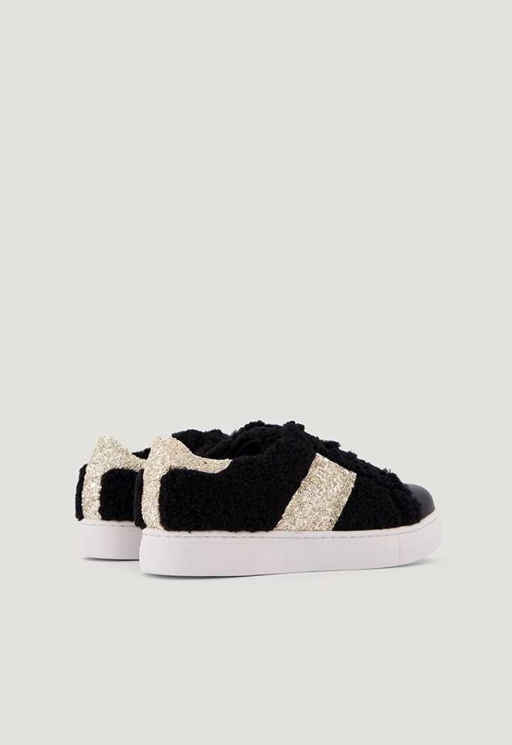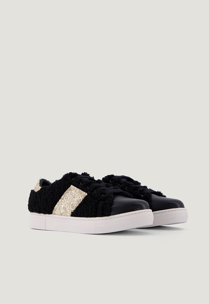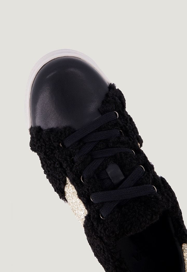 A pair of PU Leather sneakers that feature a shearling glitter design.