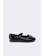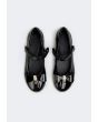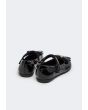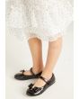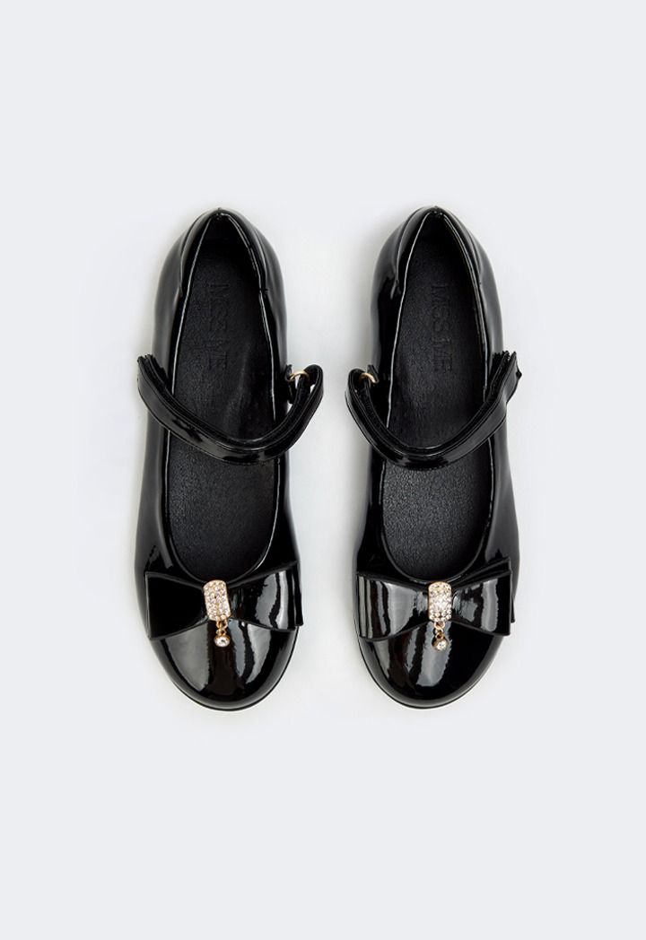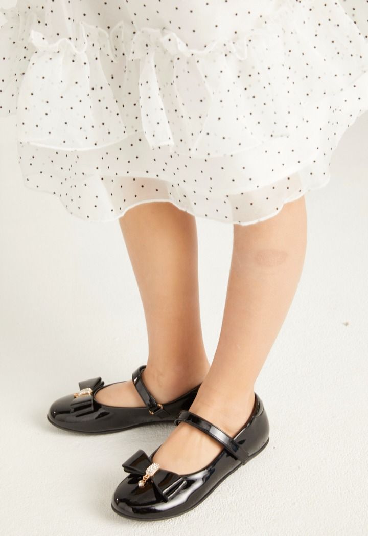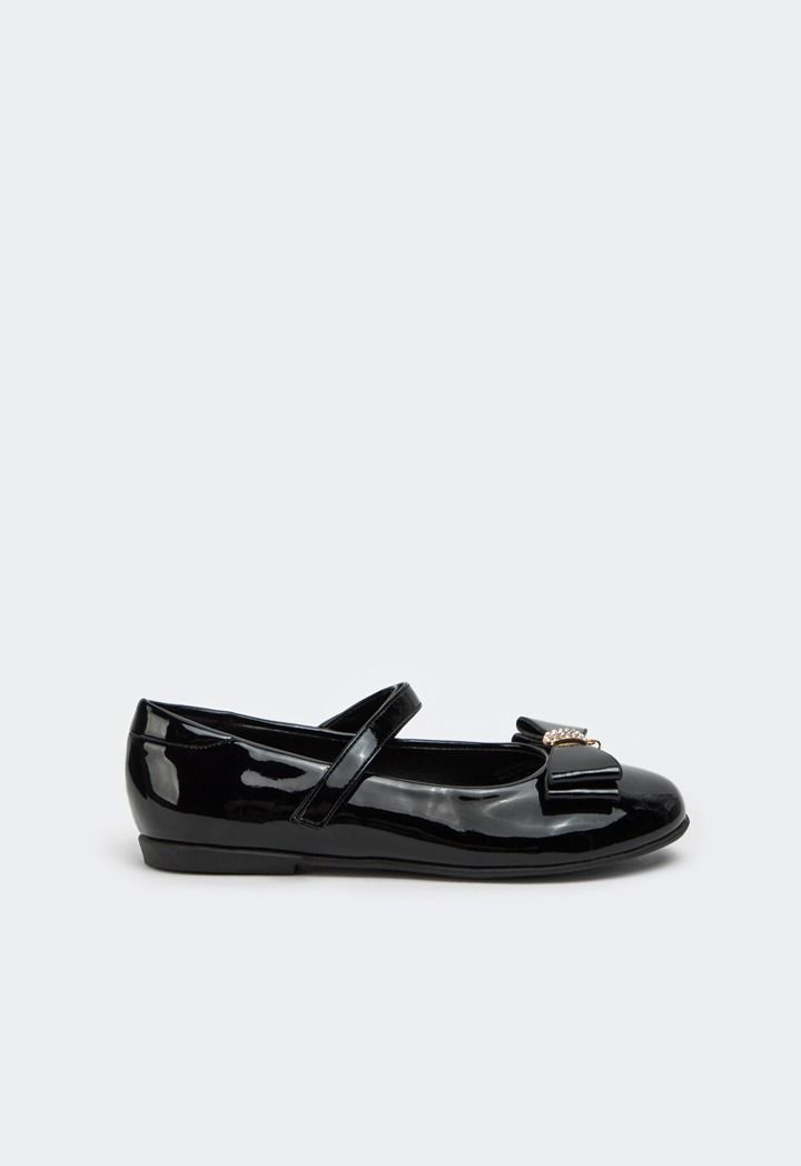 A unique approach to the flat strap shoes, featuring a bow on the rounded toe for that extra look.