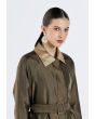 Design: Textured, Shiny, Belted, Side Pockets, Attached Lining