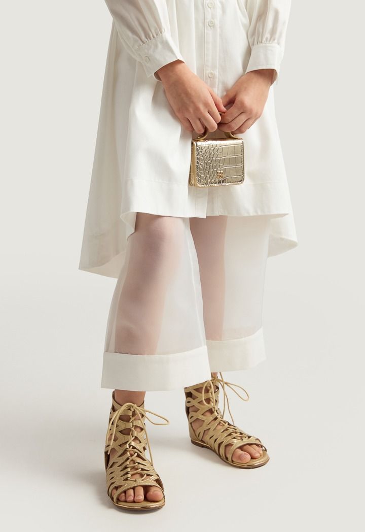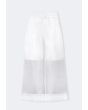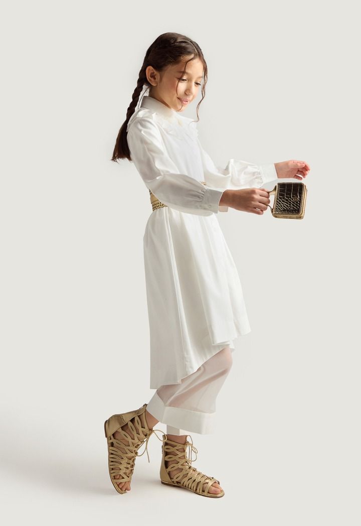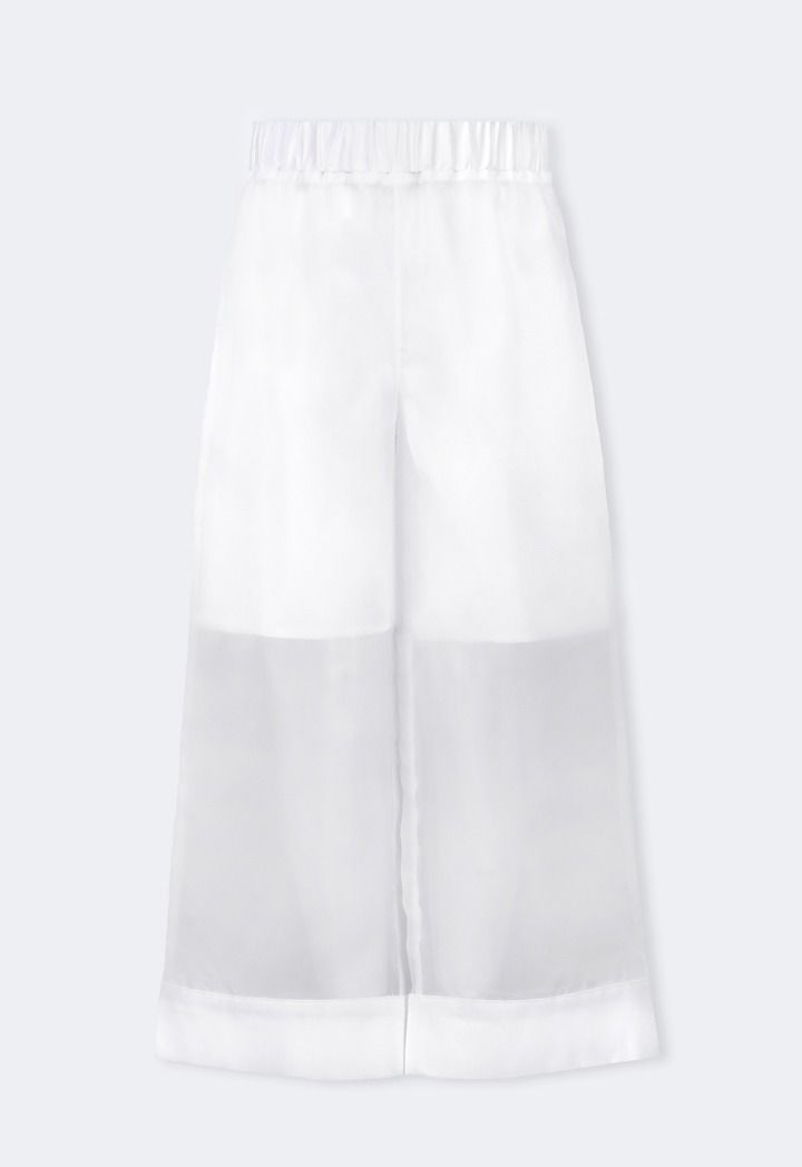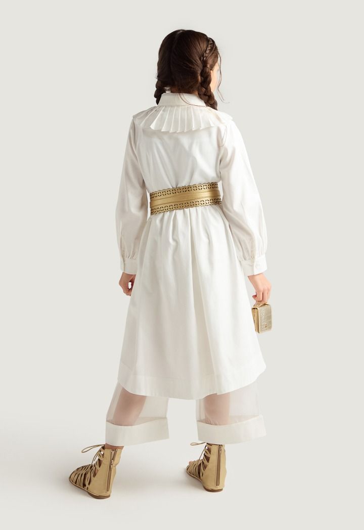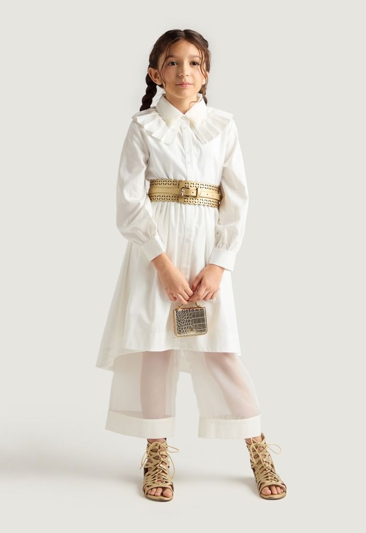 A set of a solid shirt dress and a unique half transparent pair of pants.