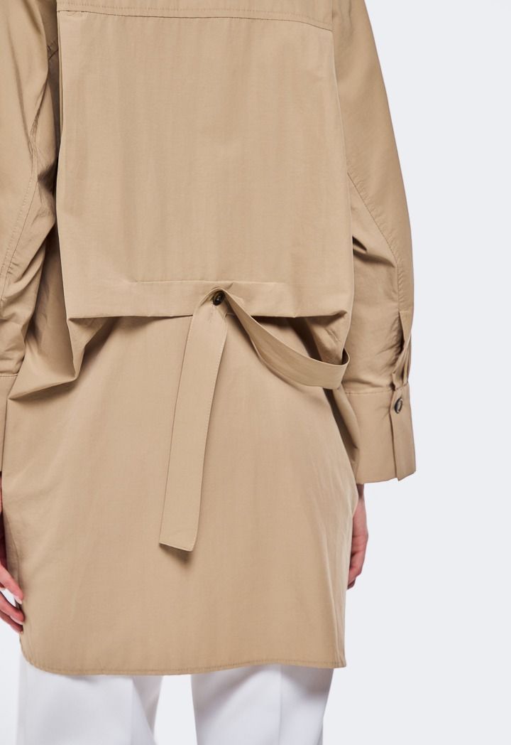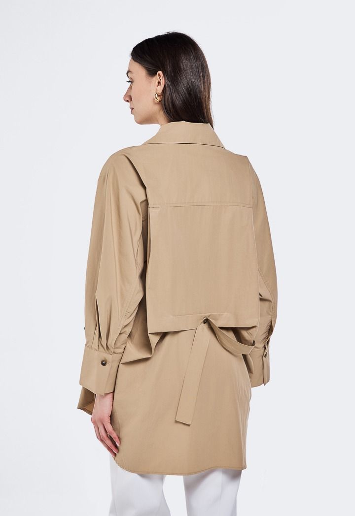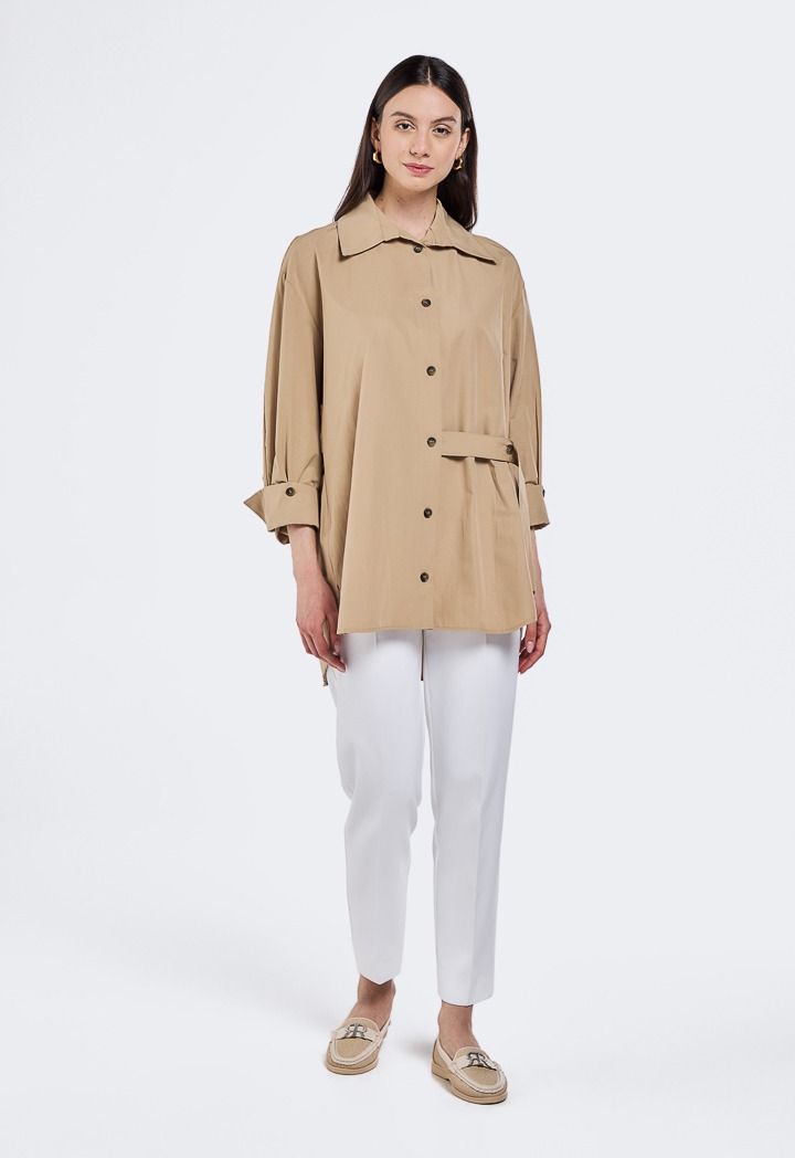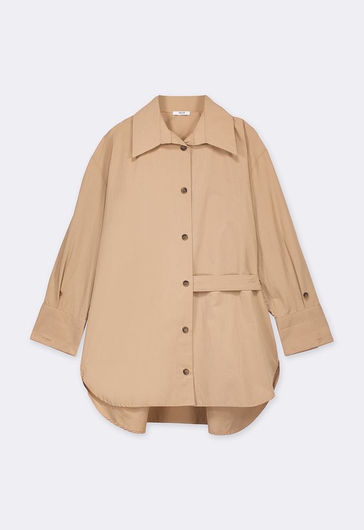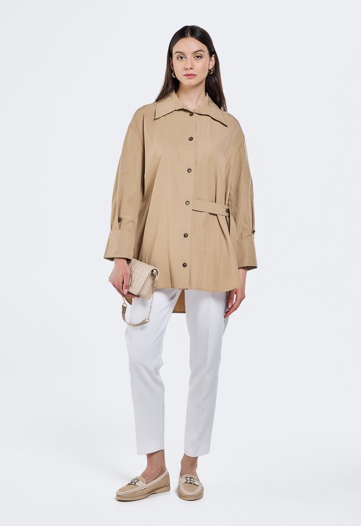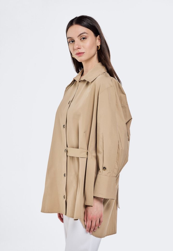 Whether worn loose for a relaxed vibe or cinched at the waist for a structured look, this adjustable-belt shirt offers endless styling possibilities.