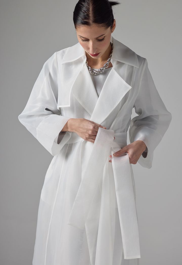 Design: Single Tone, Sparkly, Self Fabric Belt, Pockets, Organza, Transparent