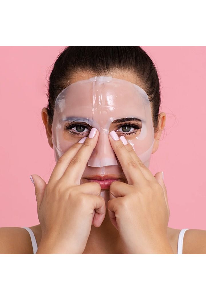 4. Place hydrogel mask on face with firm backing paper still in place.
