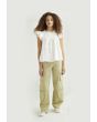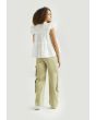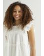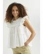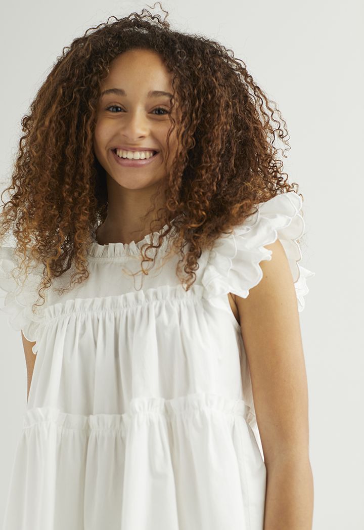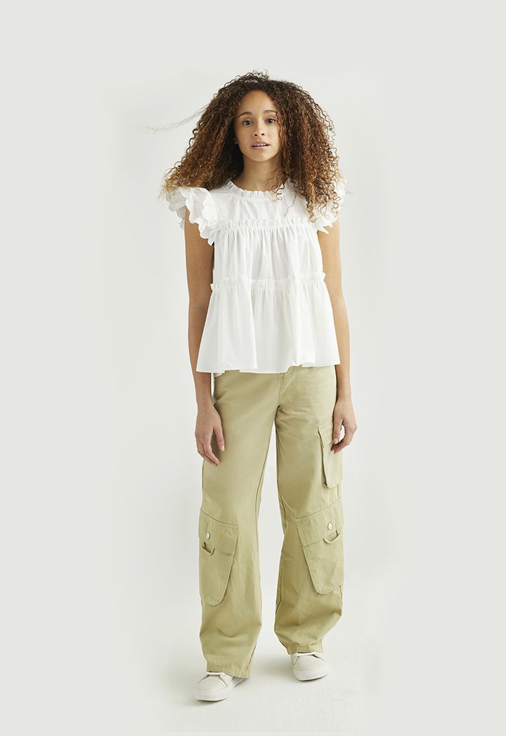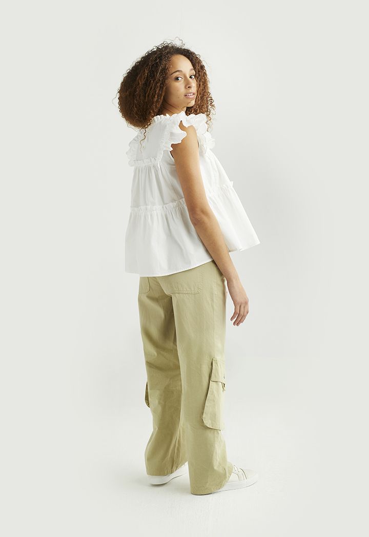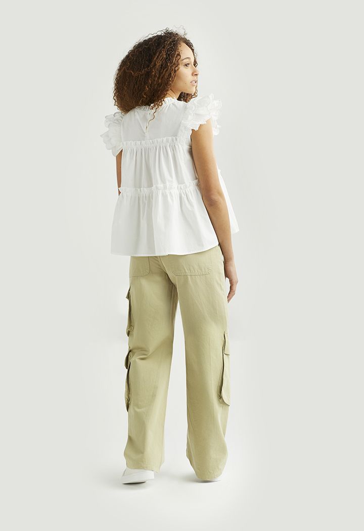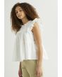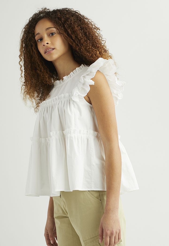 An eye catching design of a blouse, featuring a sleeveless ruffled tiered front.