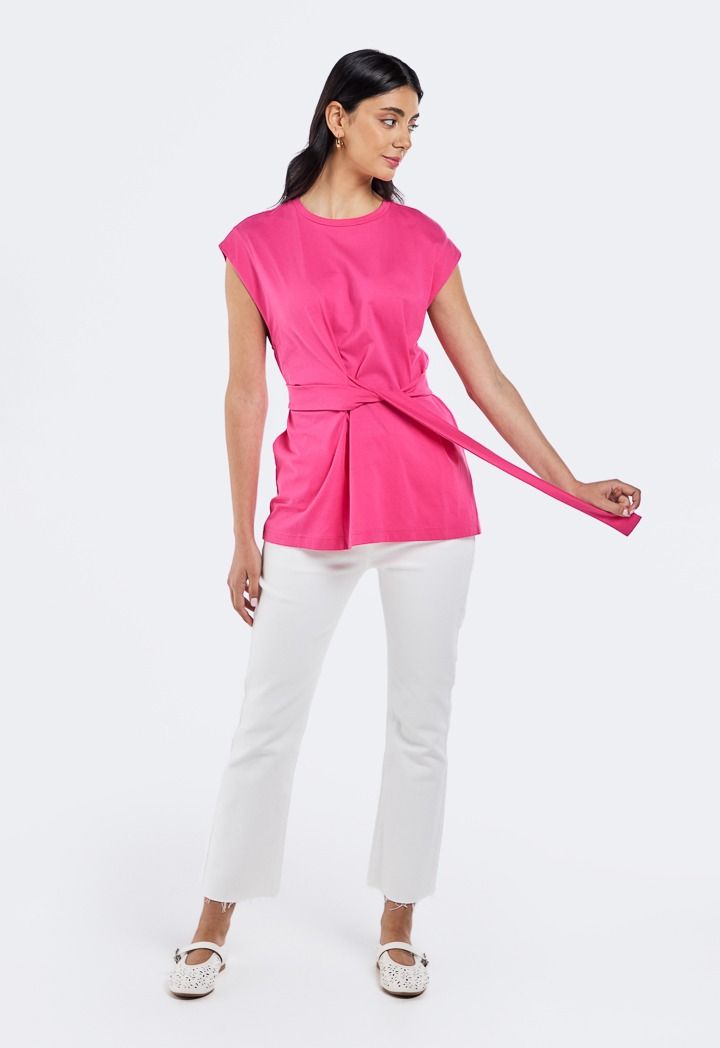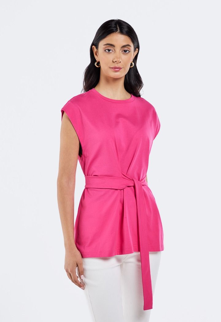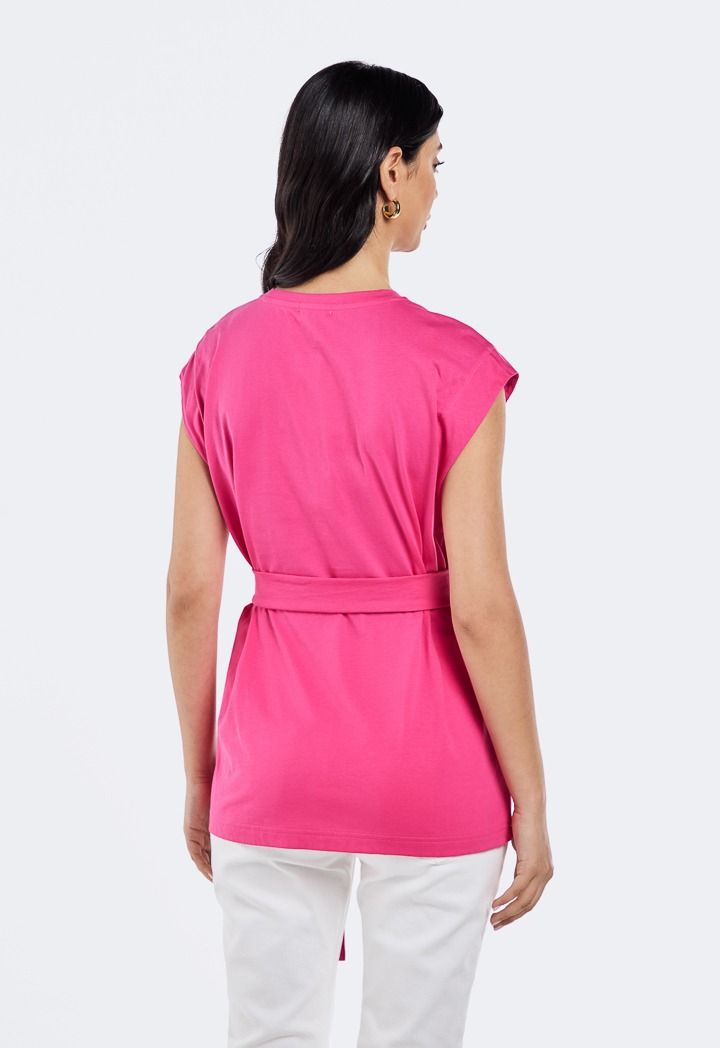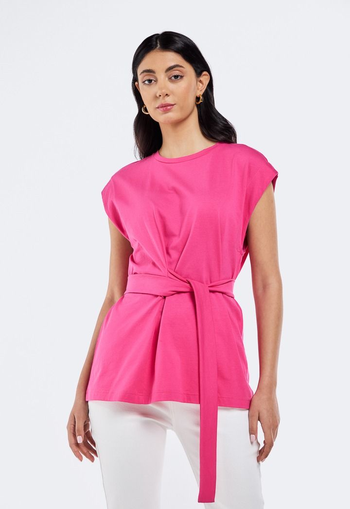 Opt for effortless elegance with this top. The modest sleeveless top comes with a tonal self-tie belt to define the silhouette.
