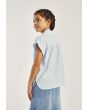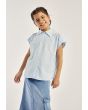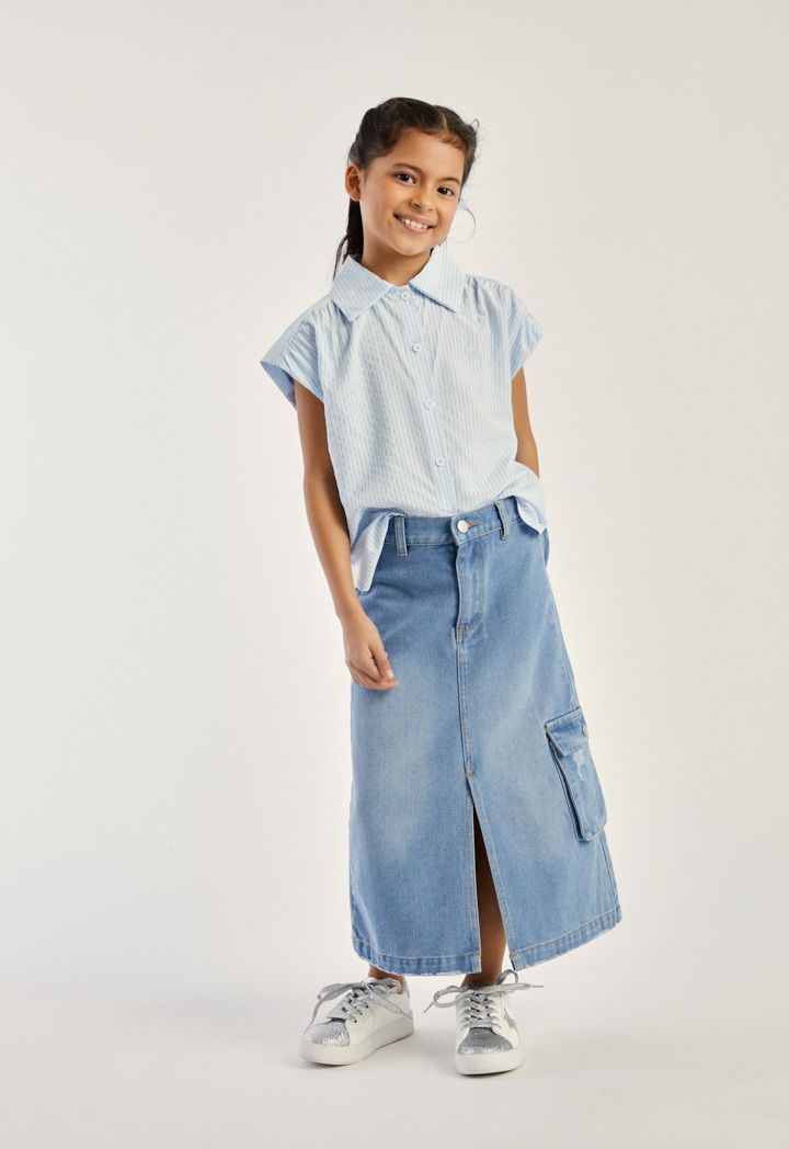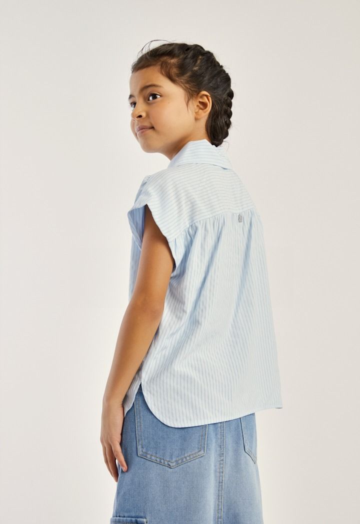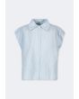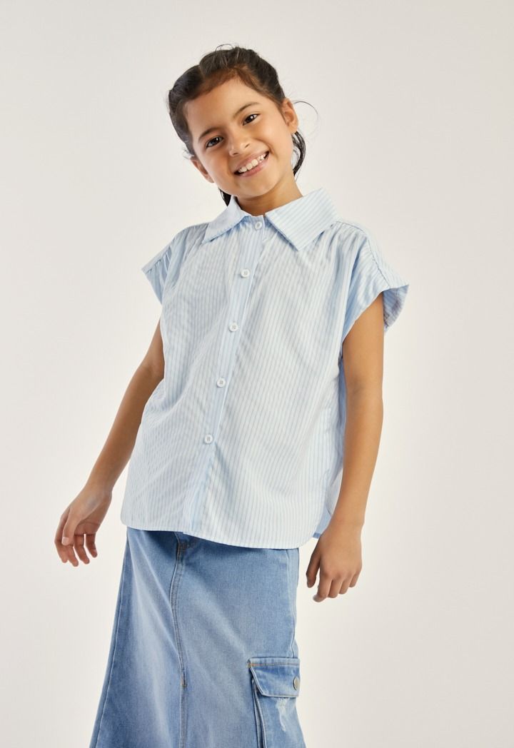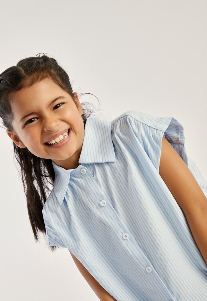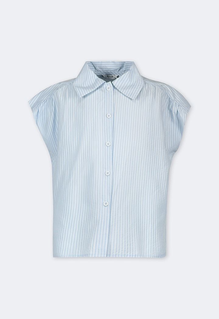 A vibrant striped shirt that features a sleeveless design and front buttons.