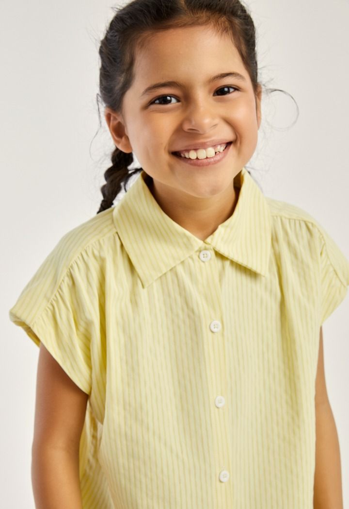A vibrant striped shirt that features a sleeveless design and front buttons.