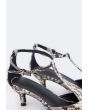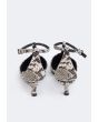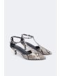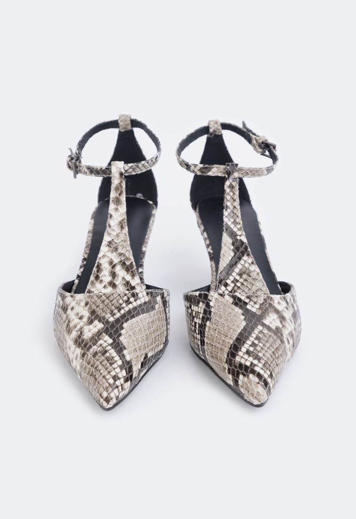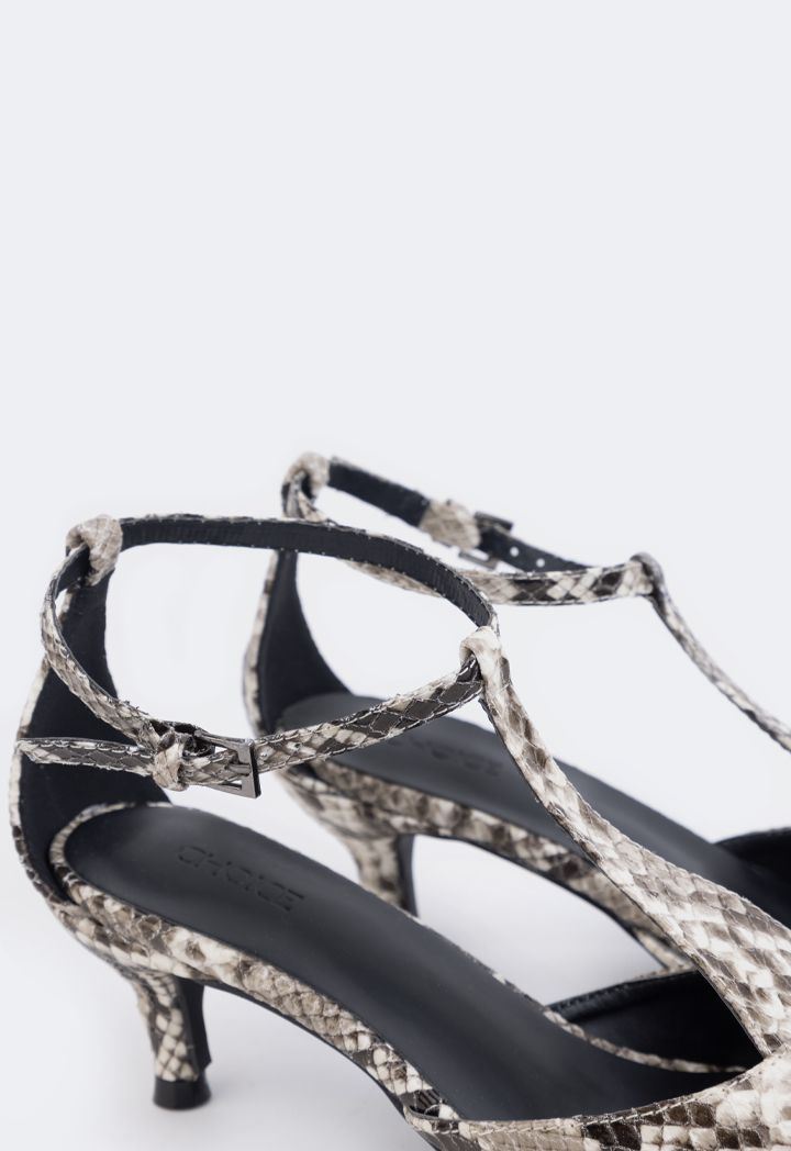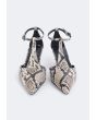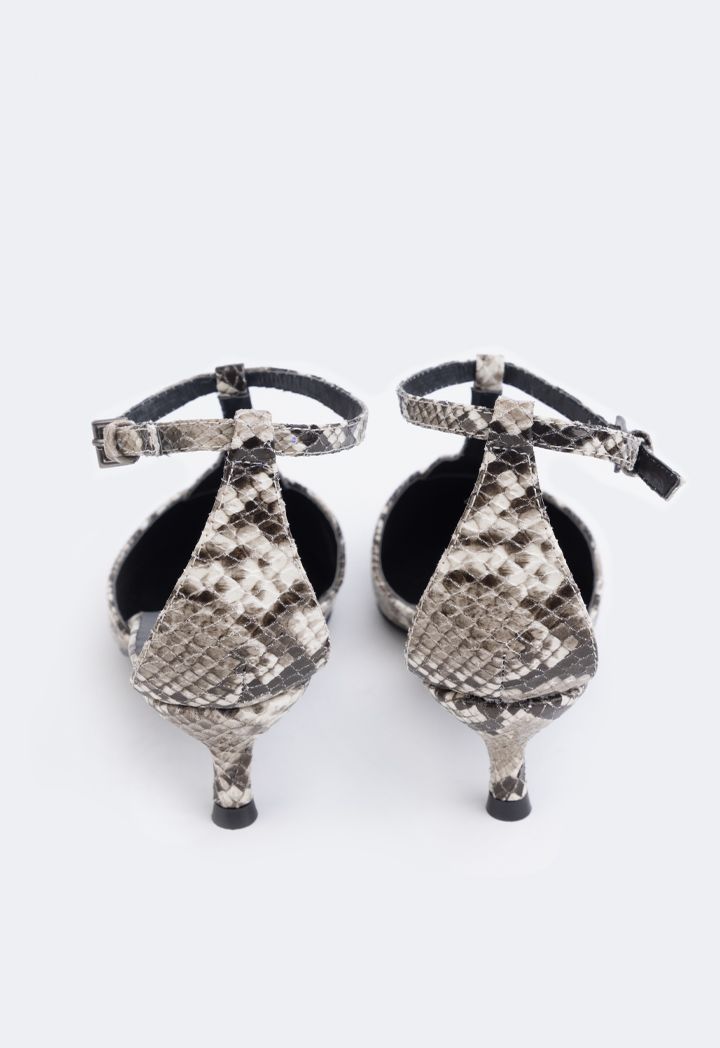 A pair of modern heels that features a printed snake skin design and an ankle strap for a comfortable wear.