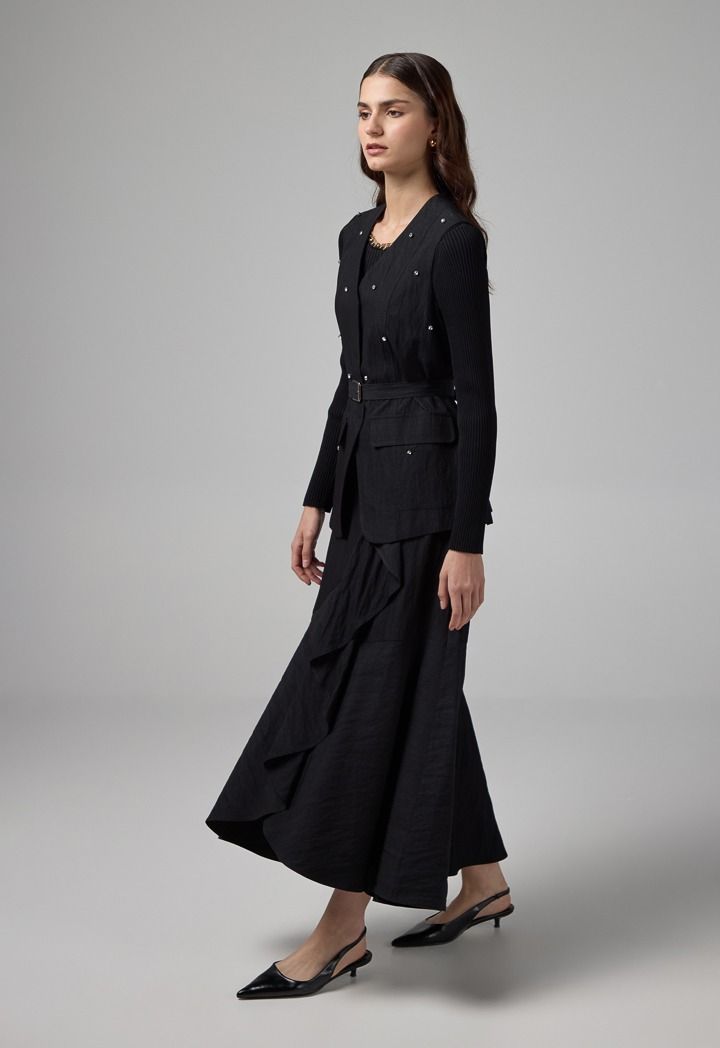 Design: Solid, Front Flap Pockets, Attached Lining, Belt, Crystal Embellished