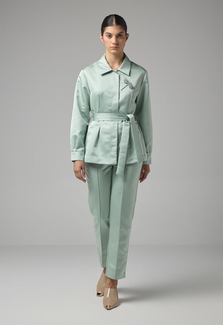 Design: Solid, Self Fabric Belt, Crystal Embellished, Pleated