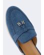 Design : Solid, Denim, Brand Metal Details, Oval Toe, Stitched Details