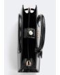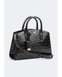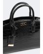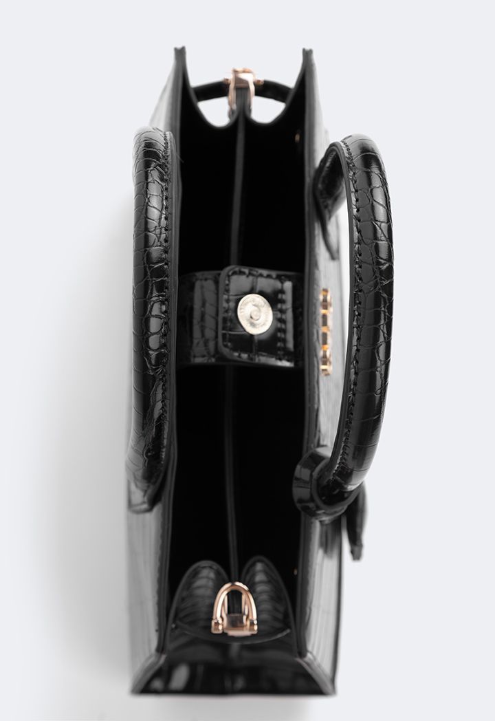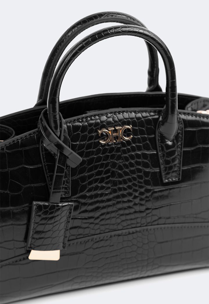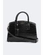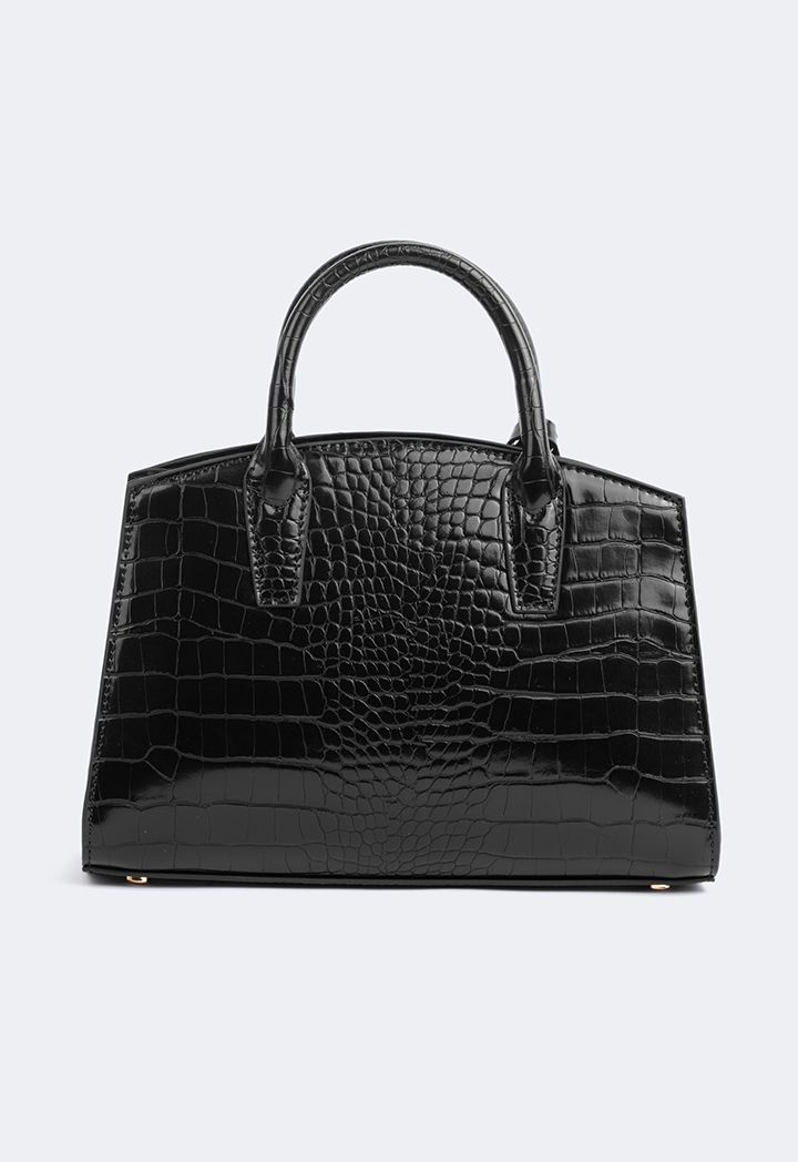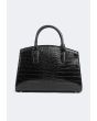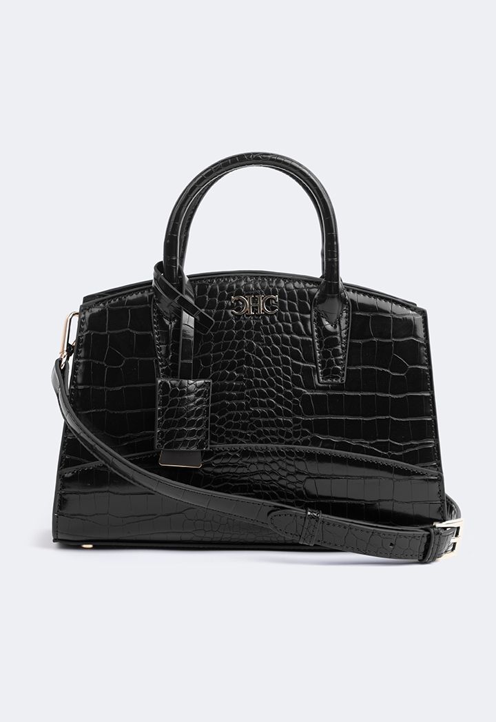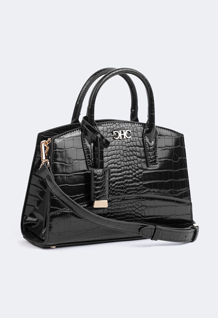 A modern handbag featuring a solid outline, embossed croc design and a metallic emblem.