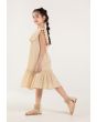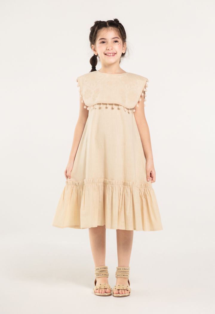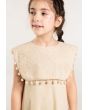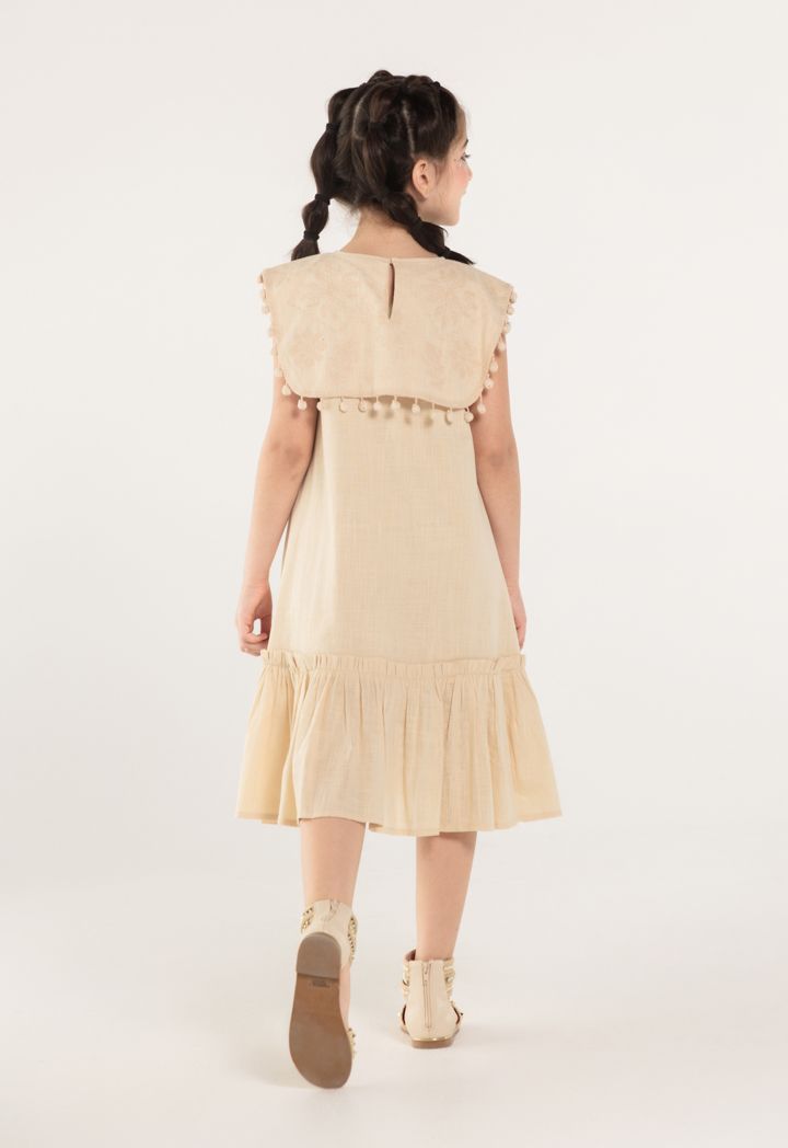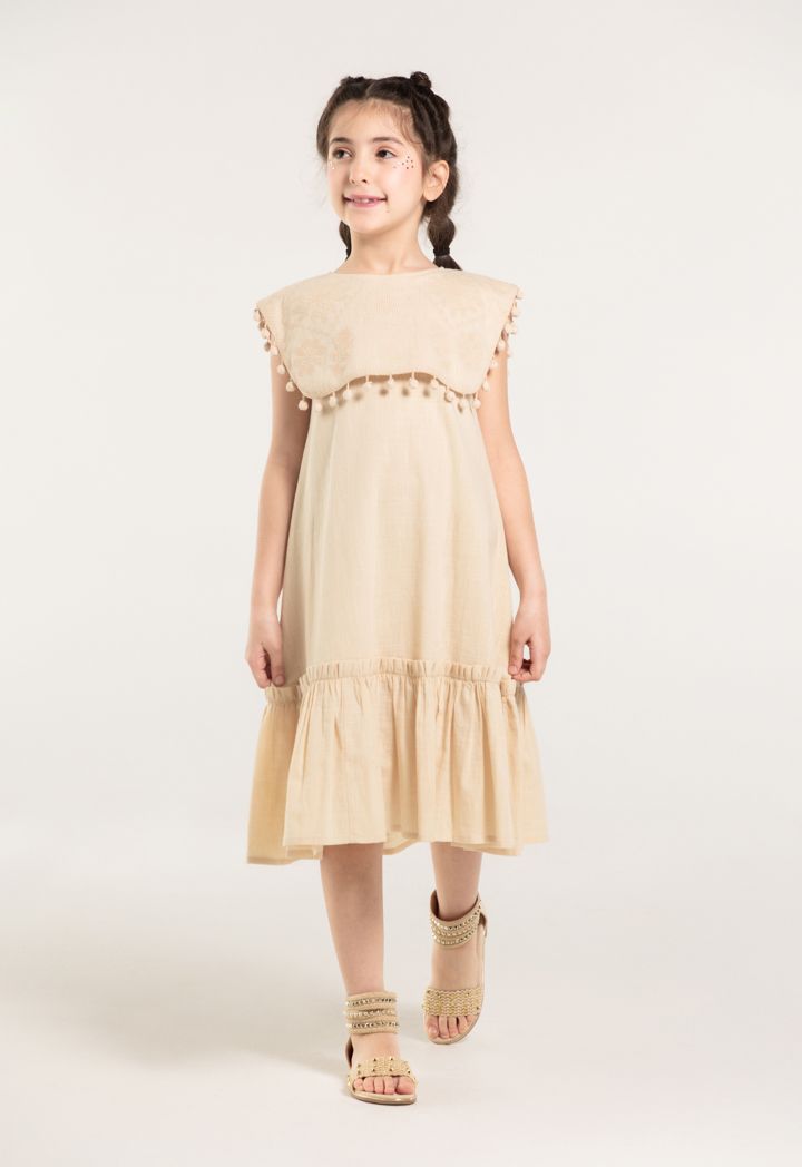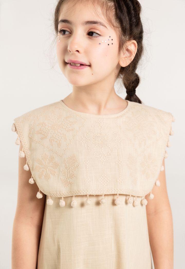 Your little girl will sport an adorable look when donning this dress for her next day out with the family. The round neckline and Sleeveless cut will provide a comfortable dress. The Embroidered and Pom Poms details on the dress will elevate her look.