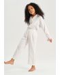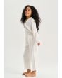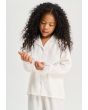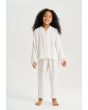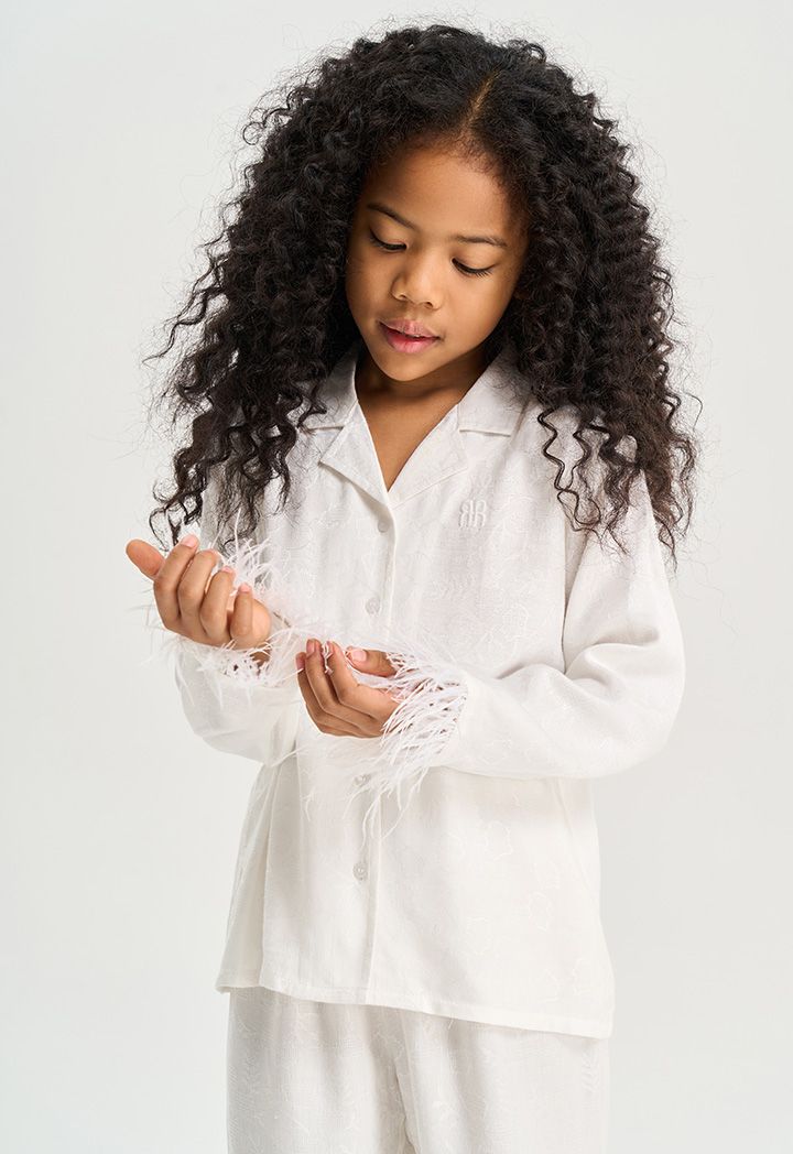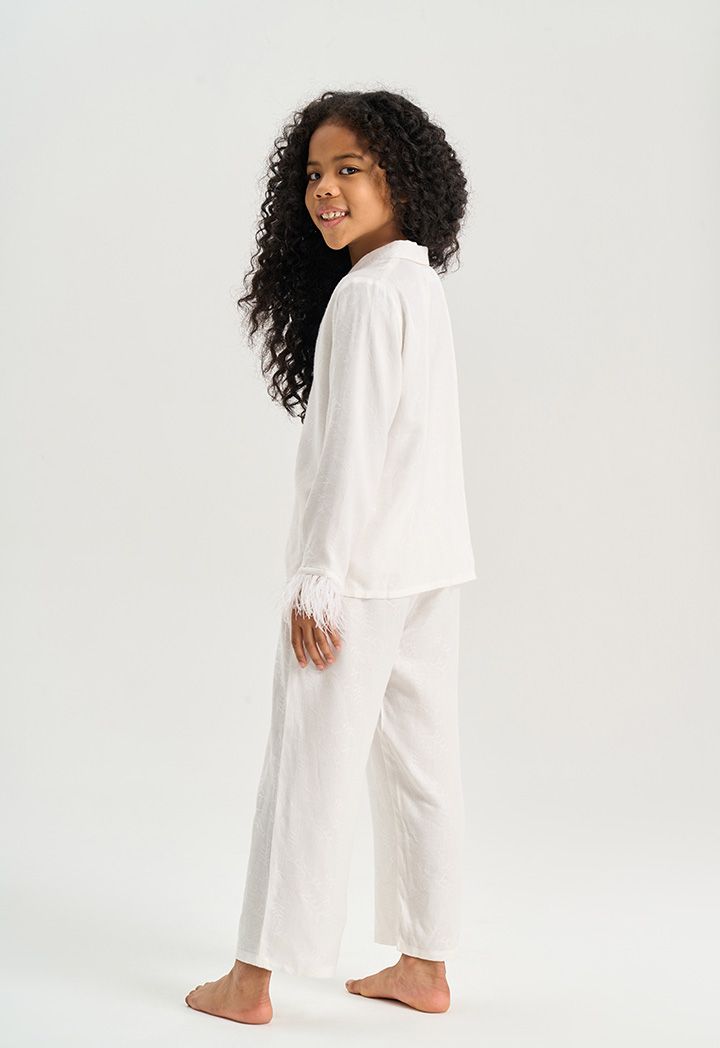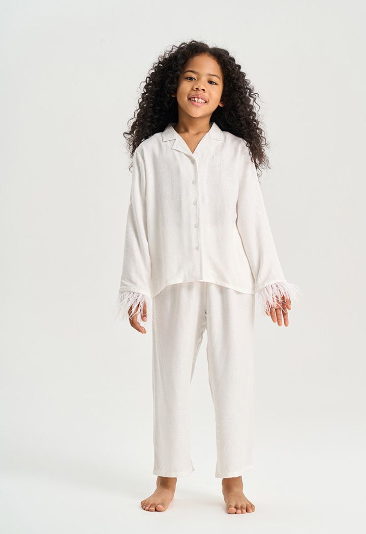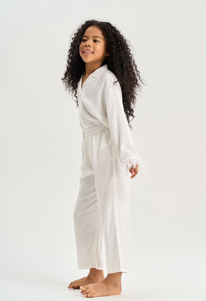 Your young girl's lounging look will be relaxed and sweet with this Solid Pajama set. Blouse with Long Sleeves With Feather Hem, Notch lapel neckline. While the pant has an elasticated waistband.