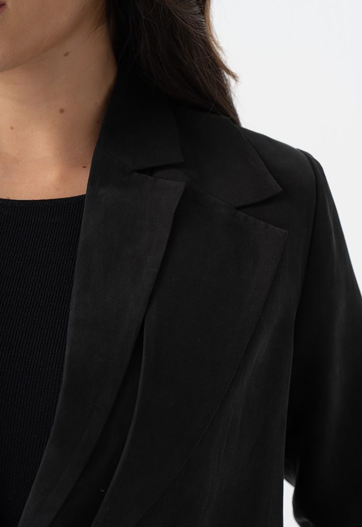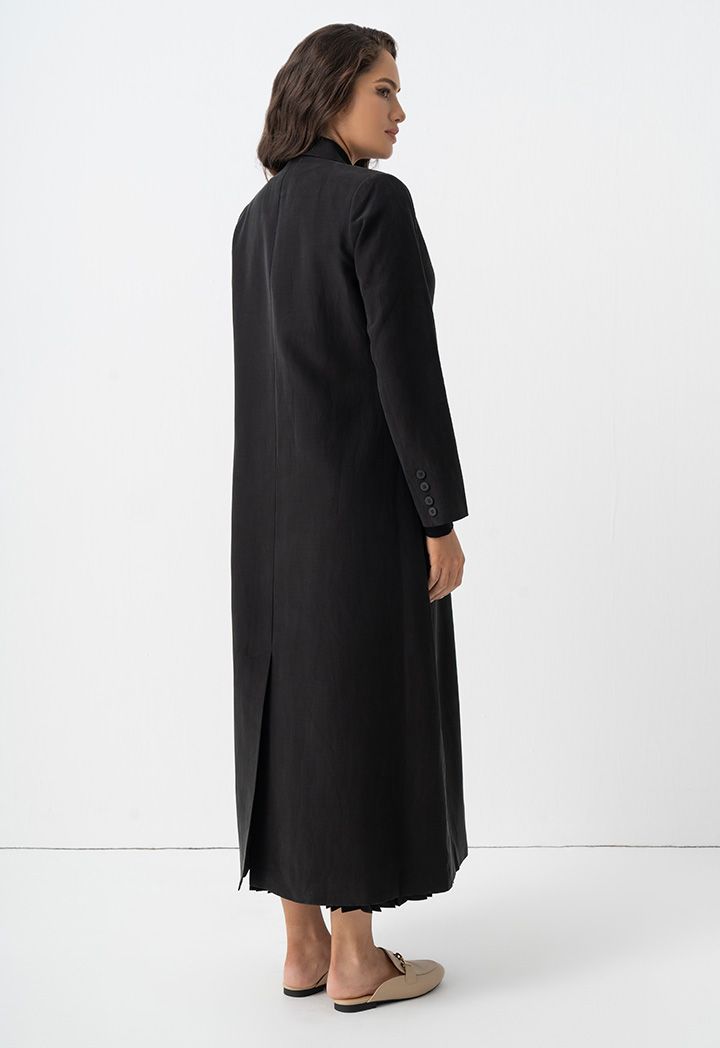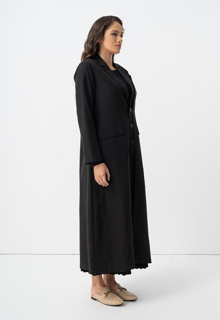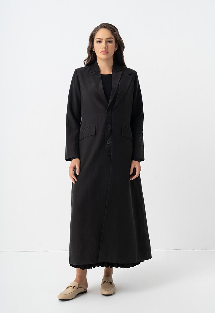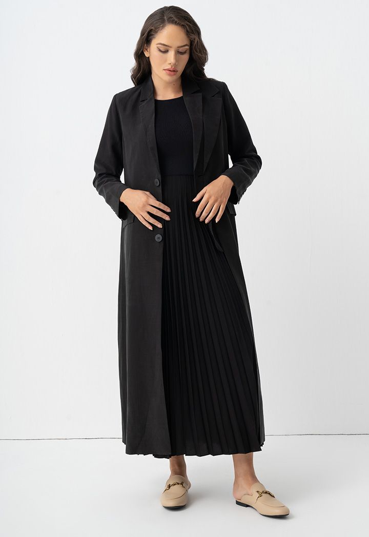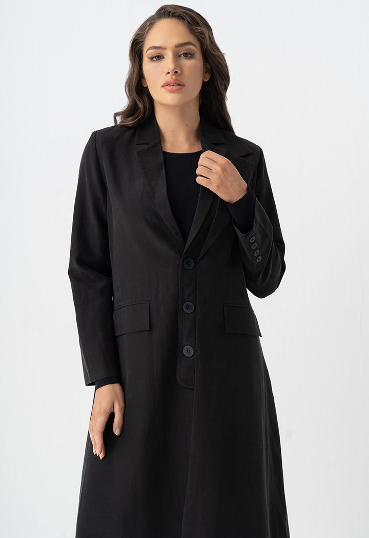 Design: Solid, Front Flap Pockets, Back Slit hem, Attached Lining