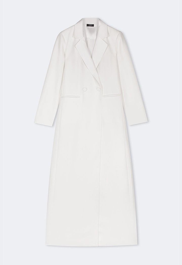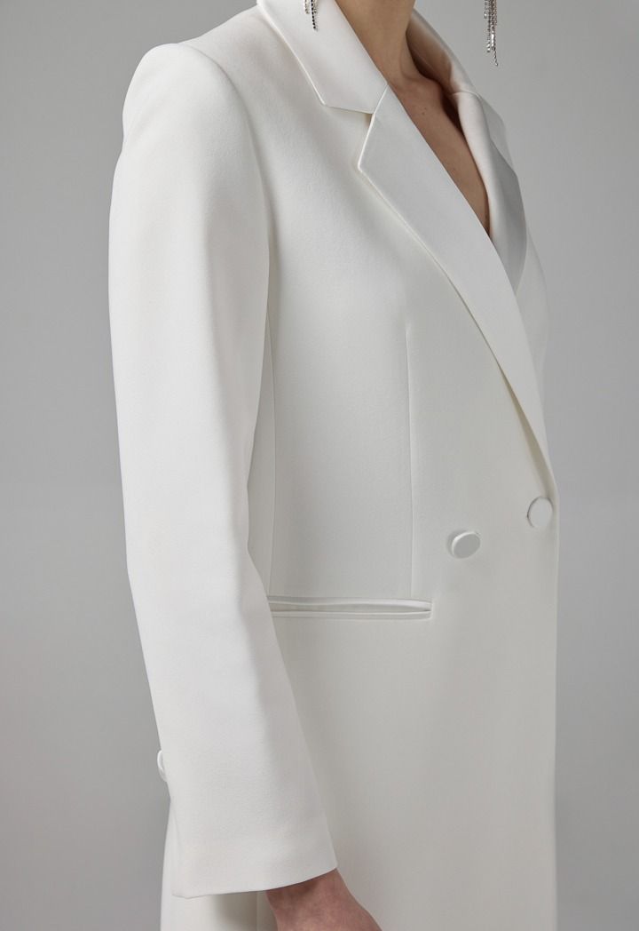 Design: Solid, Double Breasted, Front Pockets, Attached Lining, Back Slit