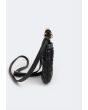 This could be your new Favorite bag with its soft-edged shape with strap ends that are double-knotted at the sides and a metallic top handle.