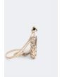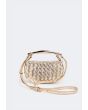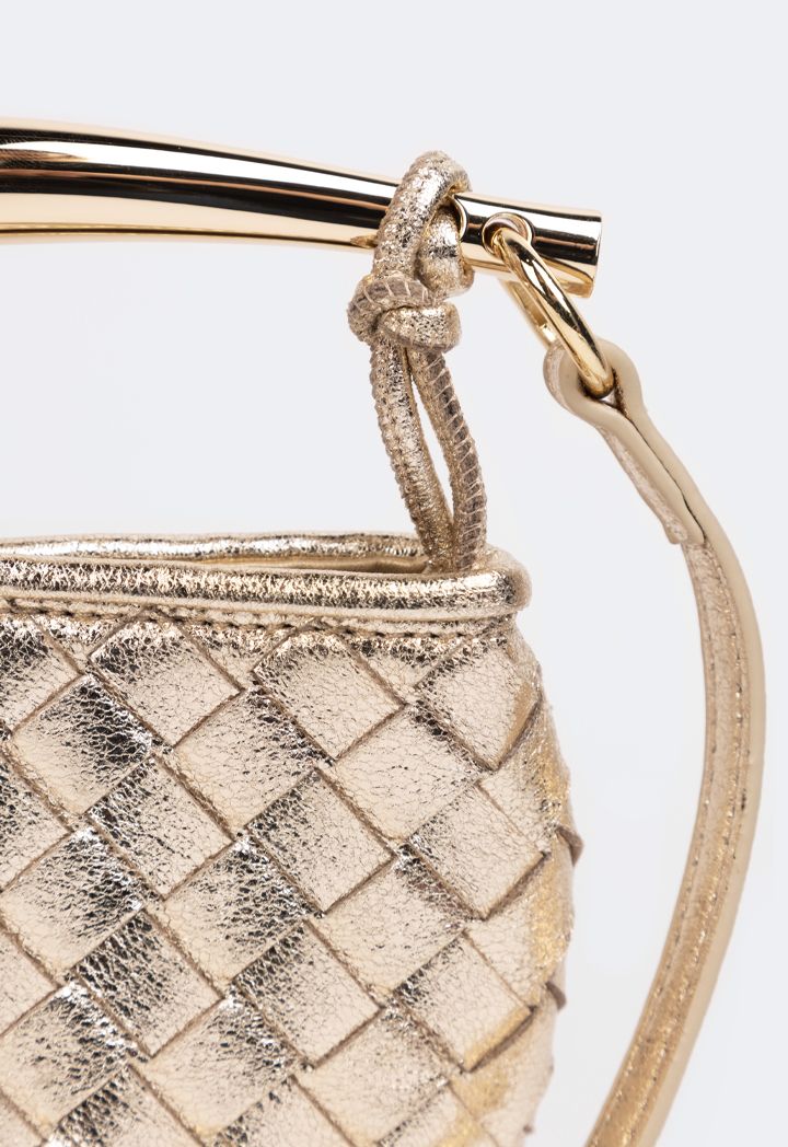 This could be your new Favorite bag with its soft-edged shape with strap ends that are double-knotted at the sides and a metallic top handle.