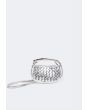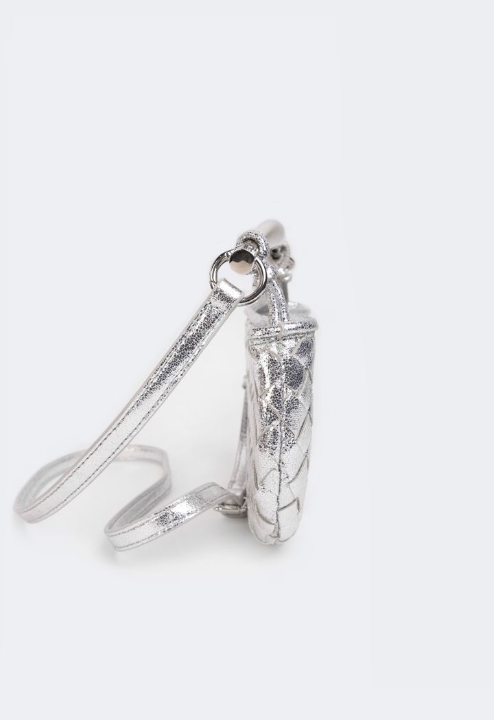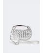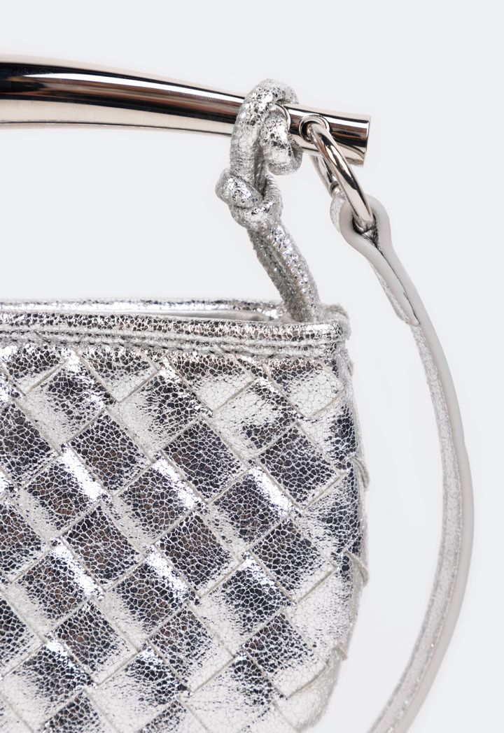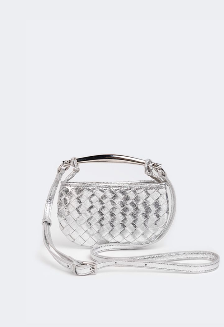 This could be your new Favorite bag with its soft-edged shape with strap ends that are double-knotted at the sides and a metallic top handle.