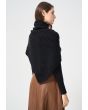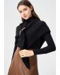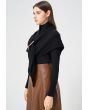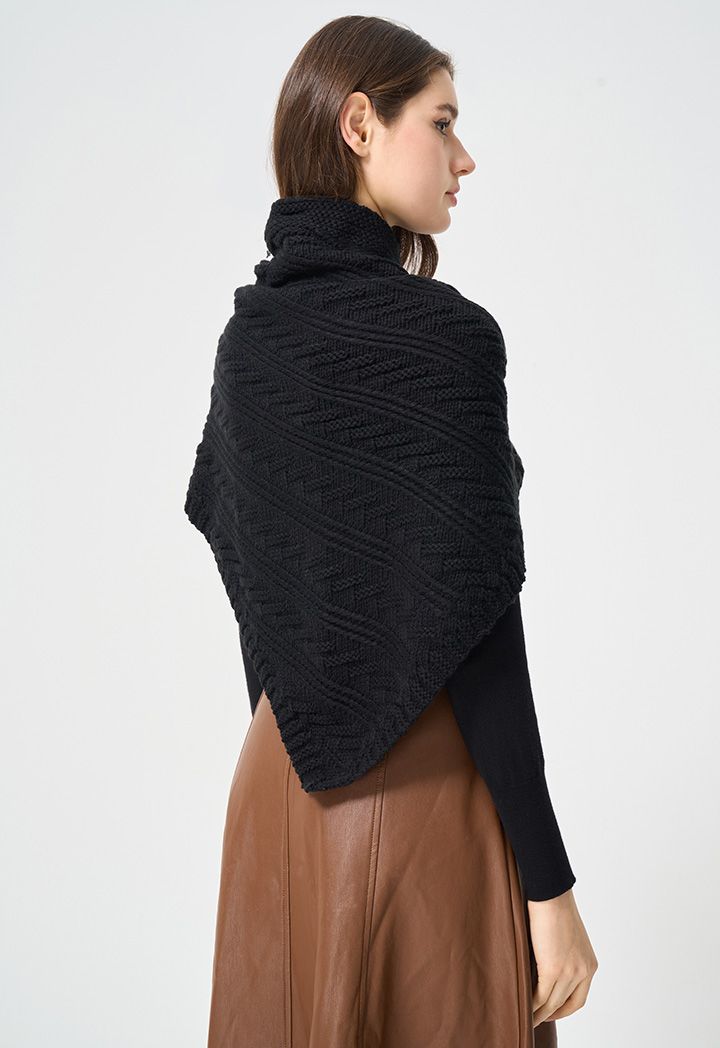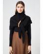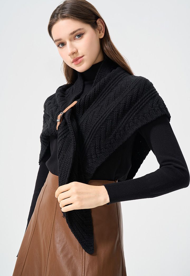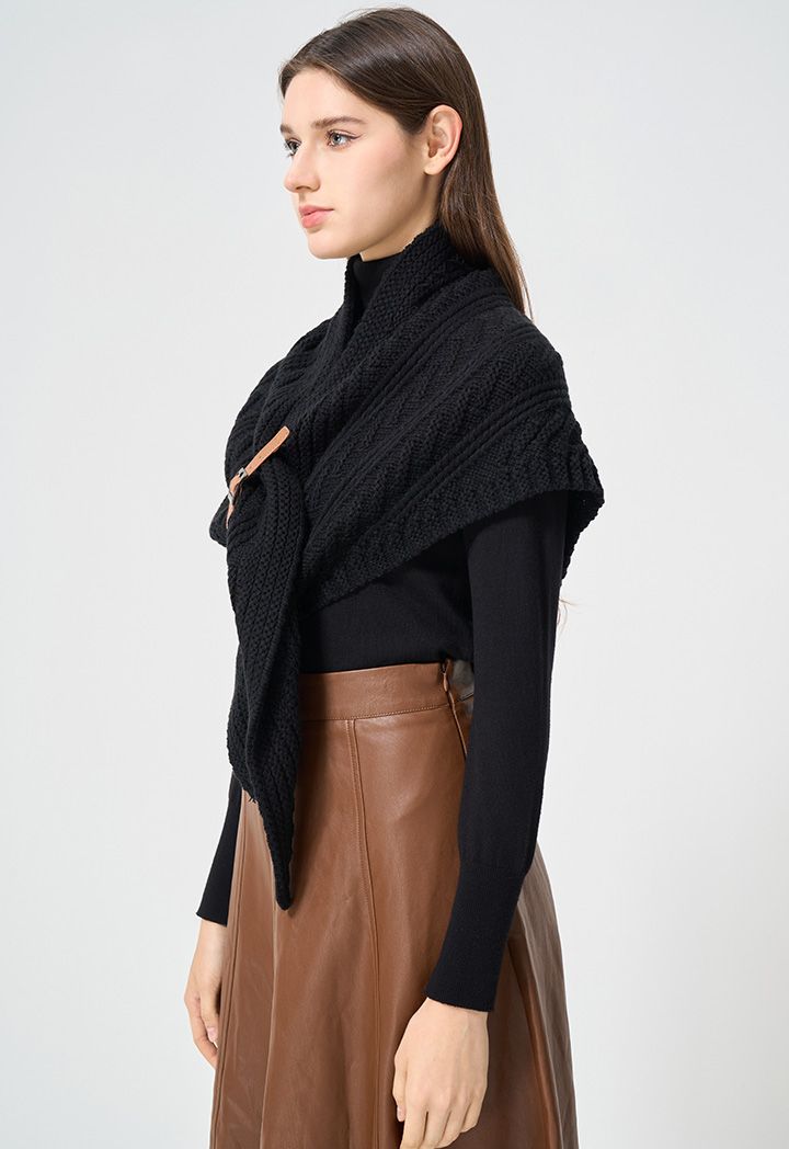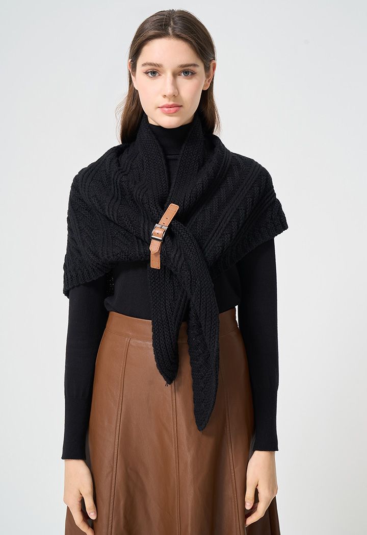 An out of the ordinary design of a shoulder scarf that features a solid knitted design with a leather strap.