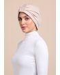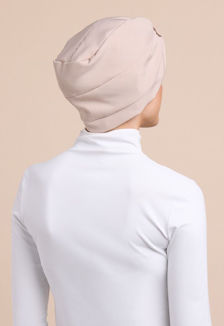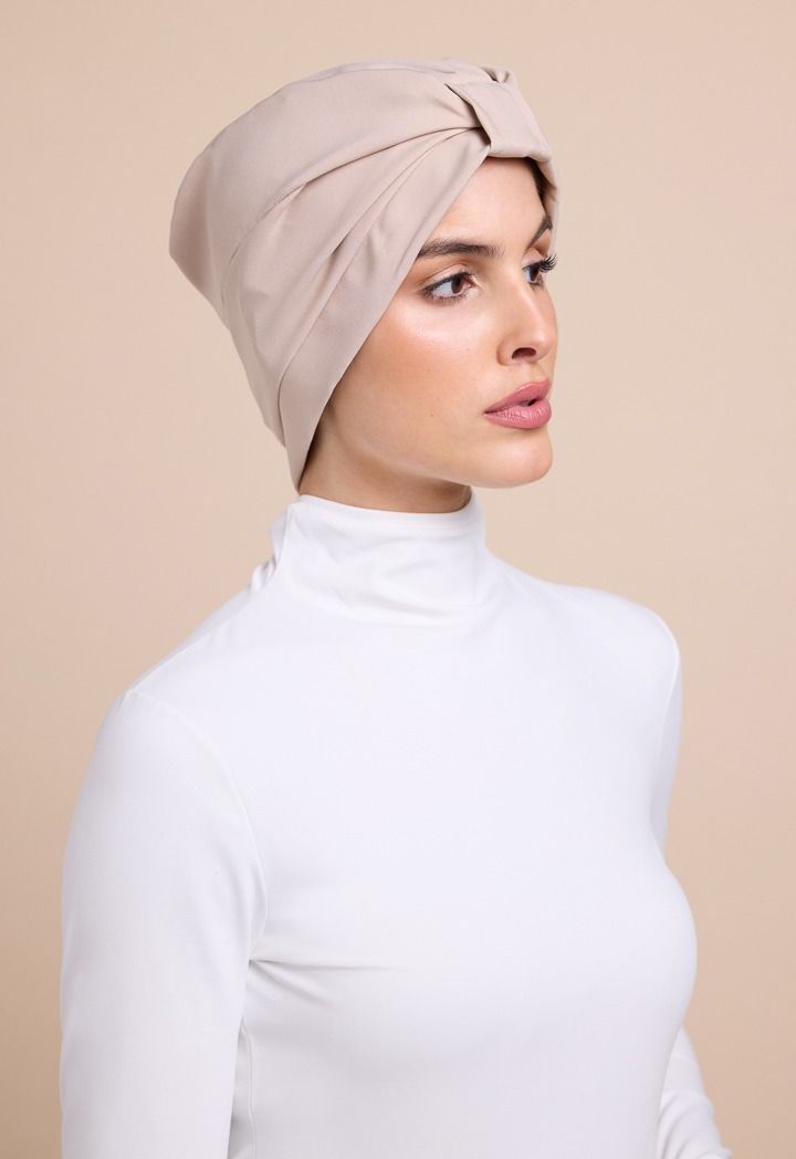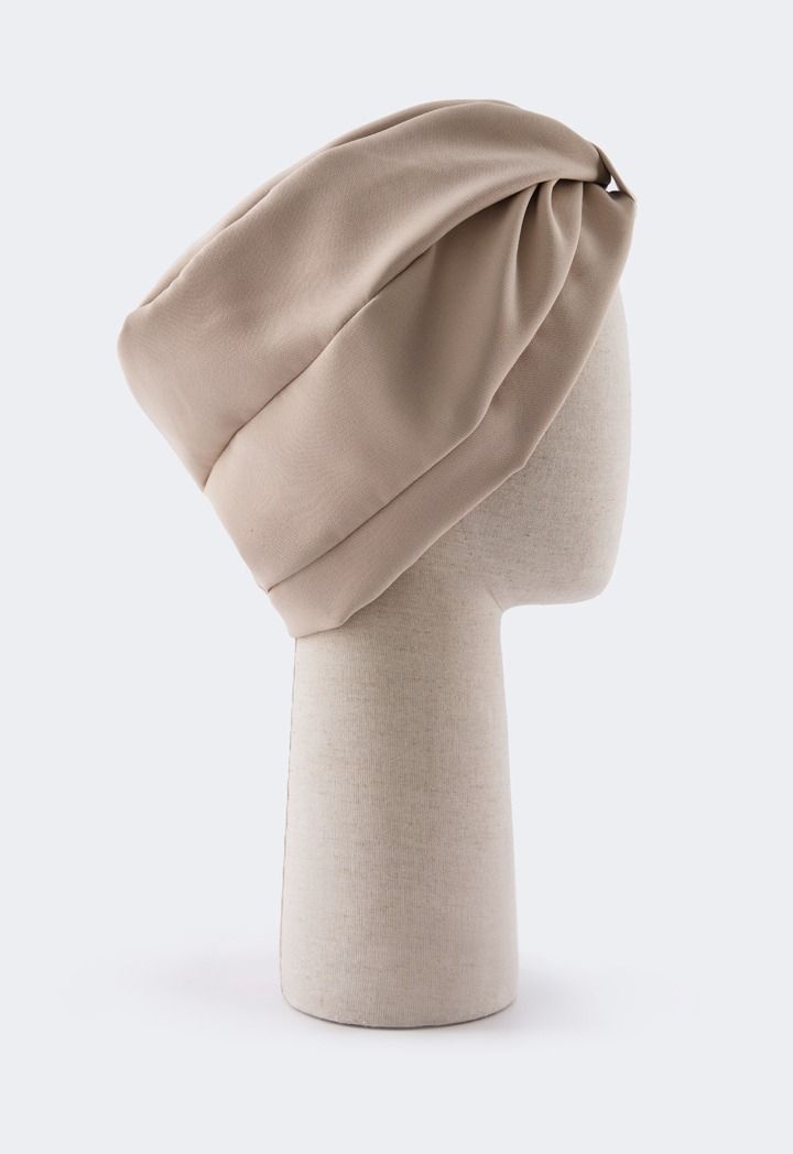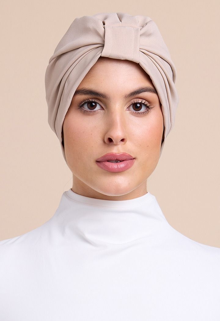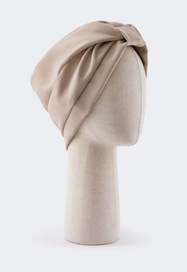 This turban features a solid design with a stylish knot, offering a simple yet elegant look.
