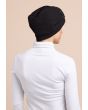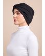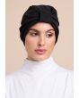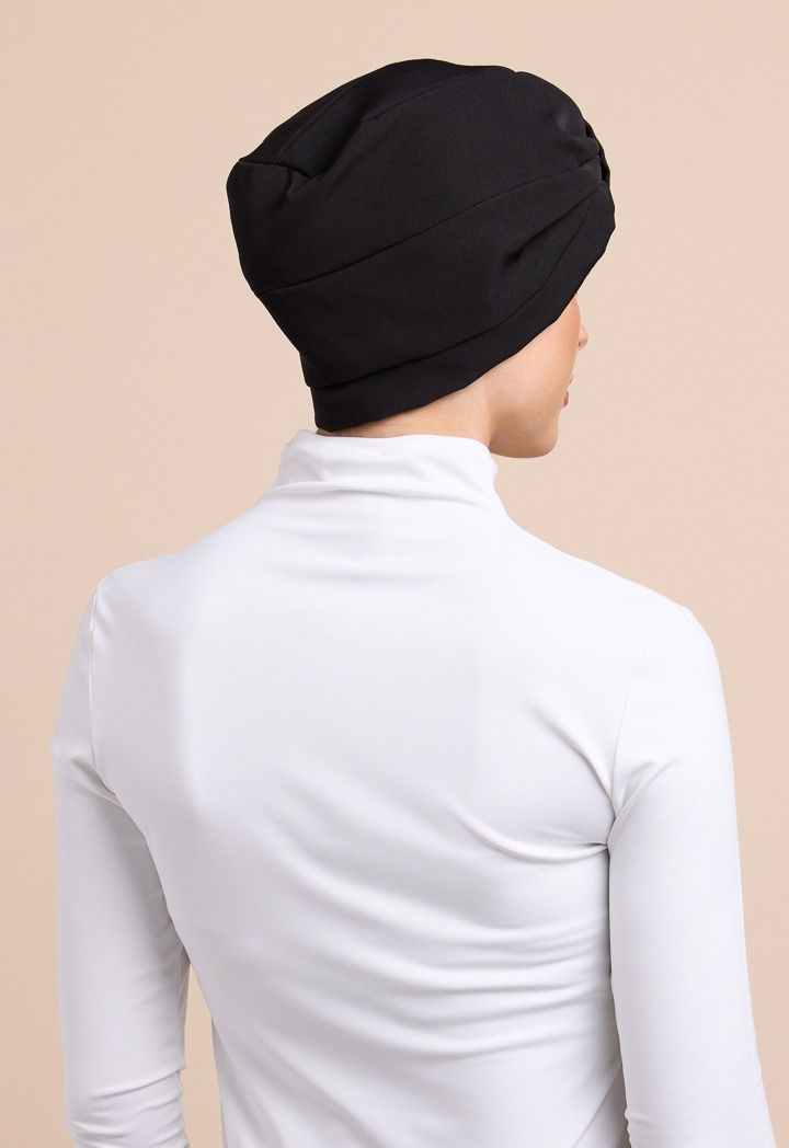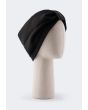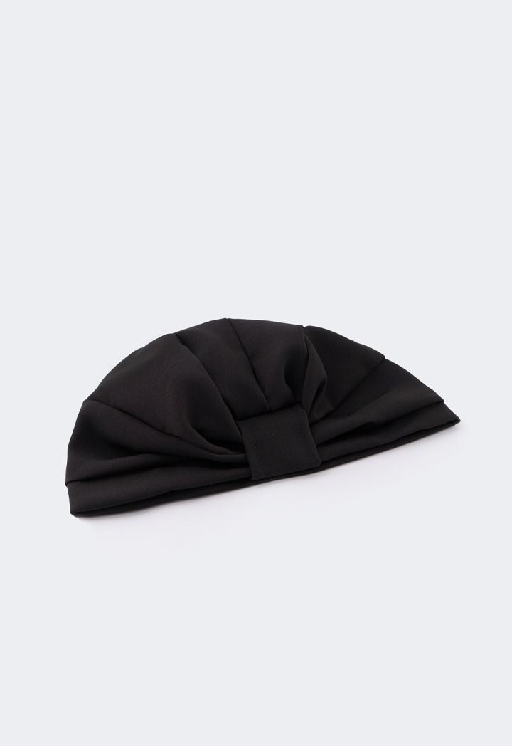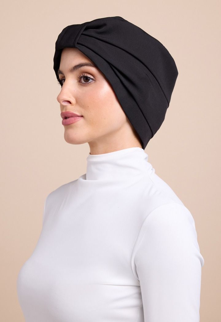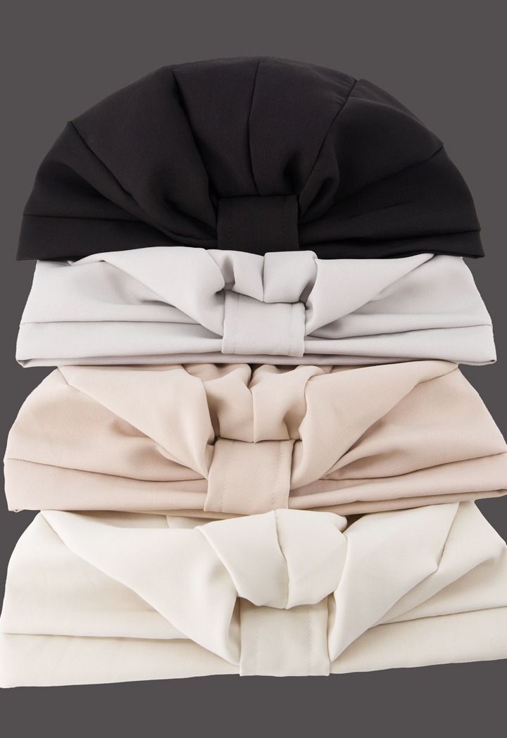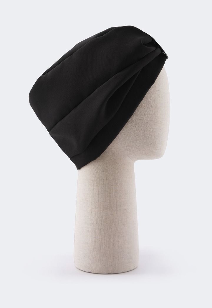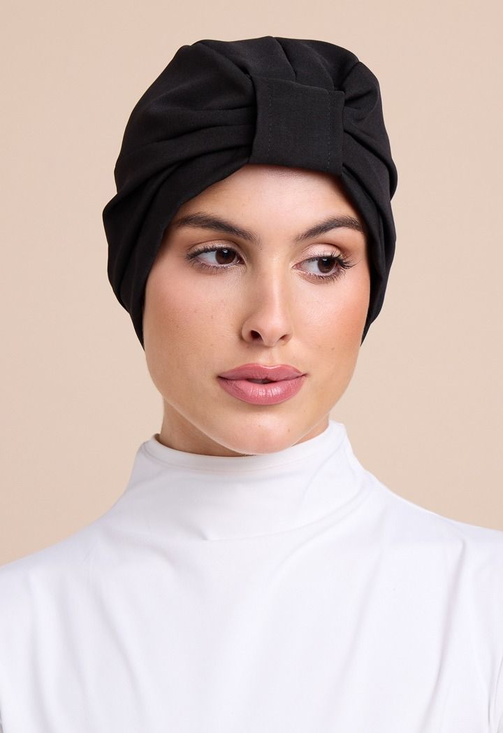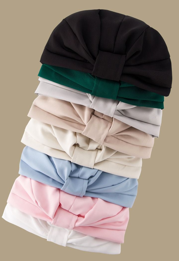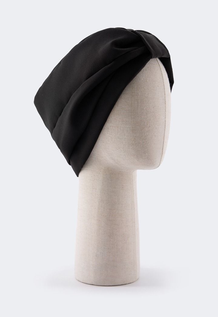This turban features a solid design with a stylish knot, offering a simple yet elegant look.