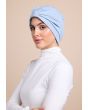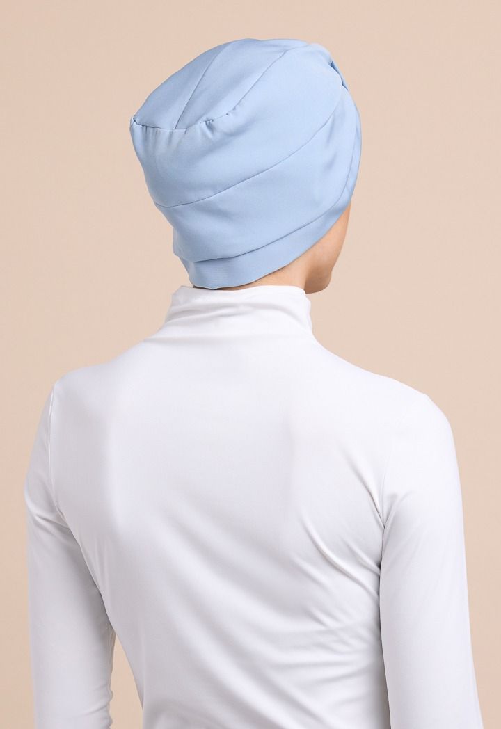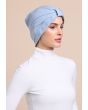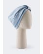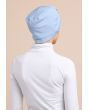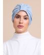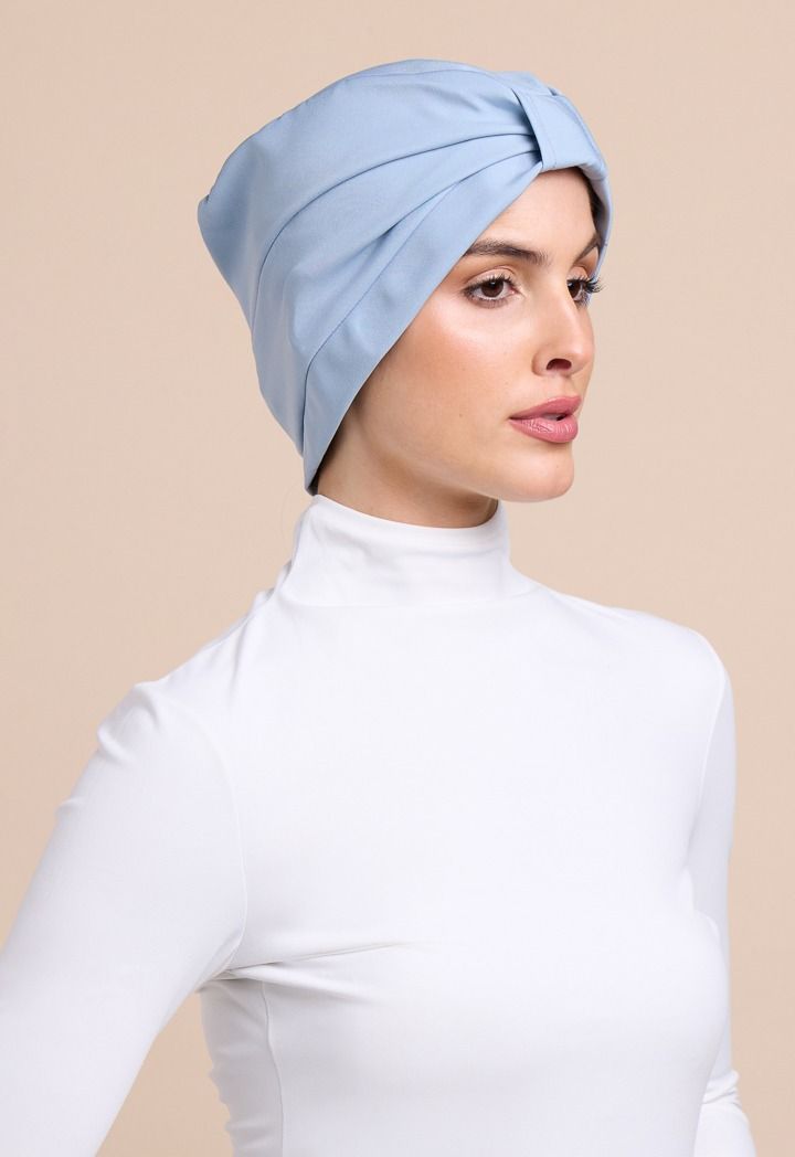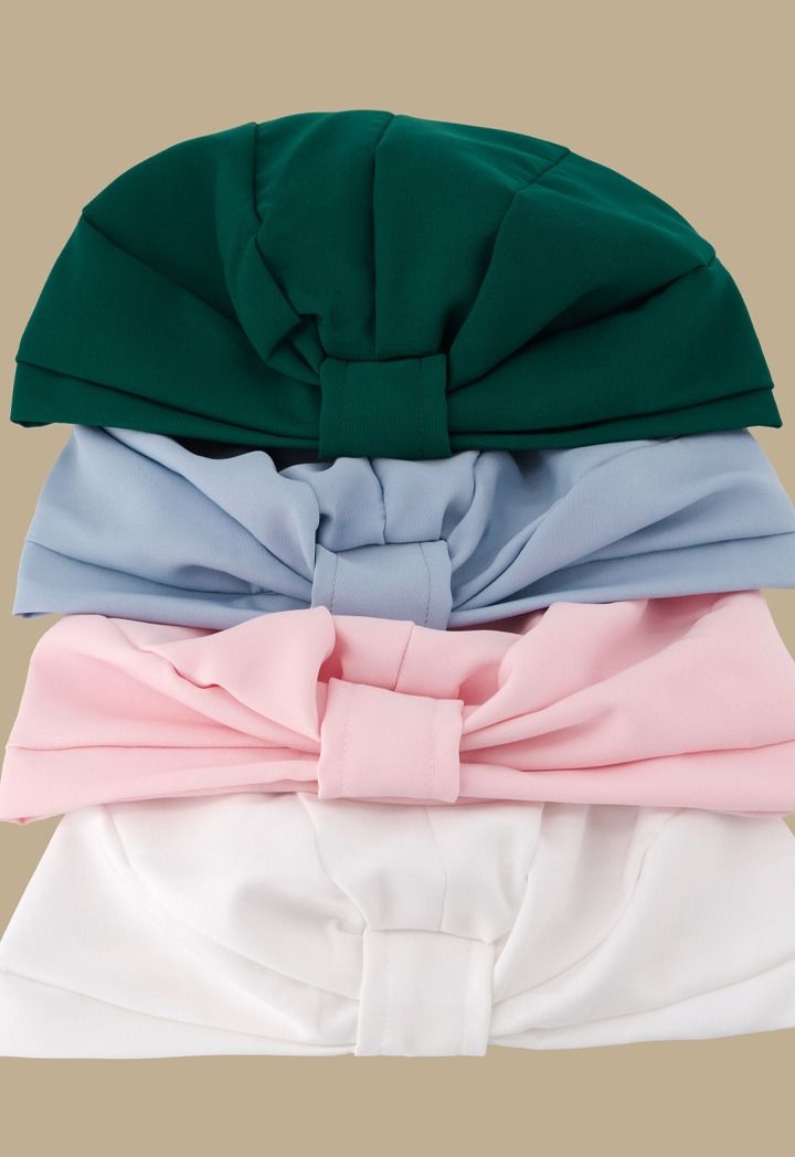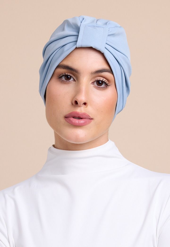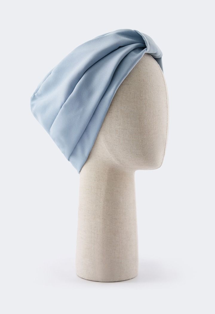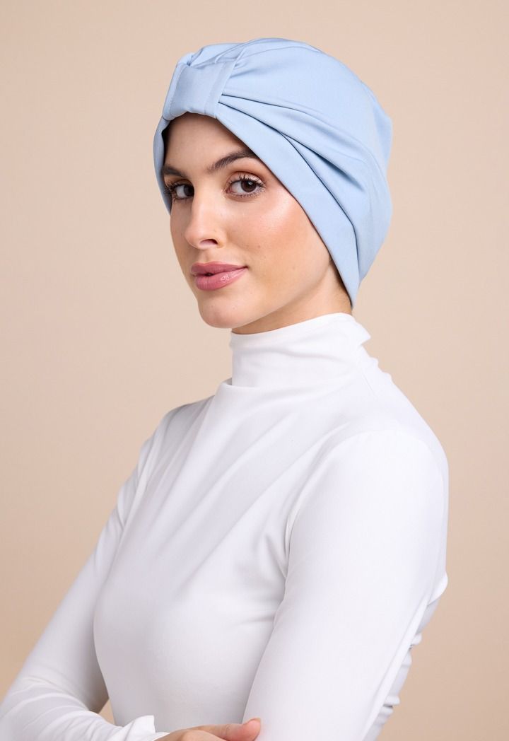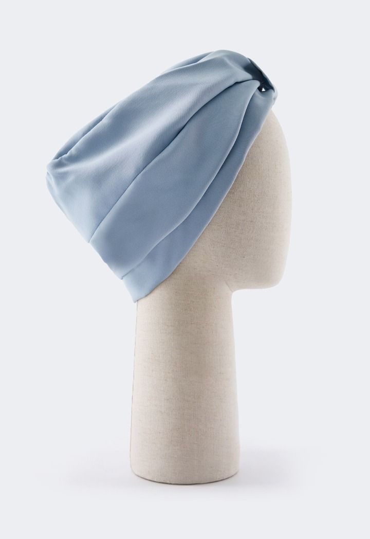 This turban features a solid design with a stylish knot, offering a simple yet elegant look.