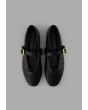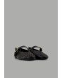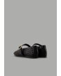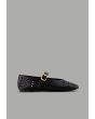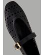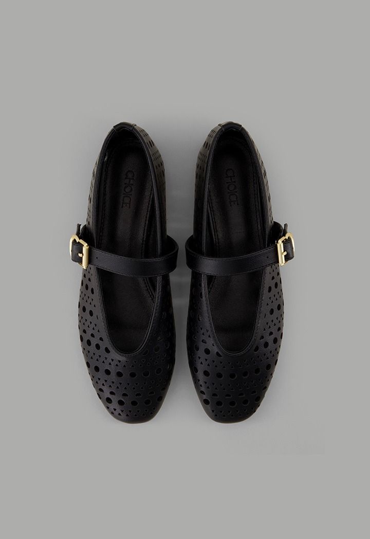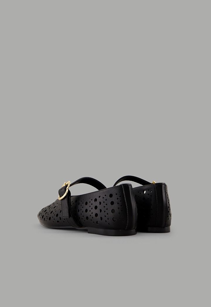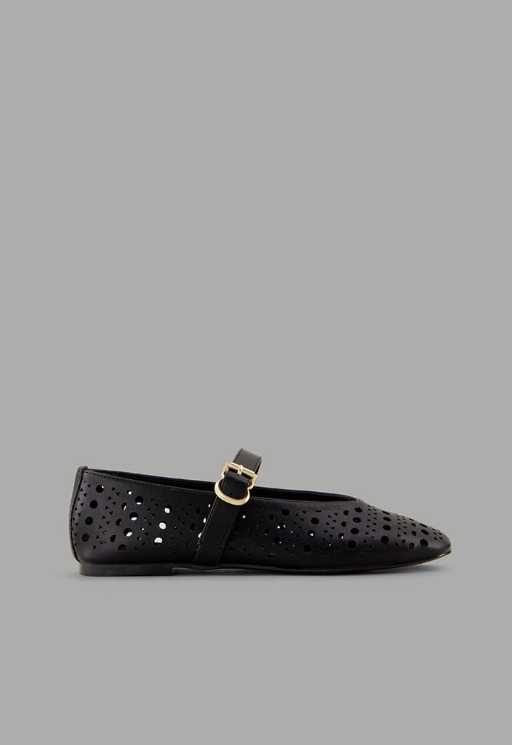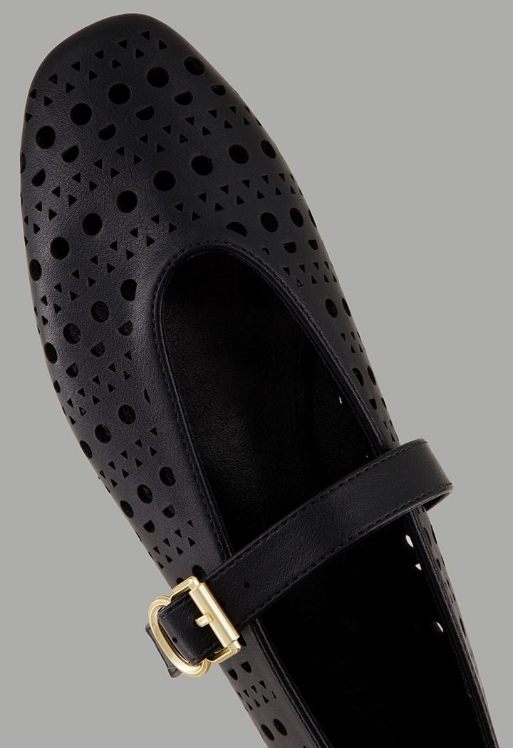 A plain, flat ballet shoe featuring laser-cut details, crafted from faux leather and designed with a buckle-strap closure.