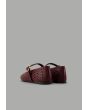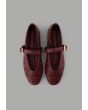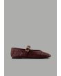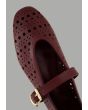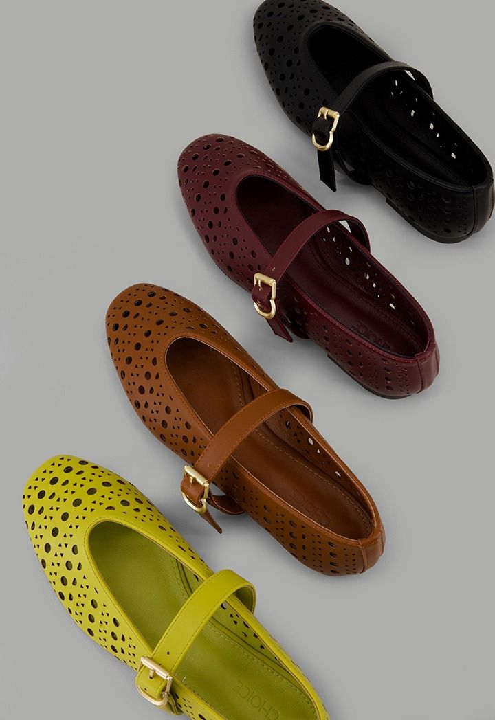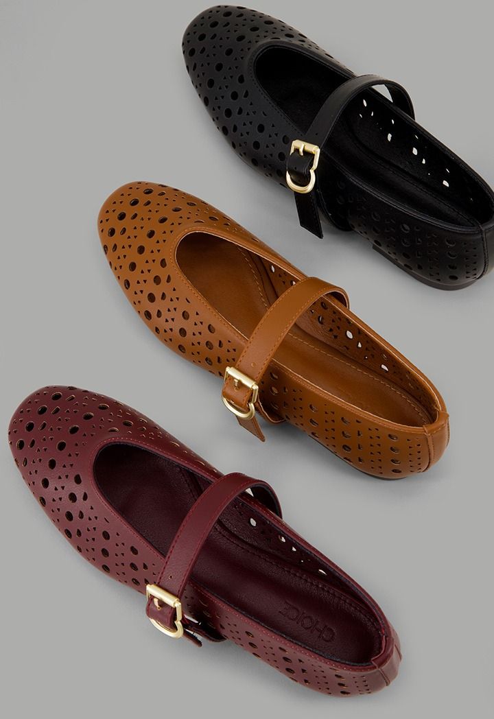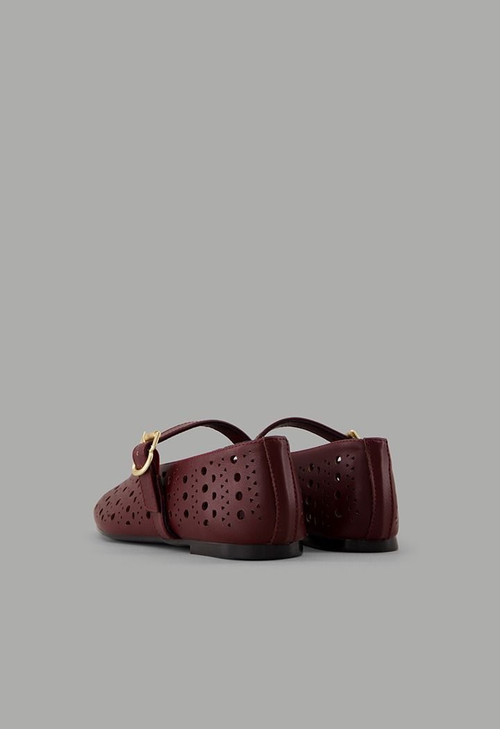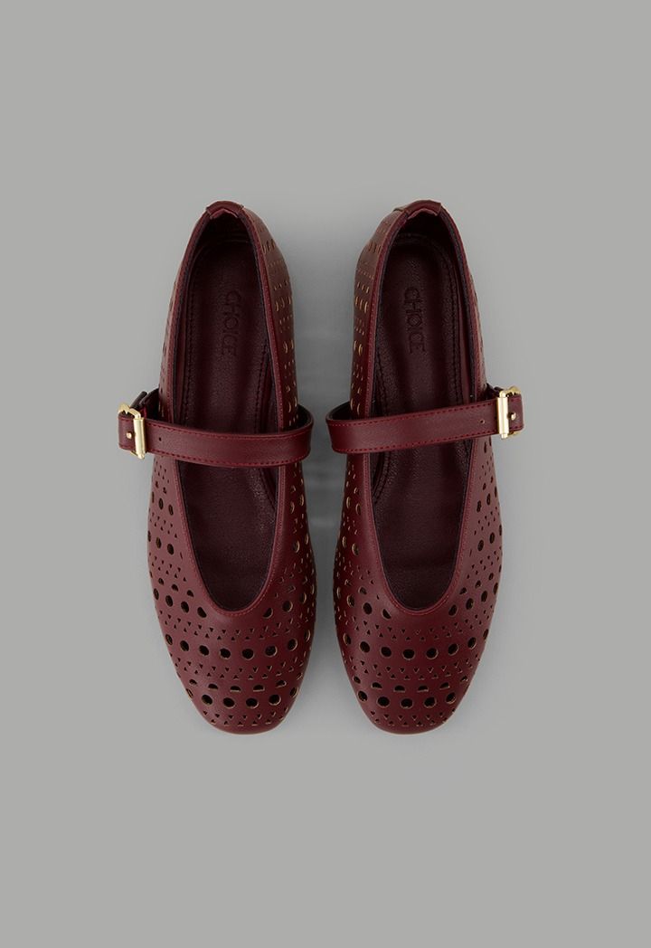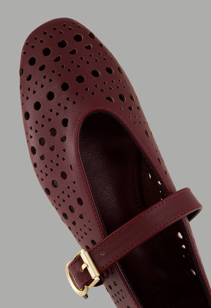 A plain, flat ballet shoe featuring laser-cut details, crafted from faux leather and designed with a buckle-strap closure.