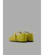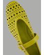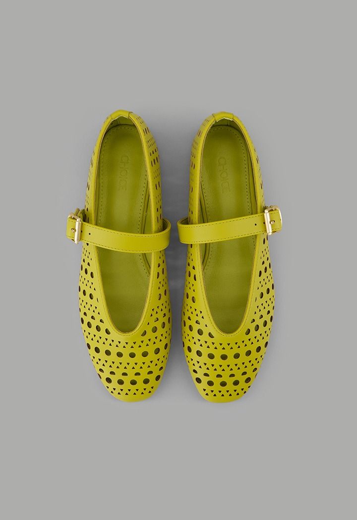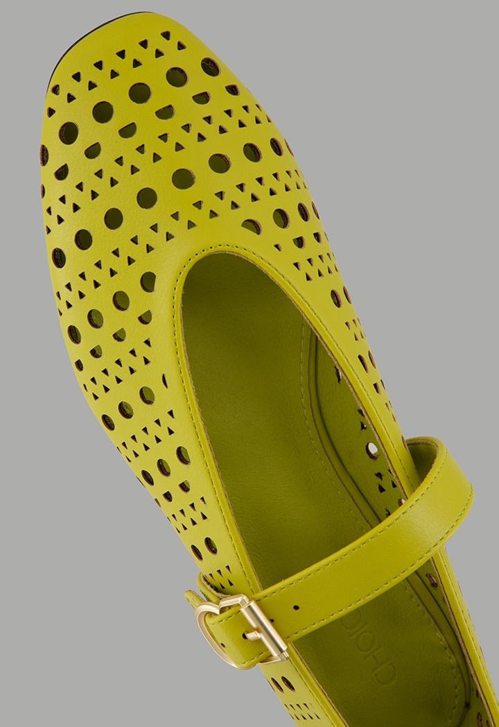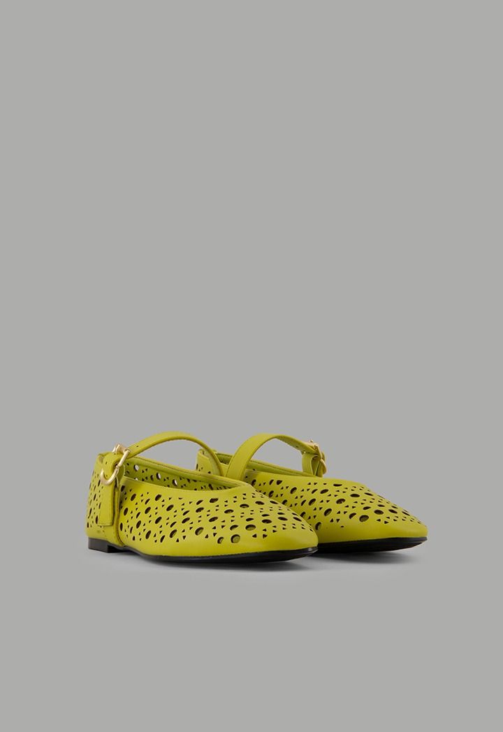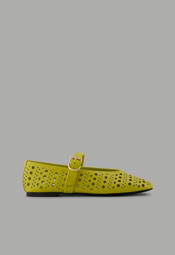 A plain, flat ballet shoe featuring laser-cut details, crafted from faux leather and designed with a buckle-strap closure.