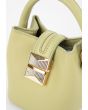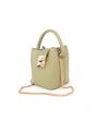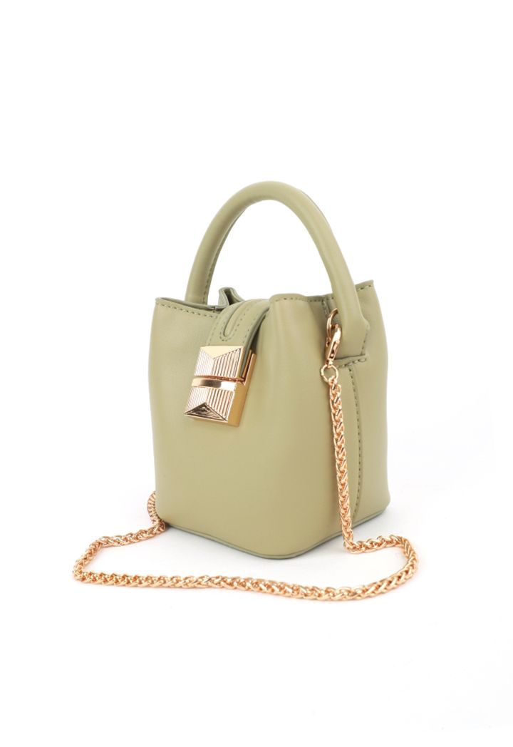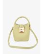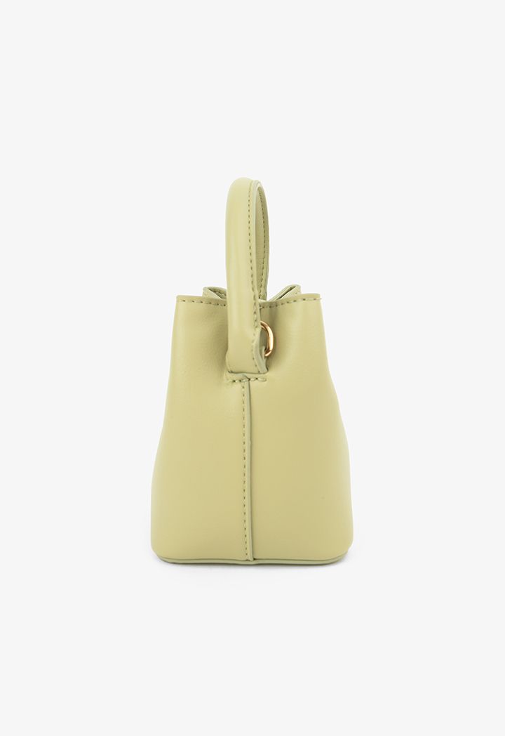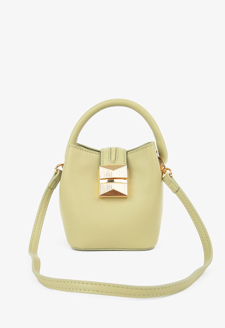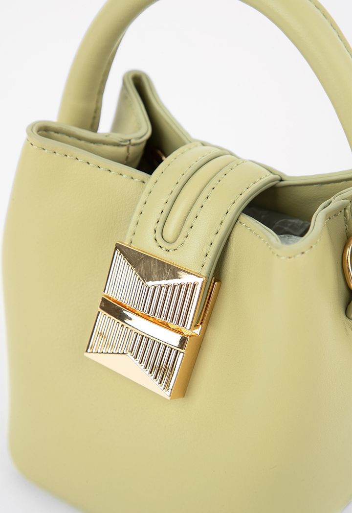 A mini bucket bag that features a classic design with a metallic magnetic button and a shoulder strap.