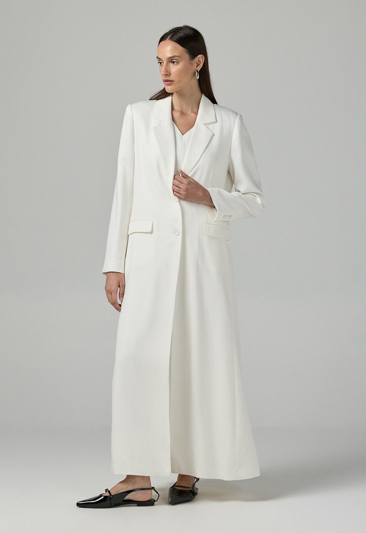 Design: Solid, Front Flap Pockets, Back Slit Hem, Attached Lining