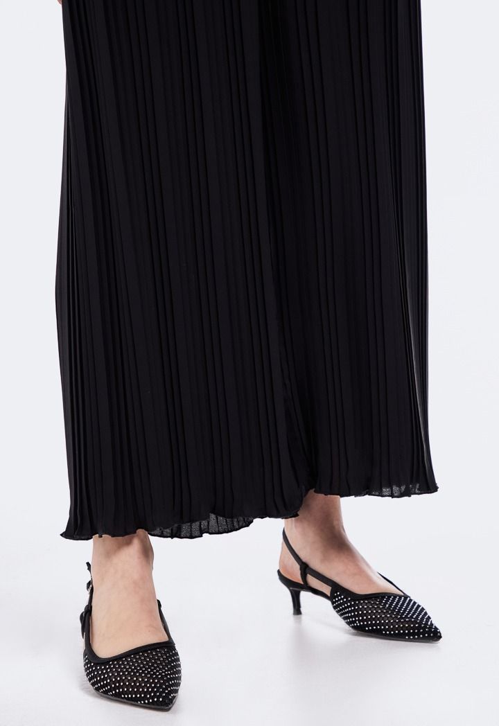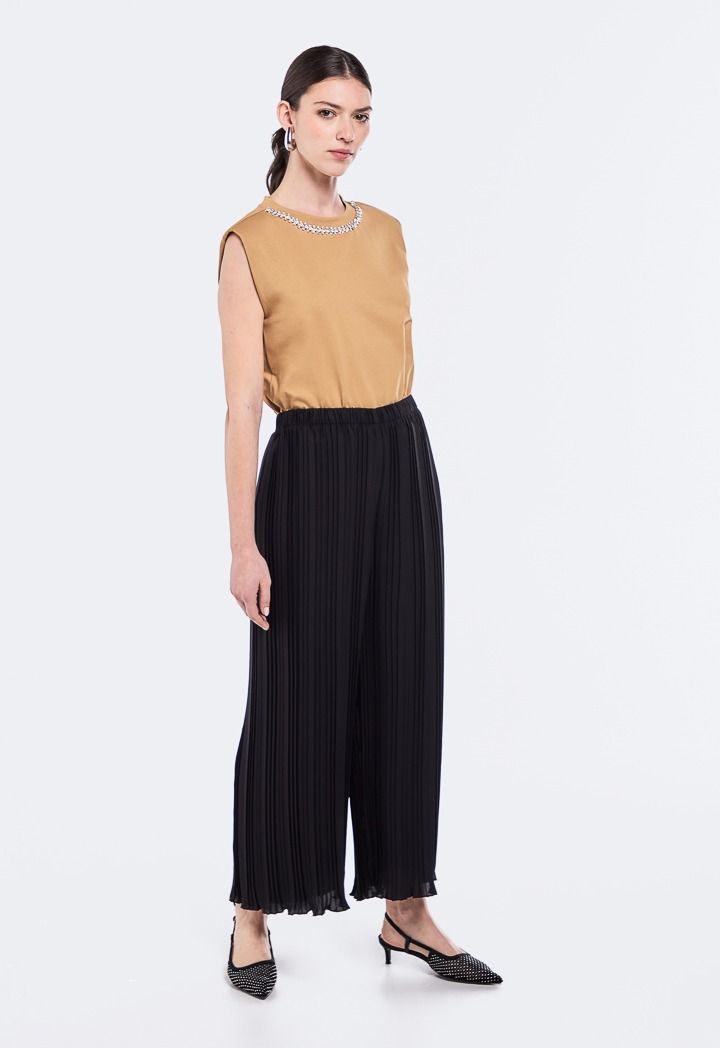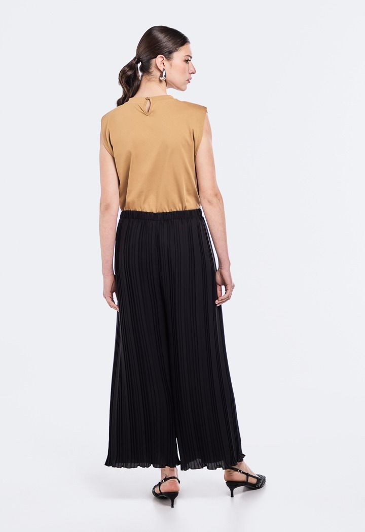 Chic Solid Pleated Trouser. It features High Waist and Wide Legs.