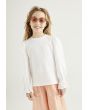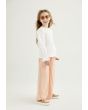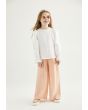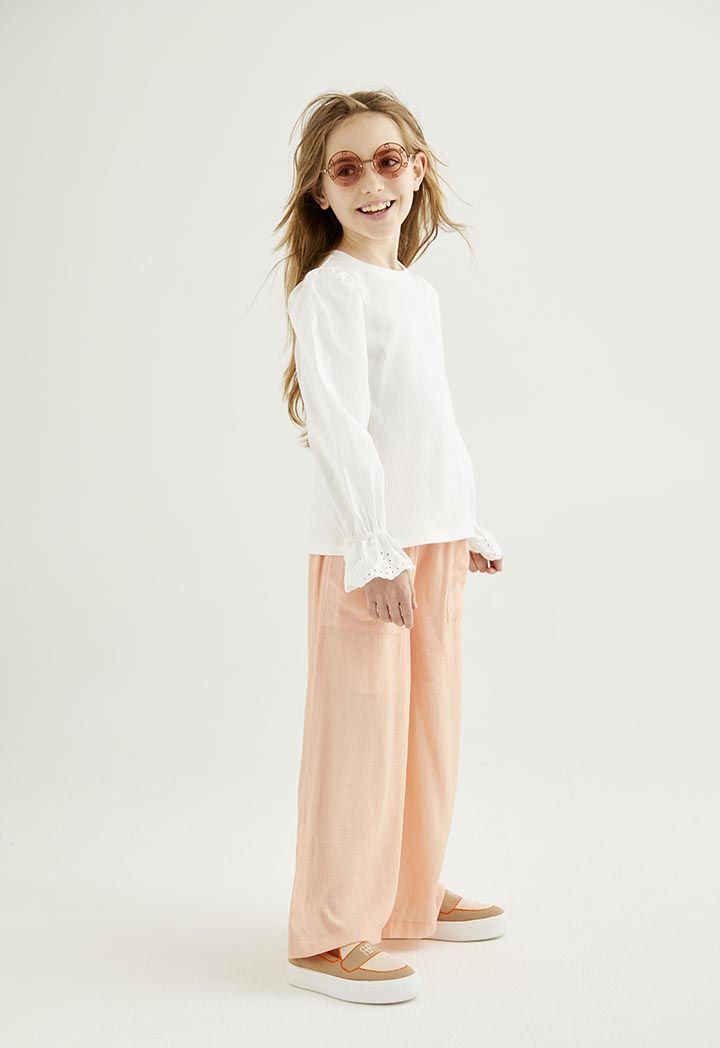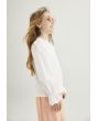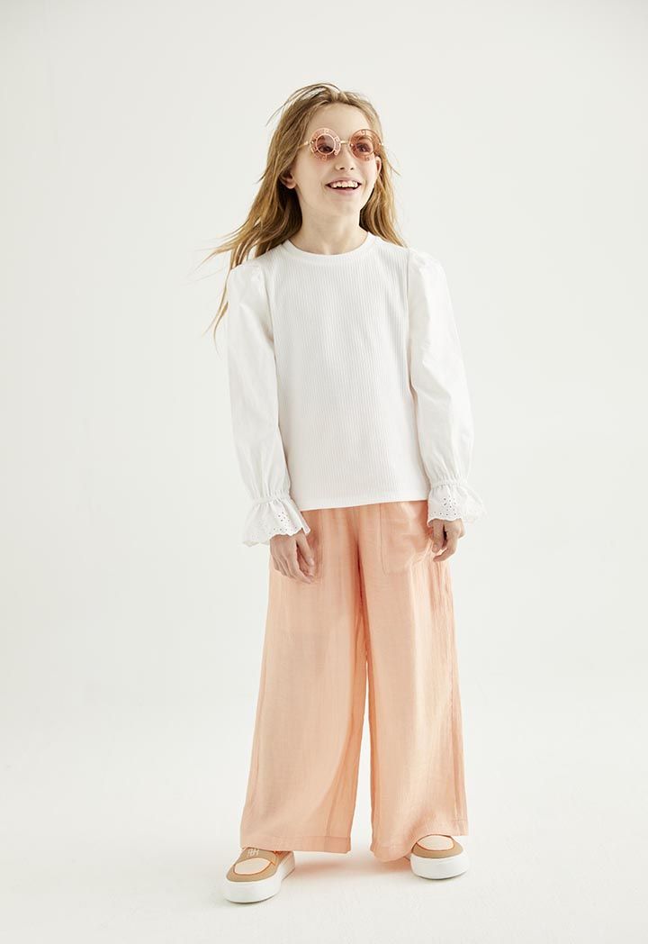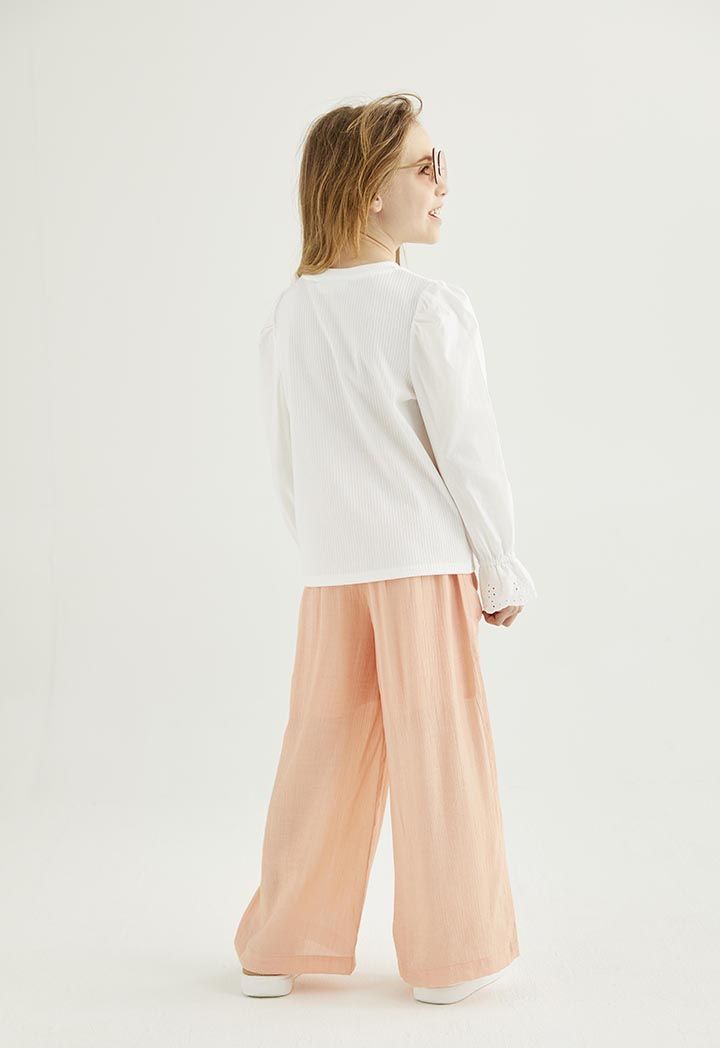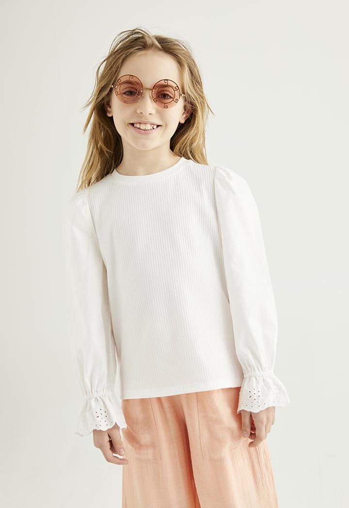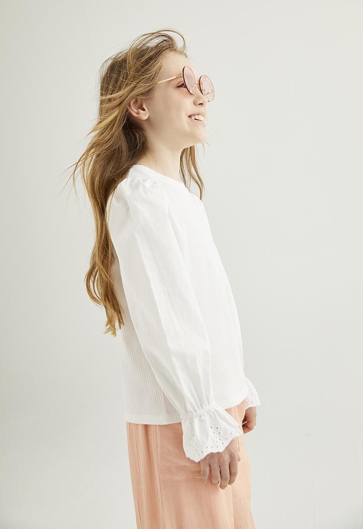 An elegant choice of a blouse featuring a solid design and schiffli long sleeves.