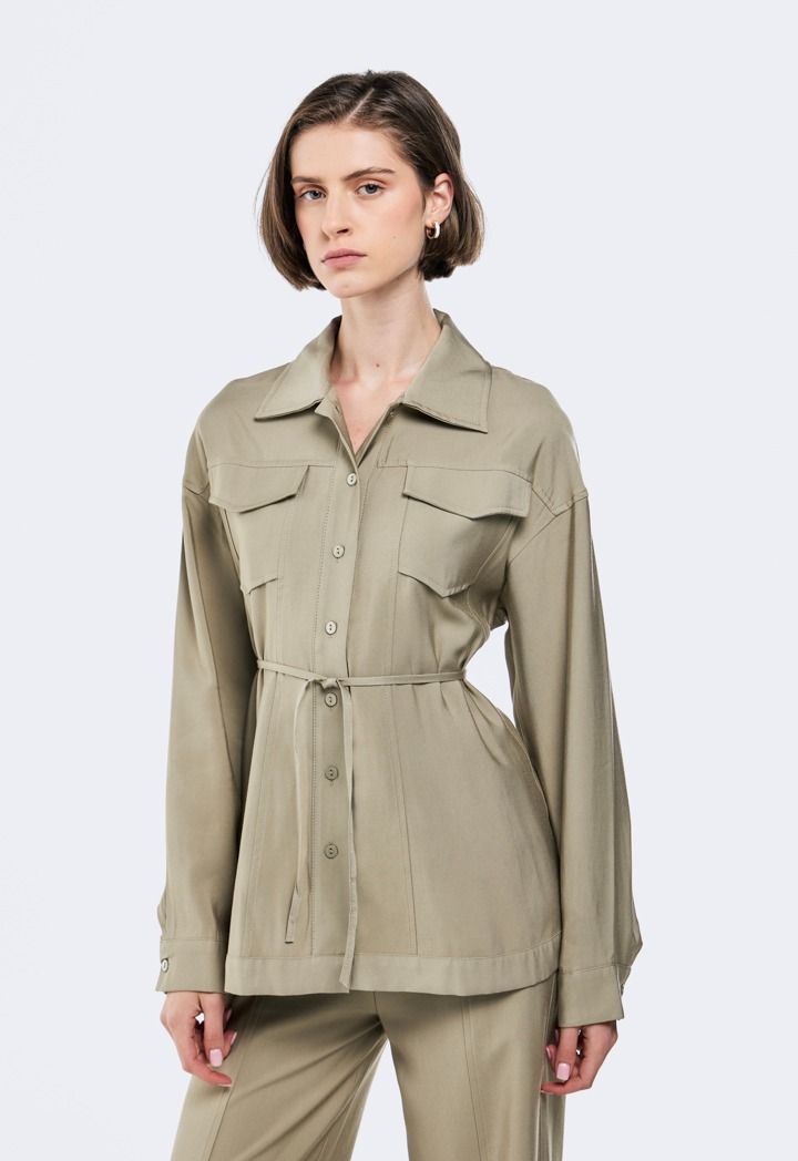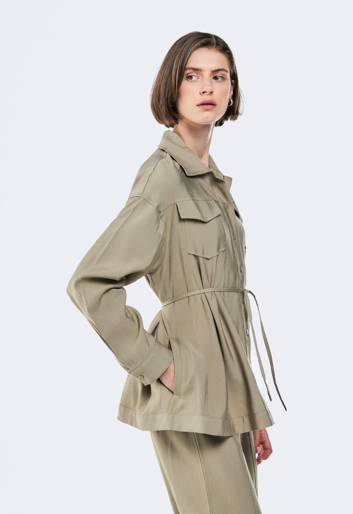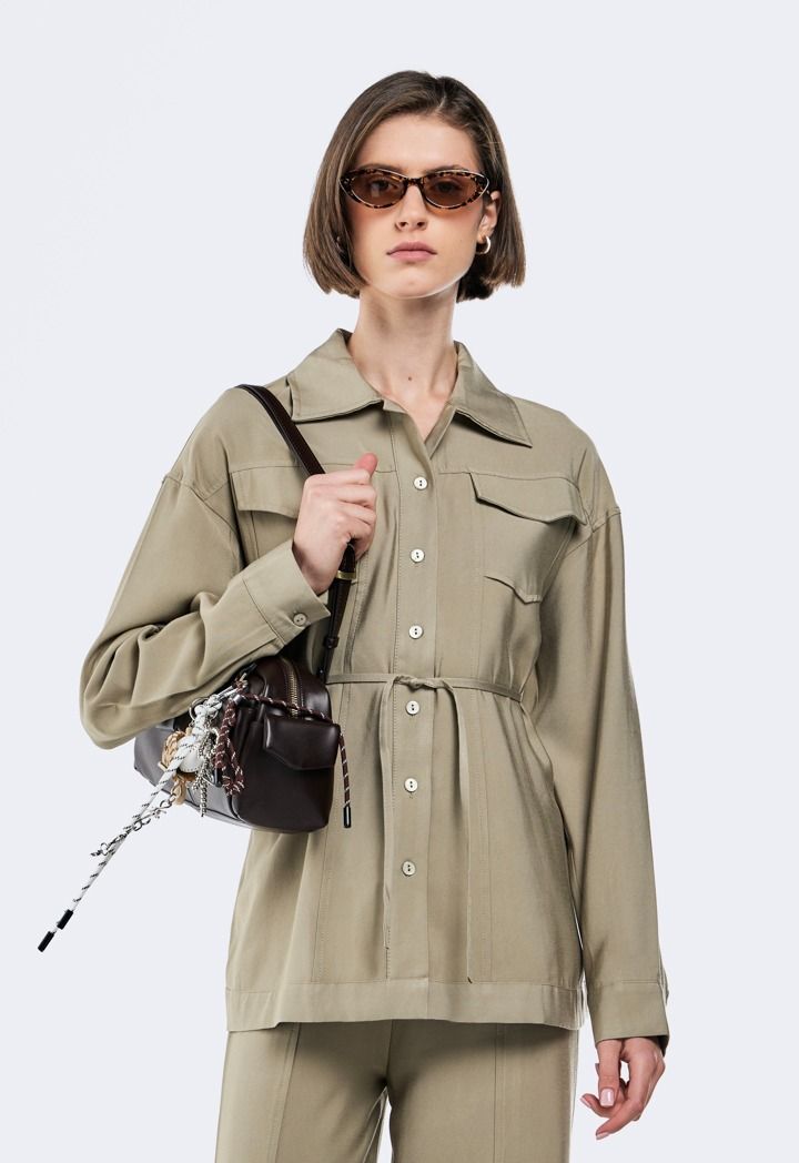 Design: Faux Flap Pockets, Side Pockets, Attached Tie, Solid